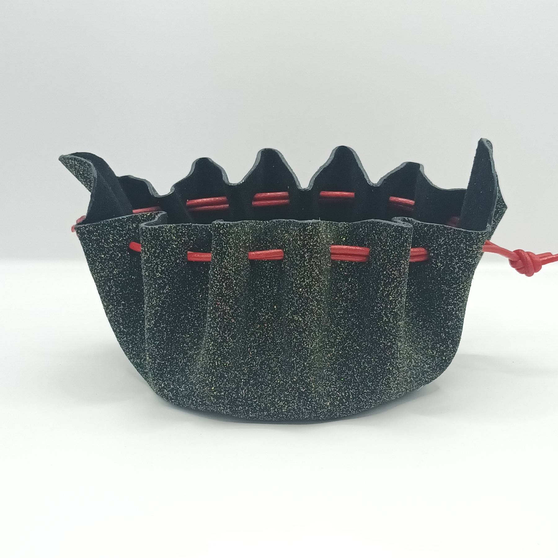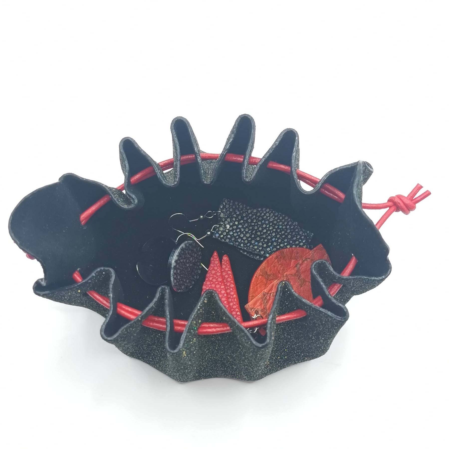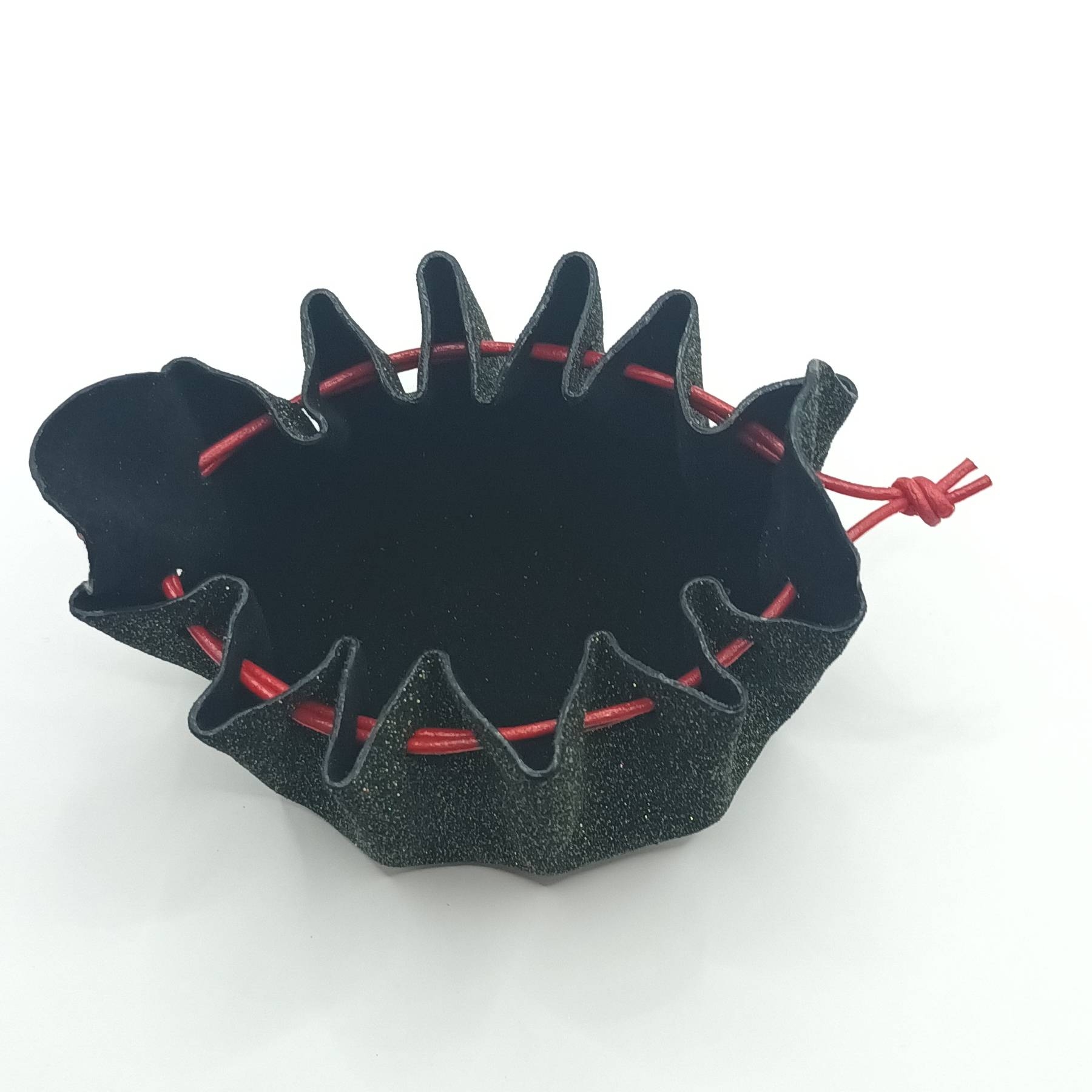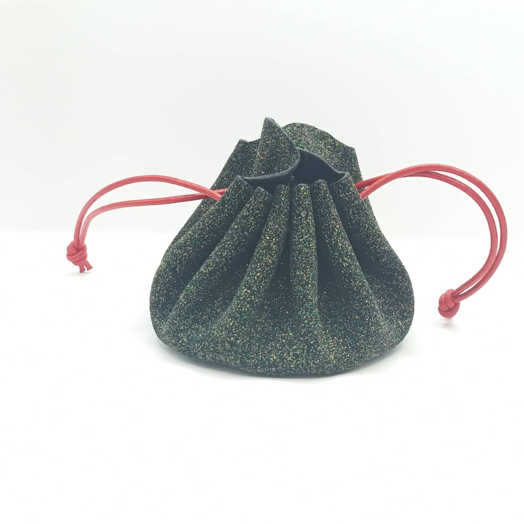 Cette bourse est entièrement réalisée à la main et fabriquée à partir de chutes de cuir d'agneau et le cordon est en cuir de vachette. Elle mesure 8 cm de diamètre et 8 cm de hauteur. Elle s’ouvre simplement en tirant sur les «oreilles» et se ferme en tirant sur les liens. Vous pouvez aussi fermer la bourse en faisant un nœud avec les liens par dessus les «oreilles» pour plus de sécurité. *La couleur réelle peut légèrement varier selon la luminosité et le contraste de votre écran