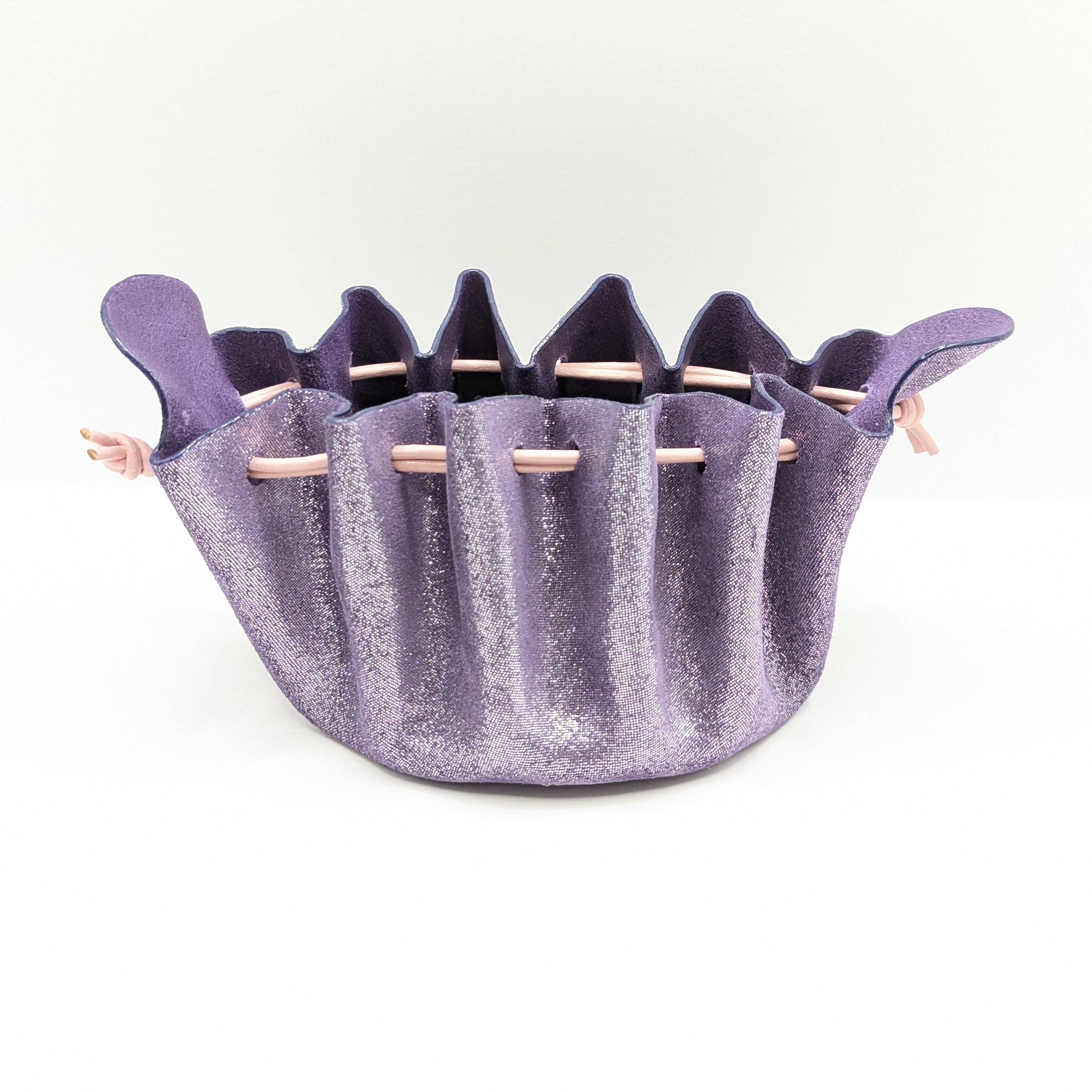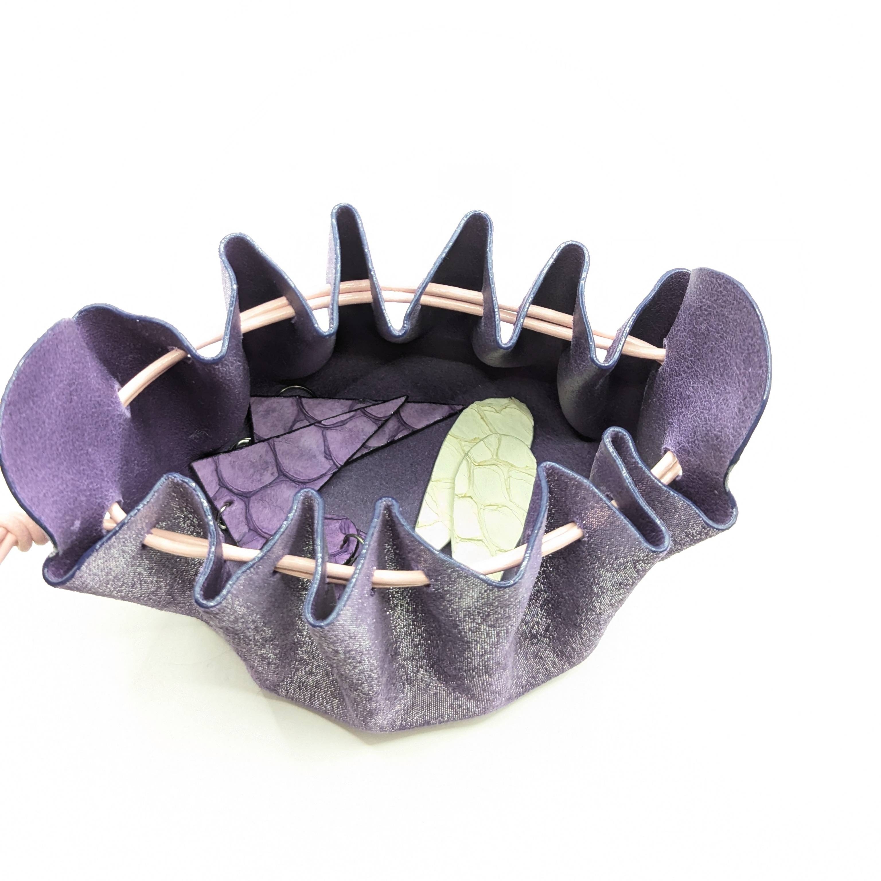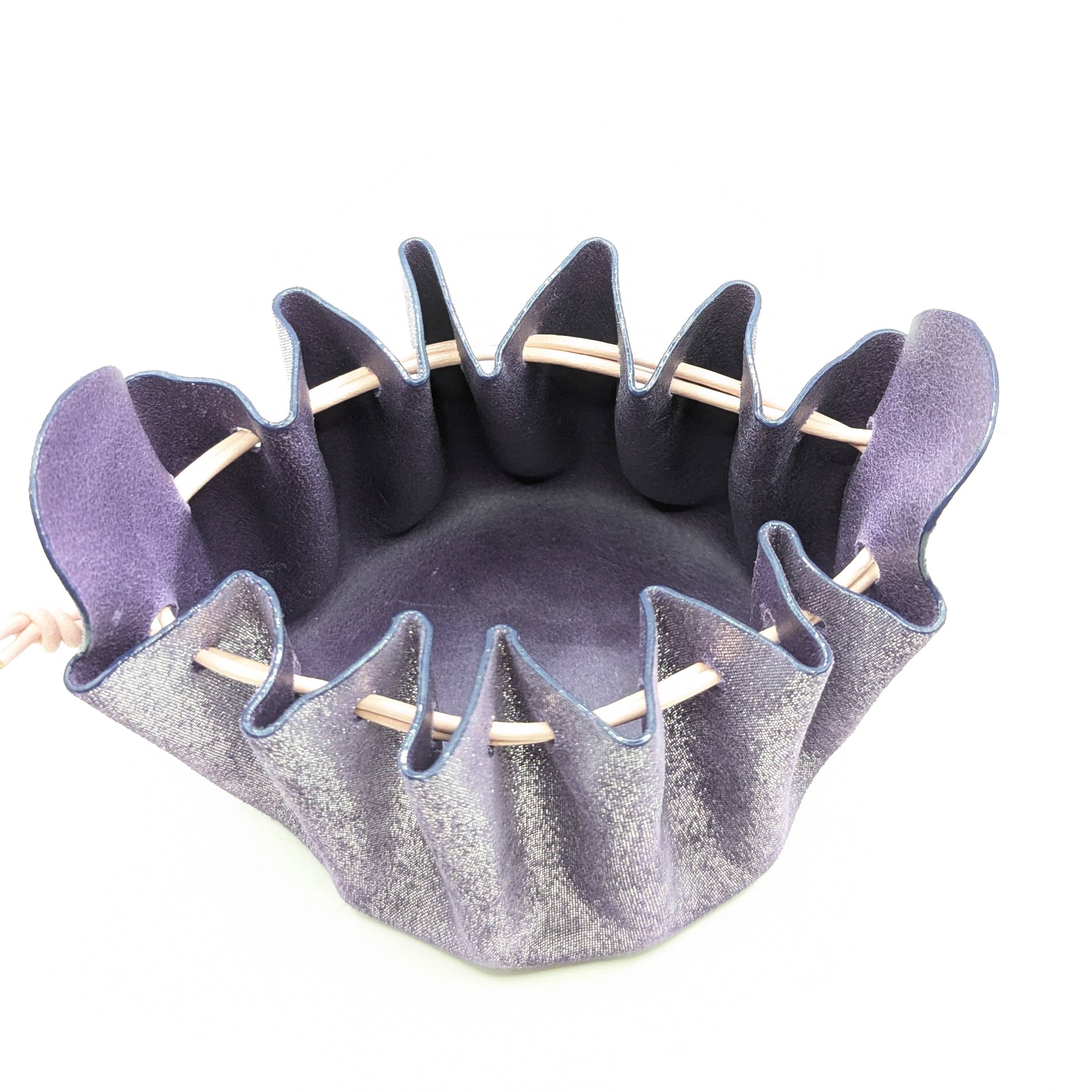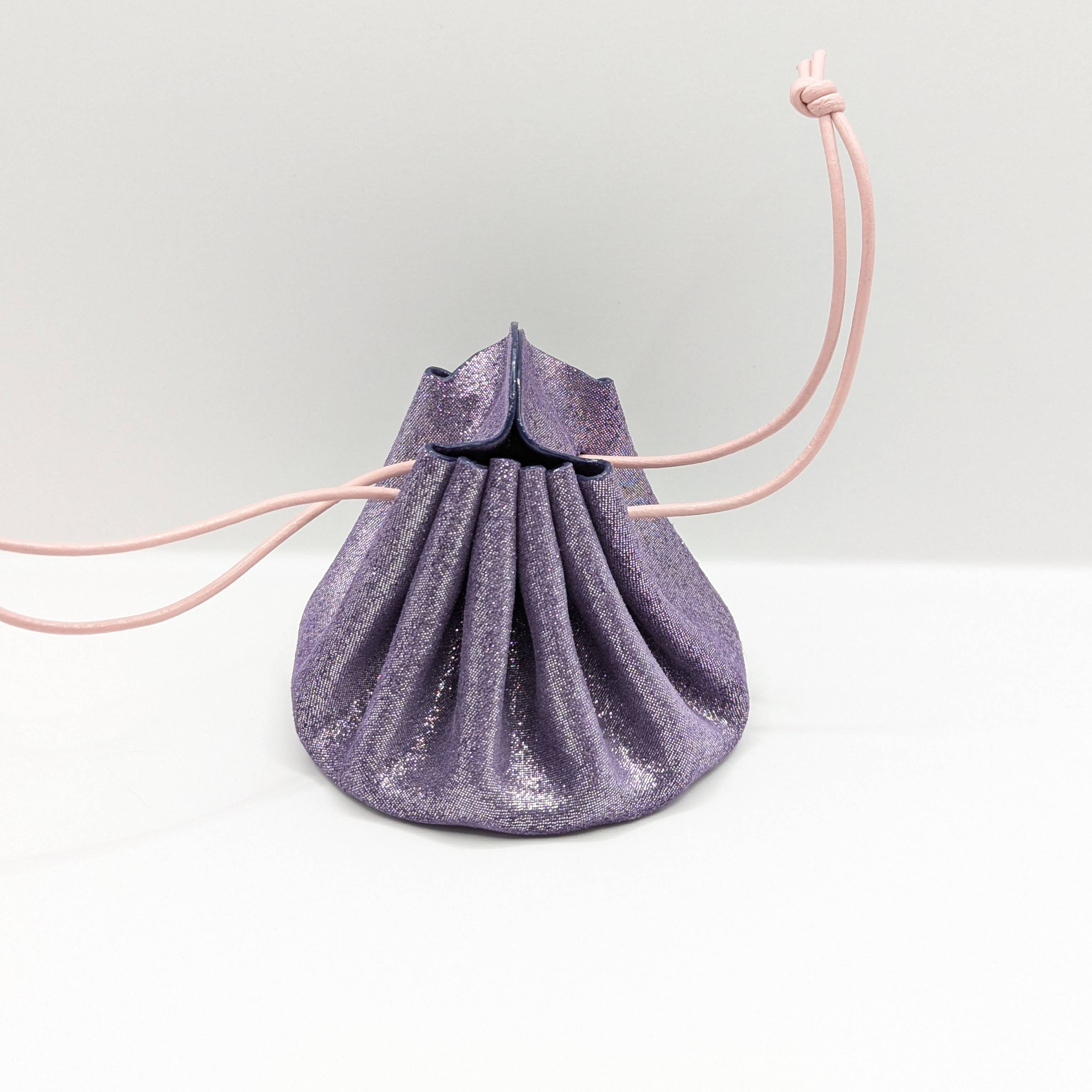 Cette bourse est entièrement réalisée à la main et fabriquée à partir de chutes de cuir d'agneau et le cordon est en cuir de vachette. Elle mesure 8 cm de diamètre et 8 cm de hauteur. Elle s’ouvre simplement en tirant sur les «oreilles» et se ferme en tirant sur les liens. Vous pouvez aussi fermer la bourse en faisant un nœud avec les liens par dessus les «oreilles» pour plus de sécurité. *La couleur réelle peut légèrement varier selon la luminosité et le contraste de votre écran