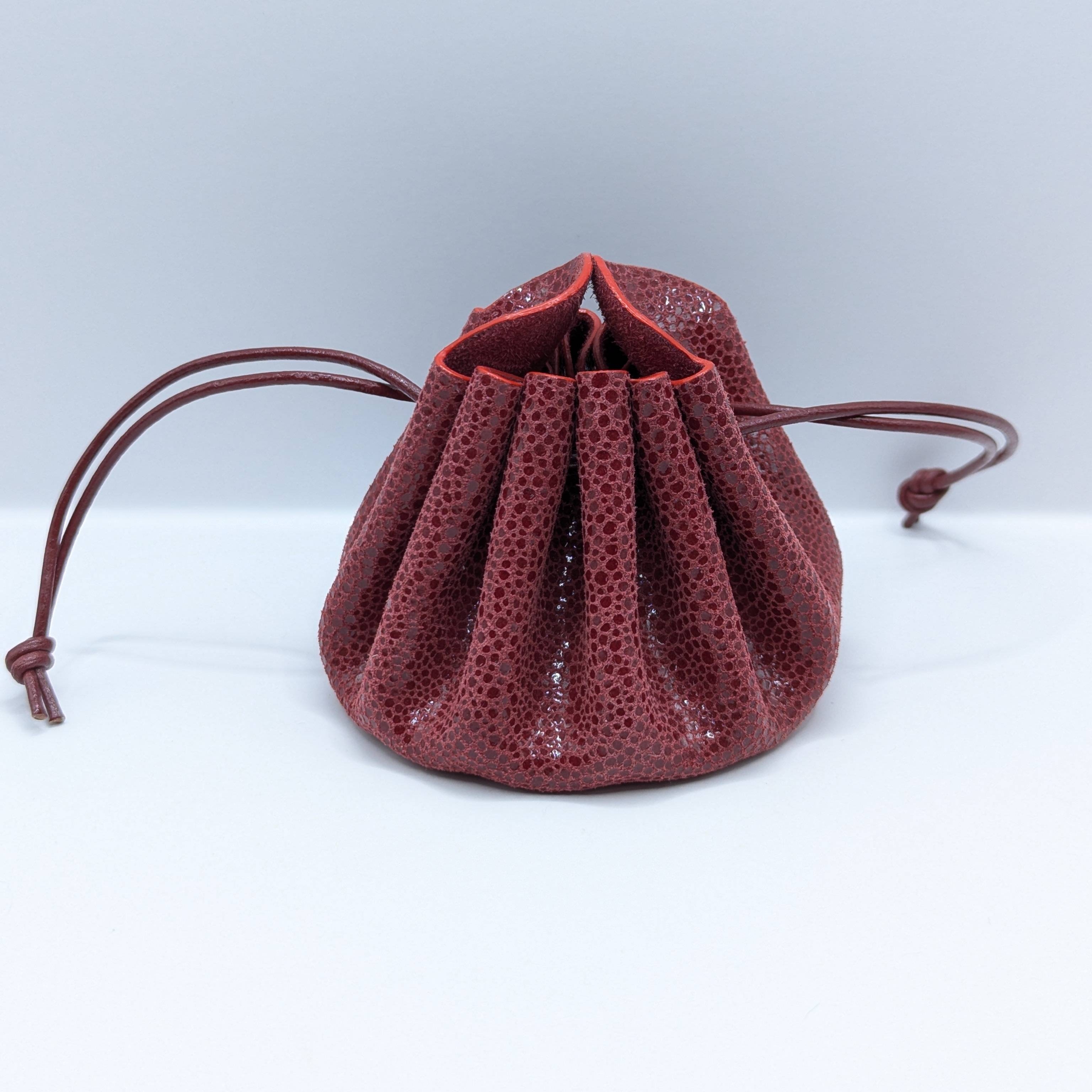 Cette bourse est entièrement réalisée à la main et fabriquée à partir de chutes de cuir d'agneau et le cordon est en cuir de vachette. Elle mesure 8 cm de diamètre et 8 cm de hauteur. Elle s’ouvre simplement en tirant sur les «oreilles» et se ferme en tirant sur les liens. Vous pouvez aussi fermer la bourse en faisant un nœud avec les liens par dessus les «oreilles» pour plus de sécurité. *La couleur réelle peut légèrement varier selon la luminosité et le contraste de votre écran