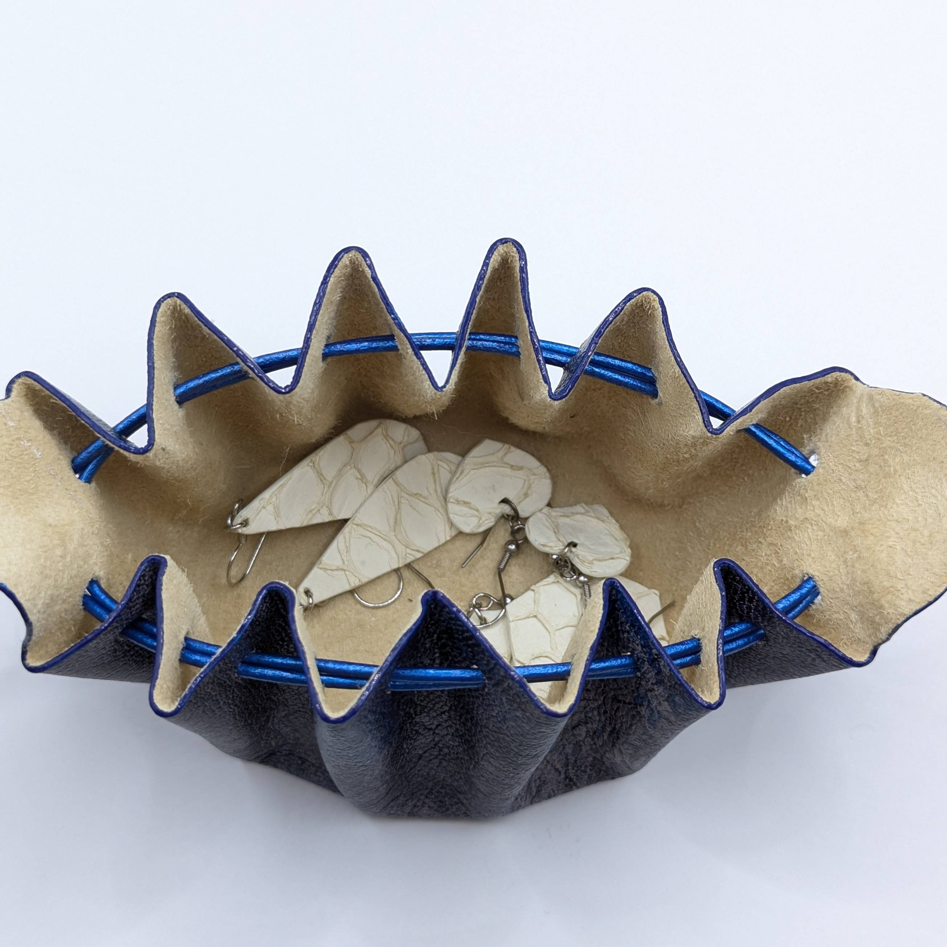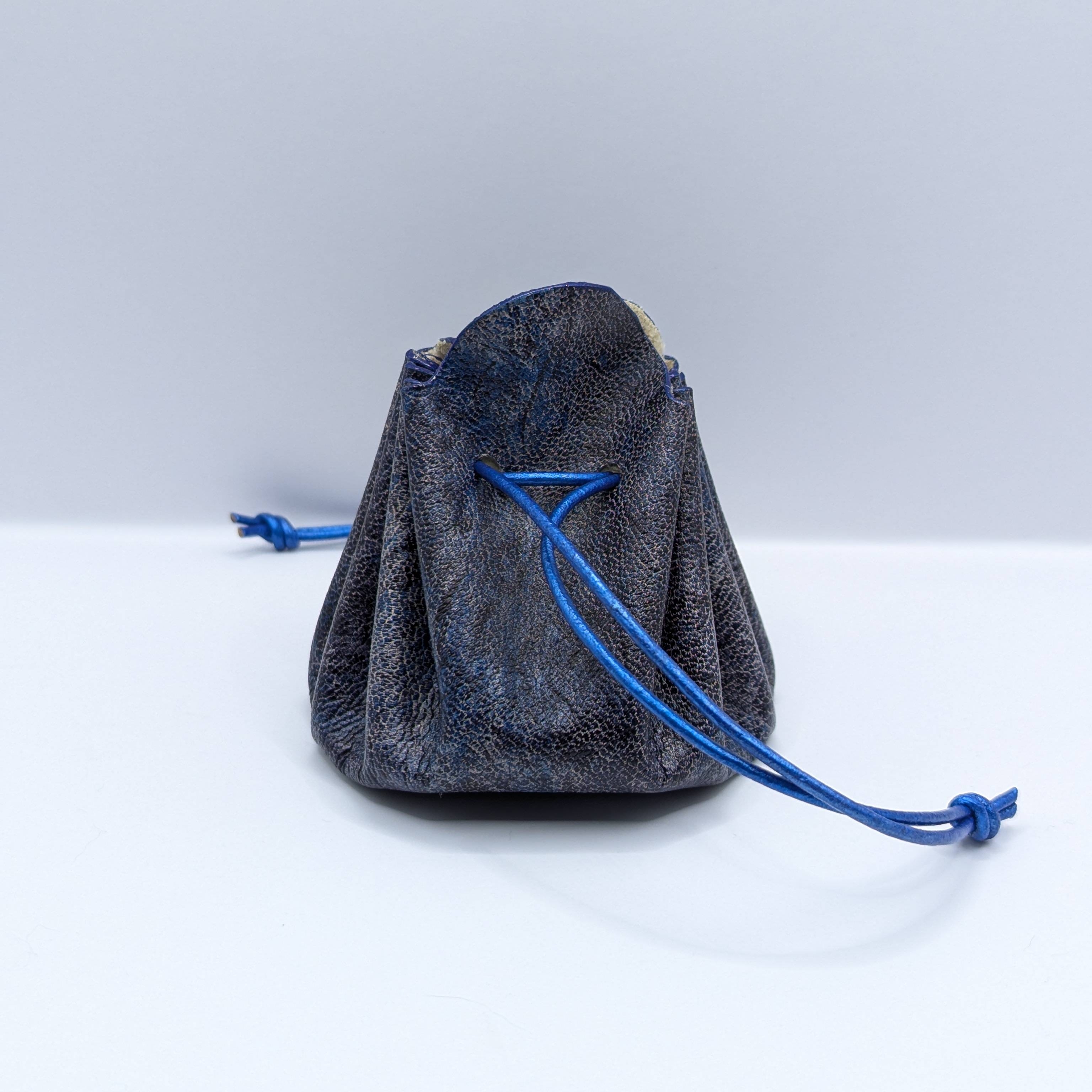 Cette bourse est entièrement réalisée à la main et fabriquée à partir de chutes de cuir d'agneau et le cordon est en cuir de vachette. Elle mesure 8 cm de diamètre et 8 cm de hauteur. Elle s’ouvre simplement en tirant sur les «oreilles» et se ferme en tirant sur les liens. Vous pouvez aussi fermer la bourse en faisant un nœud avec les liens par dessus les «oreilles» pour plus de sécurité. *La couleur réelle peut légèrement varier selon la luminosité et le contraste de votre écran
