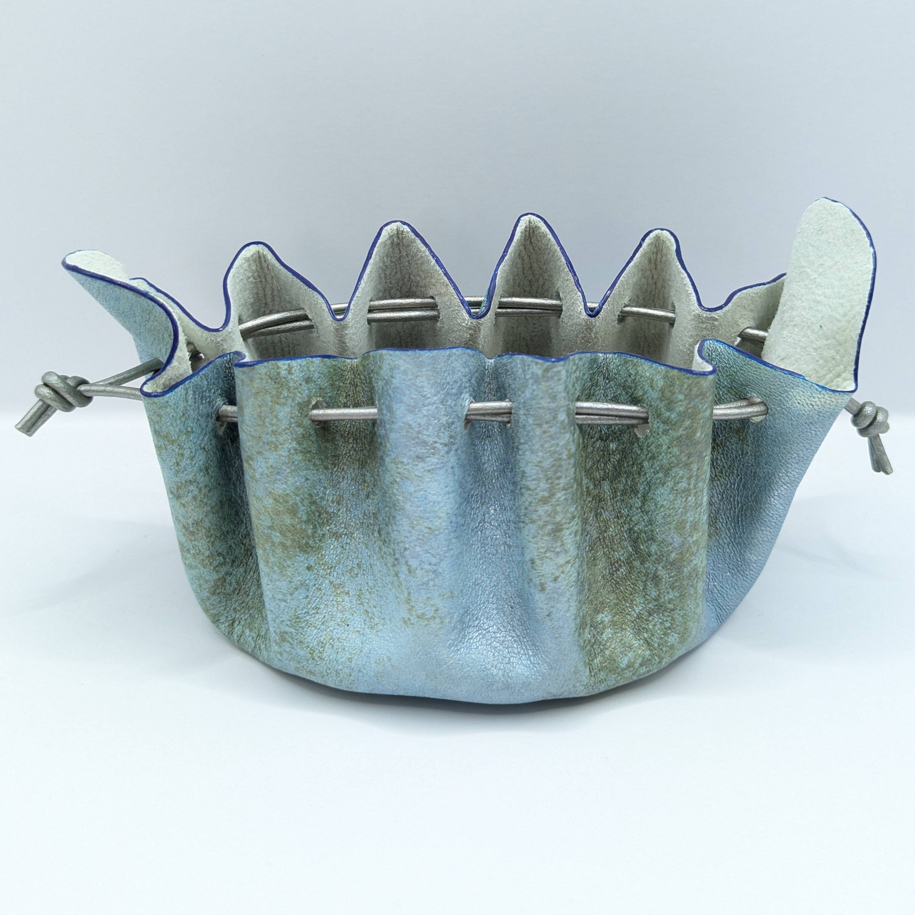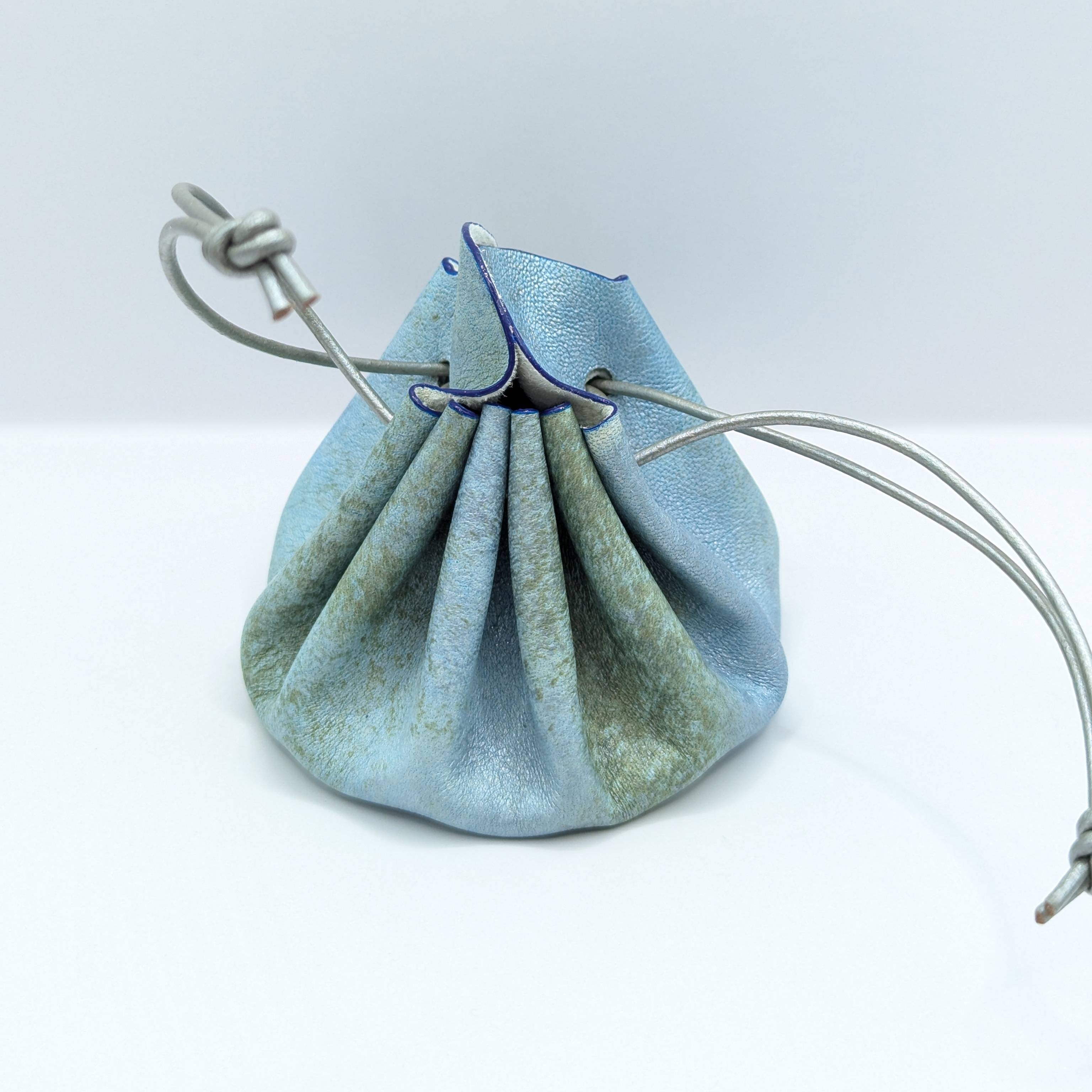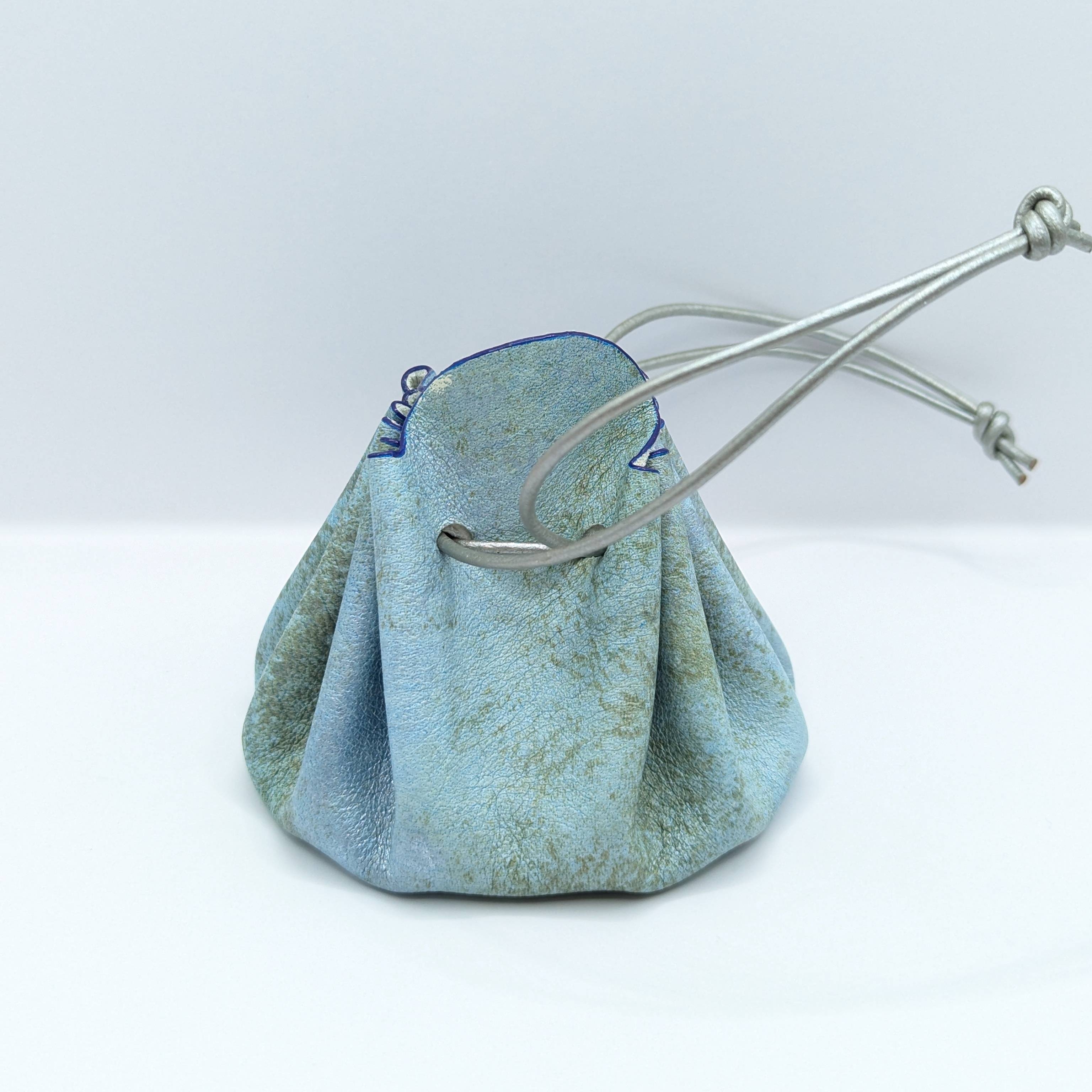 Cette bourse est entièrement réalisée à la main et fabriquée à partir de chutes de cuir d'agneau et le cordon est en cuir de vachette. Elle mesure 8 cm de diamètre et 8 cm de hauteur. Elle s’ouvre simplement en tirant sur les «oreilles» et se ferme en tirant sur les liens. Vous pouvez aussi fermer la bourse en faisant un nœud avec les liens par dessus les «oreilles» pour plus de sécurité. *La couleur réelle peut légèrement varier selon la luminosité et le contraste de votre écran