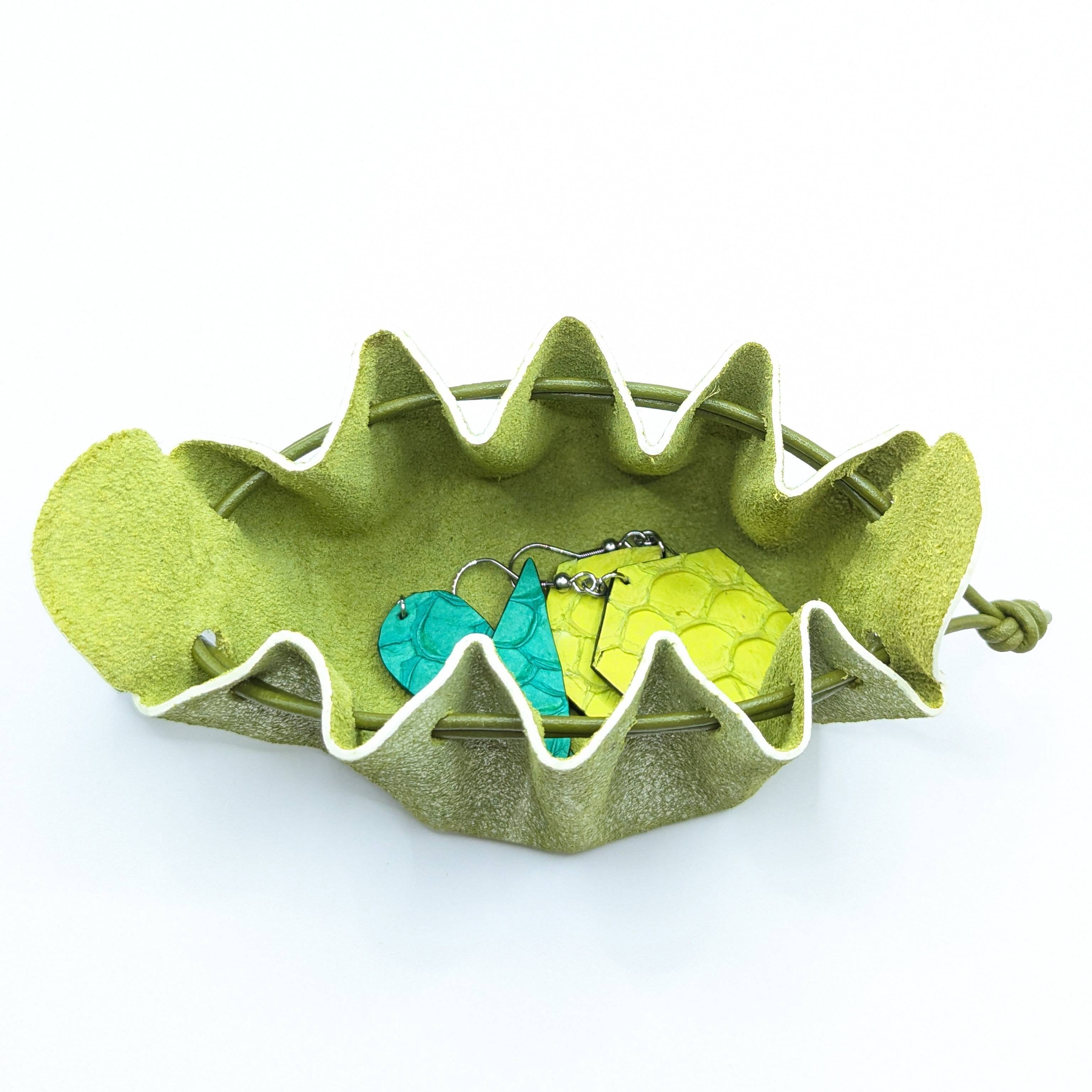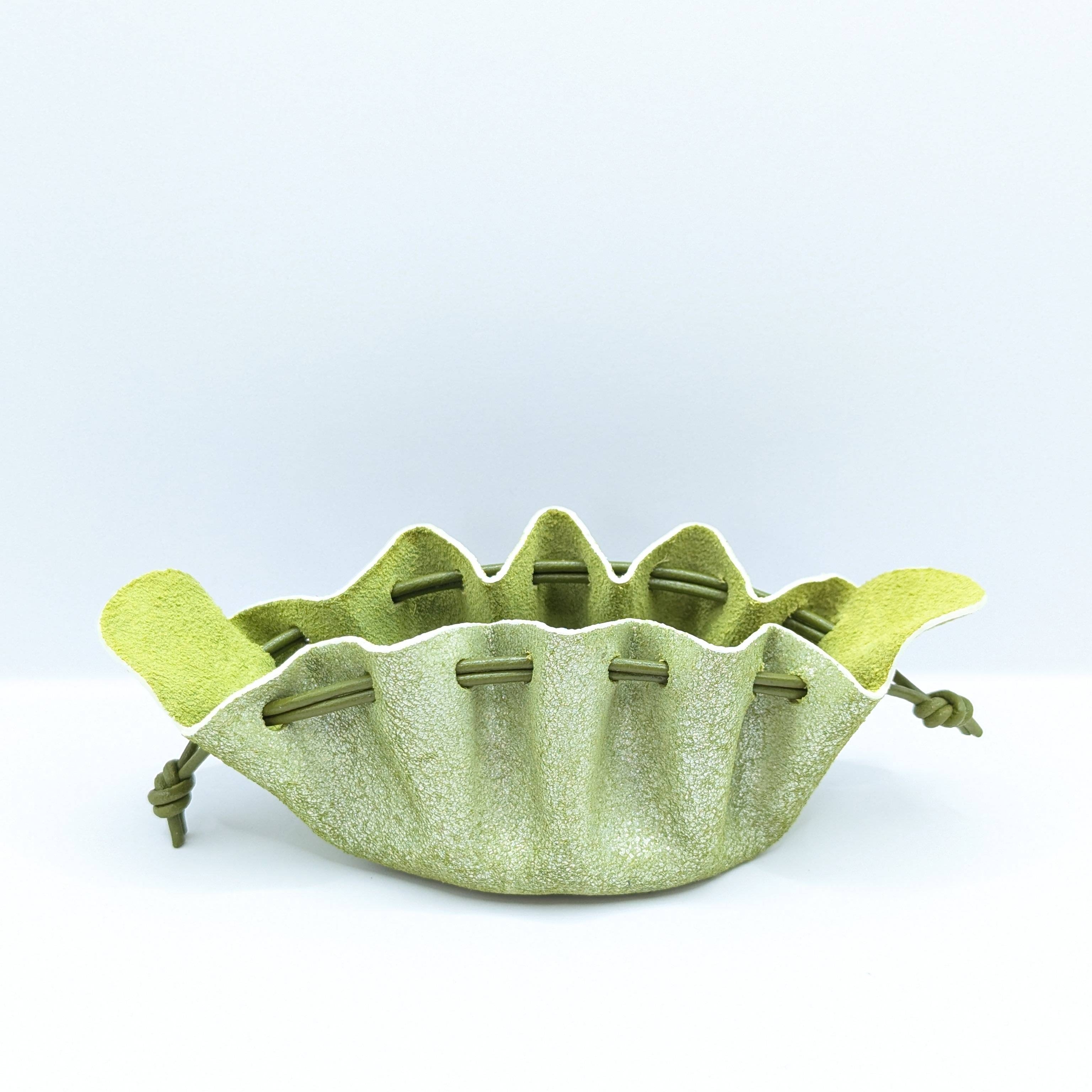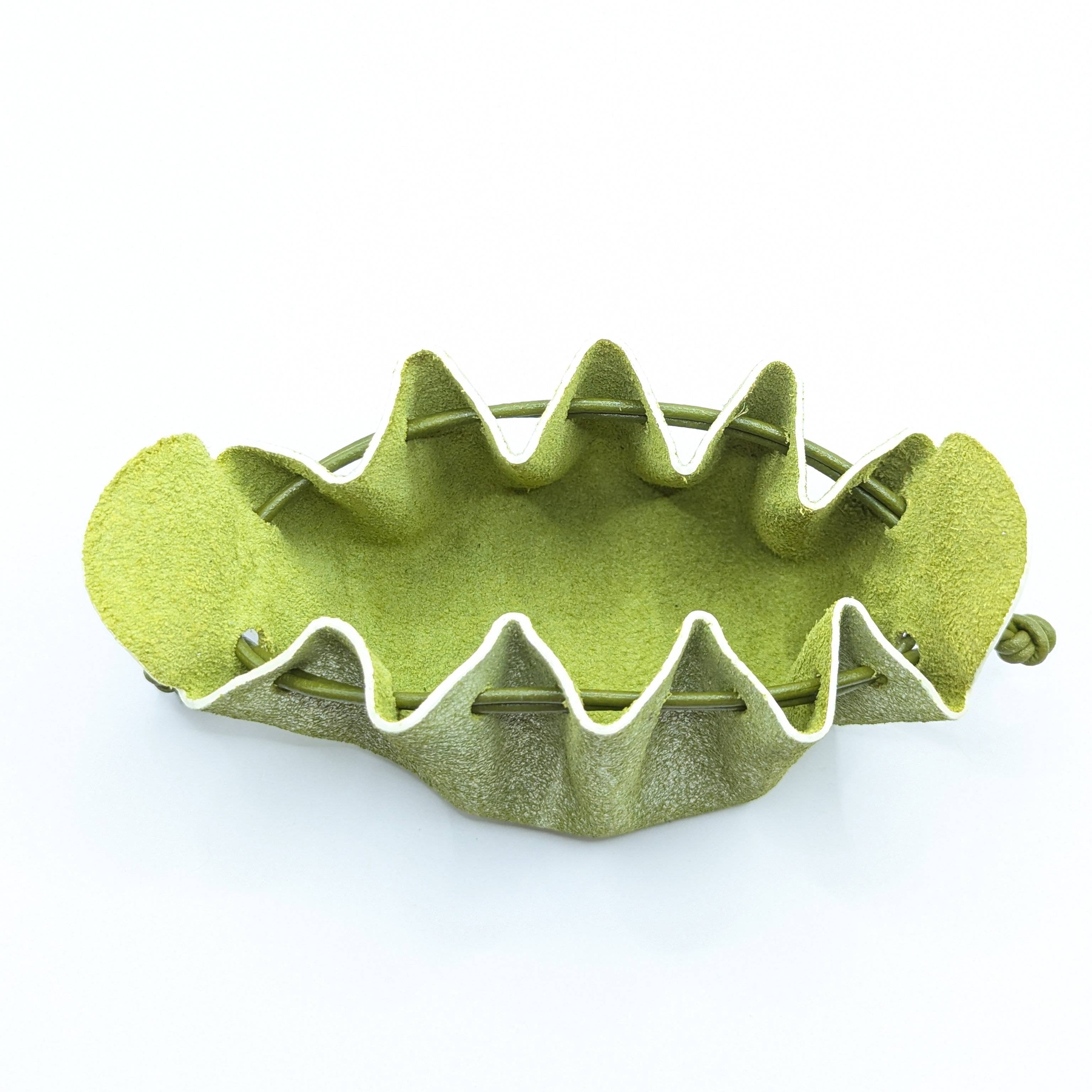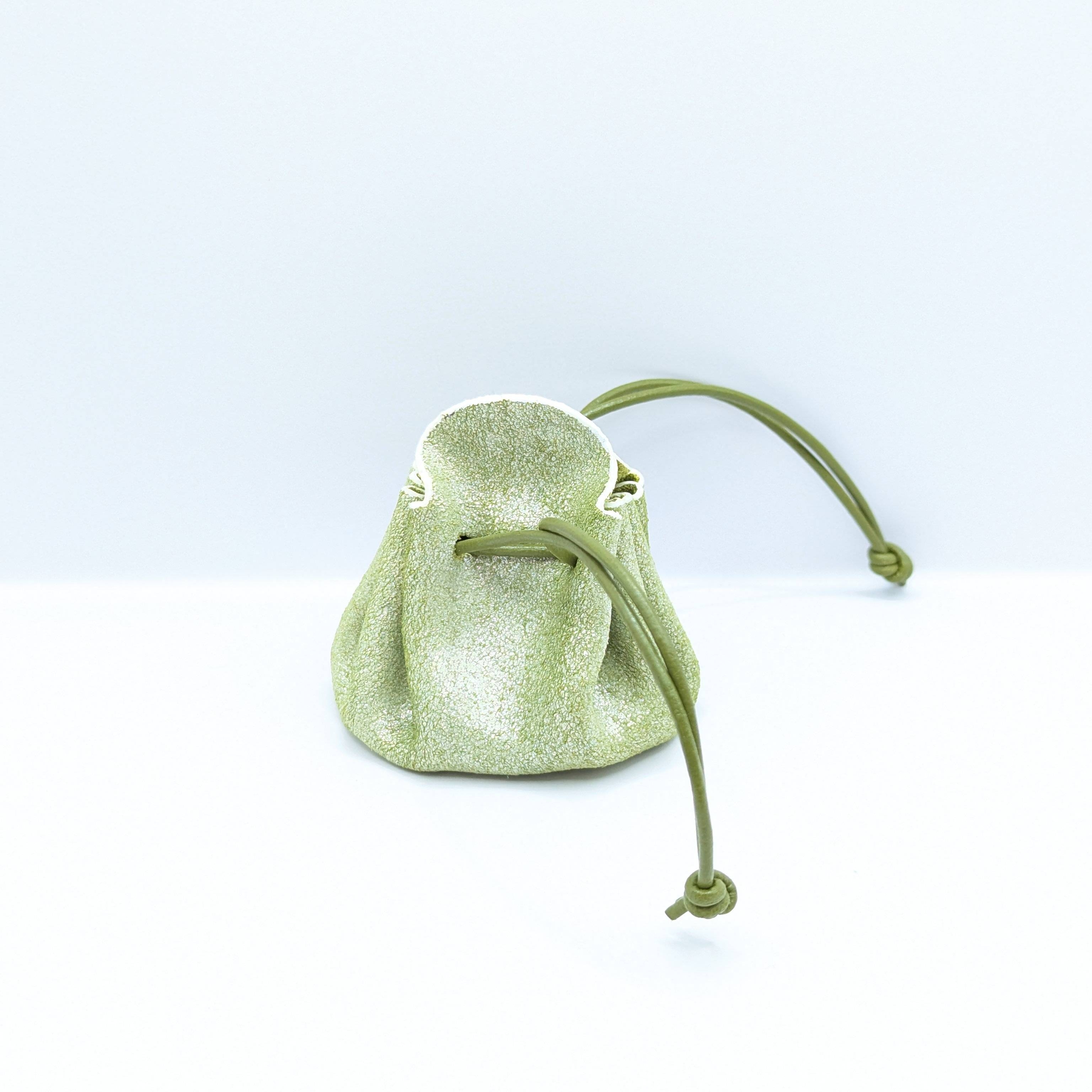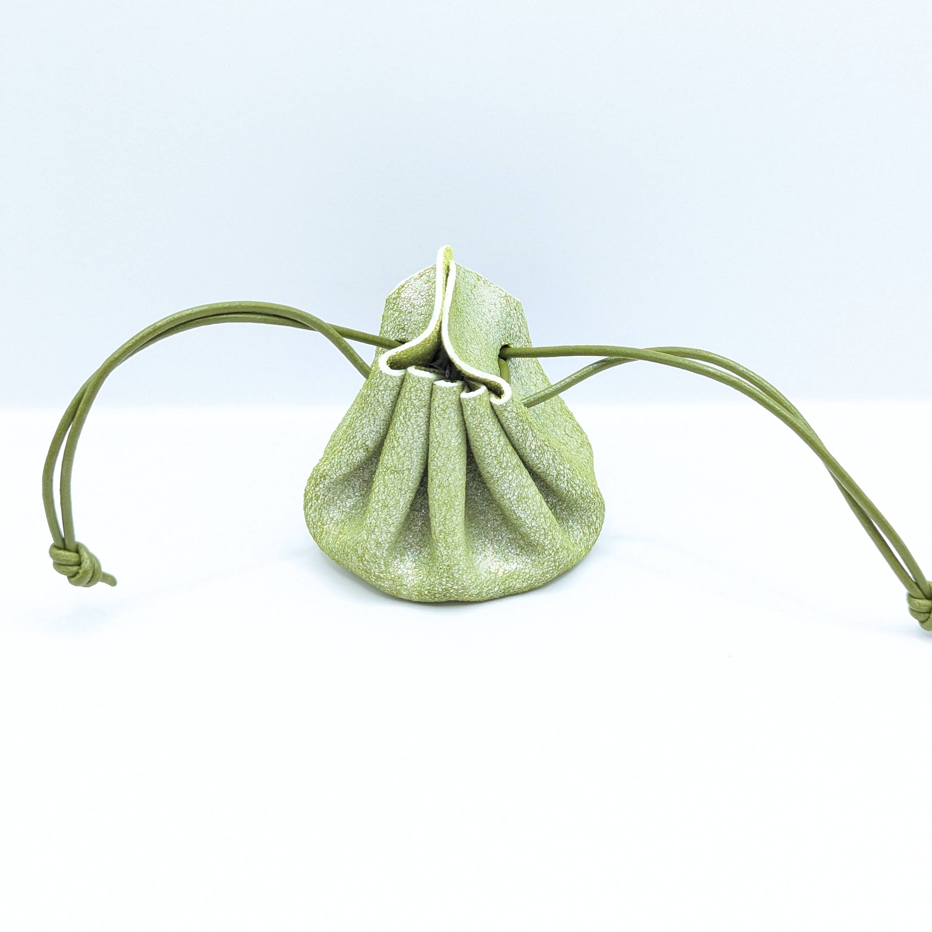Cette bourse est entièrement réalisée à la main et fabriquée à partir de chutes de cuir d'agneau et le cordon est en cuir de vachette. Elle mesure 6 cm de diamètre et 6 cm de hauteur. Elle s’ouvre simplement en tirant sur les «oreilles» et se ferme en tirant sur les liens. Vous pouvez aussi fermer la bourse en faisant un nœud avec les liens par dessus les «oreilles» pour plus de sécurité. *La couleur réelle peut légèrement varier selon la luminosité et le contraste de votre écran