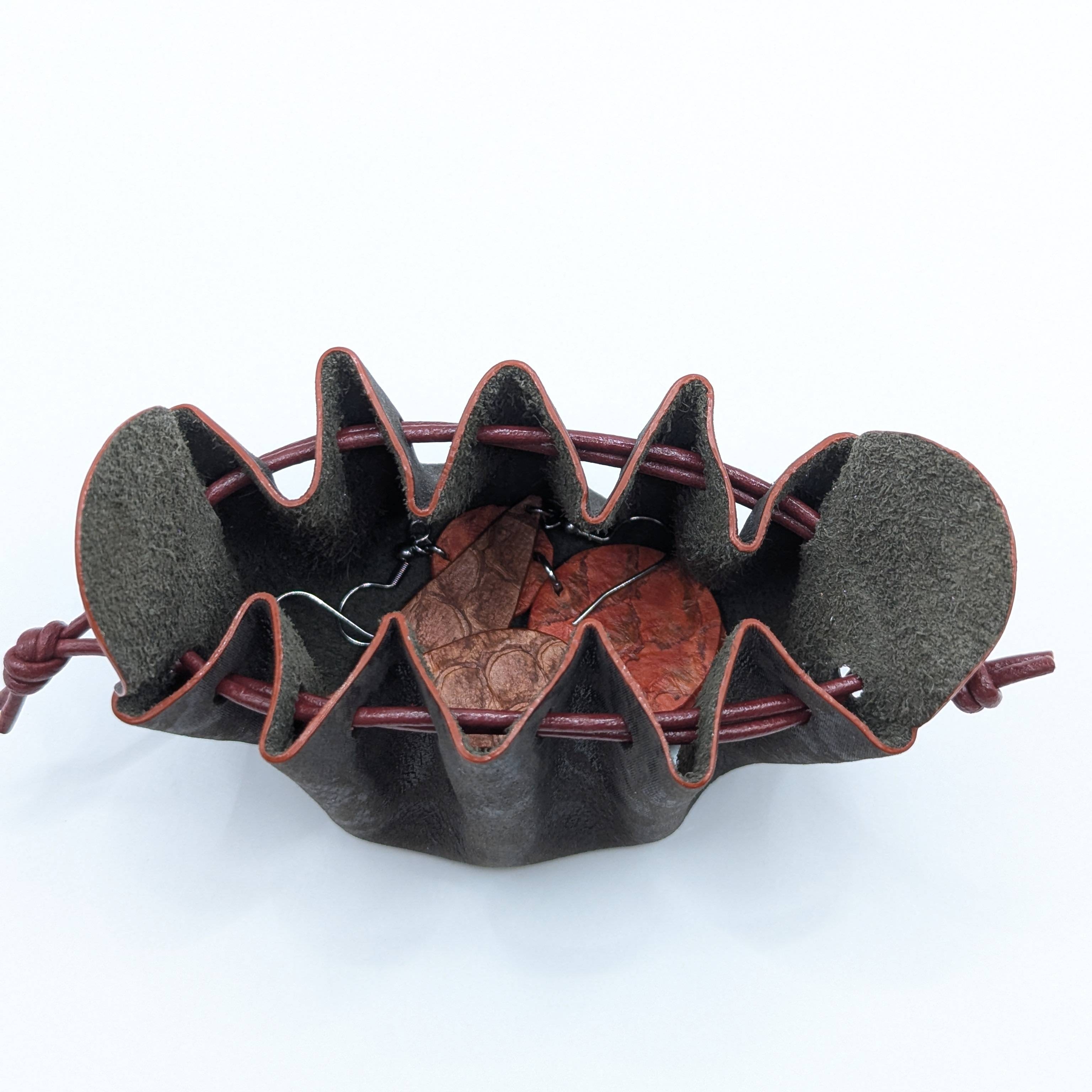 Cette bourse est entièrement réalisée à la main et fabriquée à partir de chutes de cuir d'agneau et le cordon est en cuir de vachette. Elle mesure 6 cm de diamètre et 6 cm de hauteur. Elle s’ouvre simplement en tirant sur les «oreilles» et se ferme en tirant sur les liens. Vous pouvez aussi fermer la bourse en faisant un nœud avec les liens par dessus les «oreilles» pour plus de sécurité. *La couleur réelle peut légèrement varier selon la luminosité et le contraste de votre écran