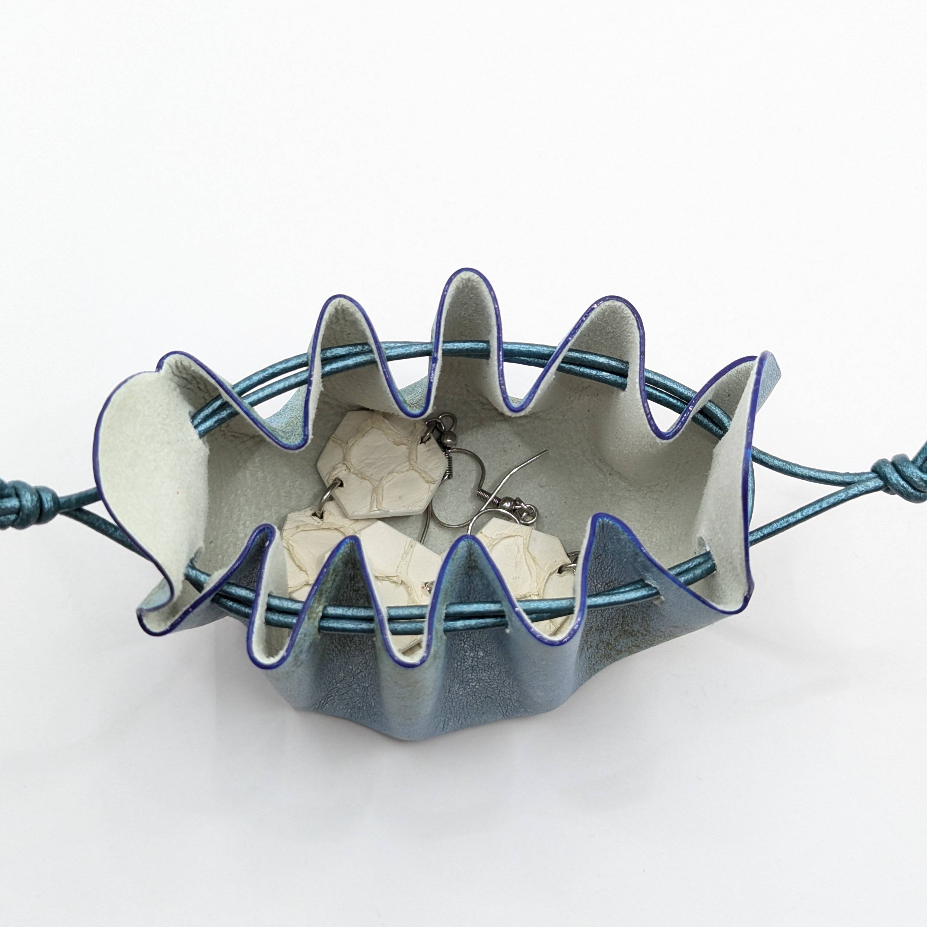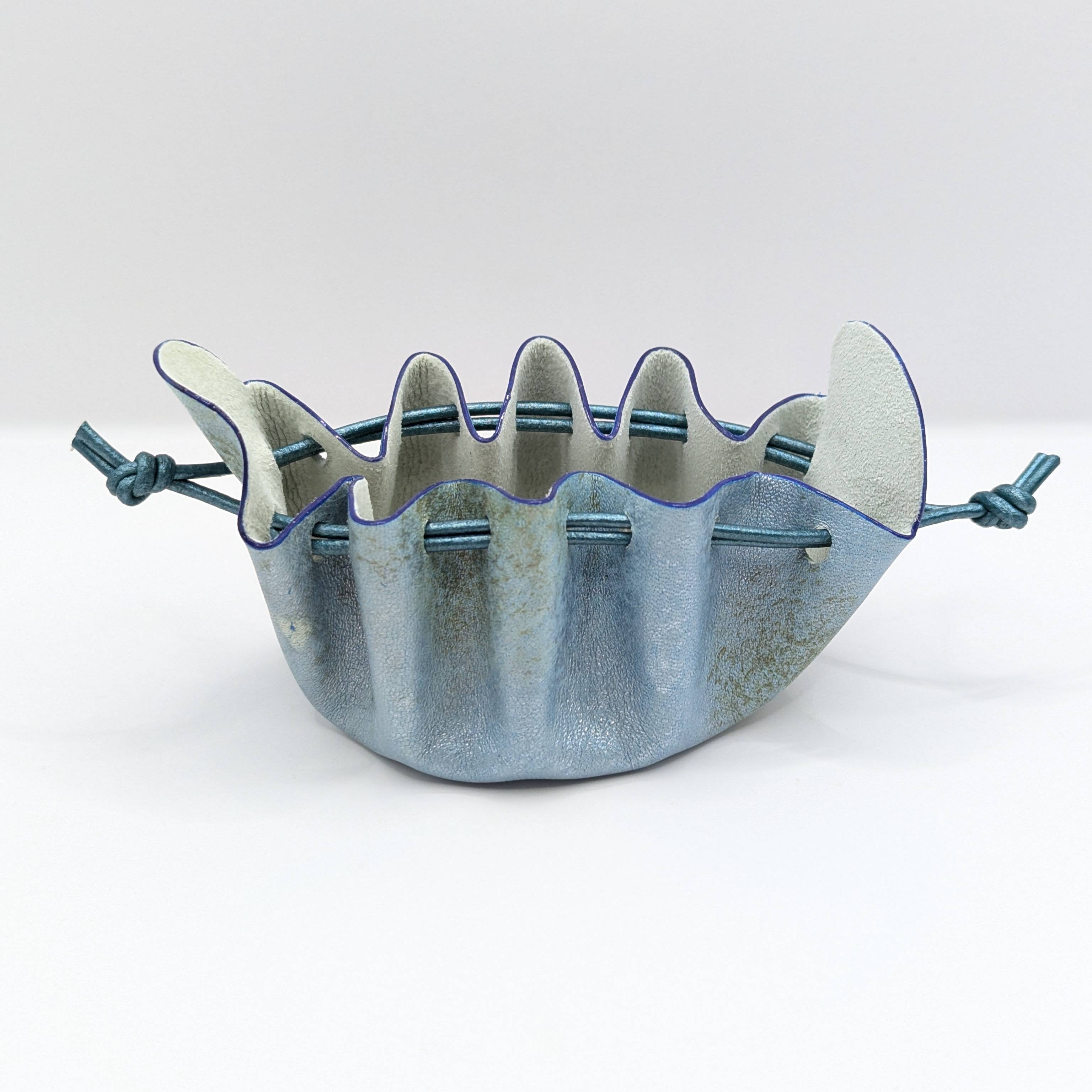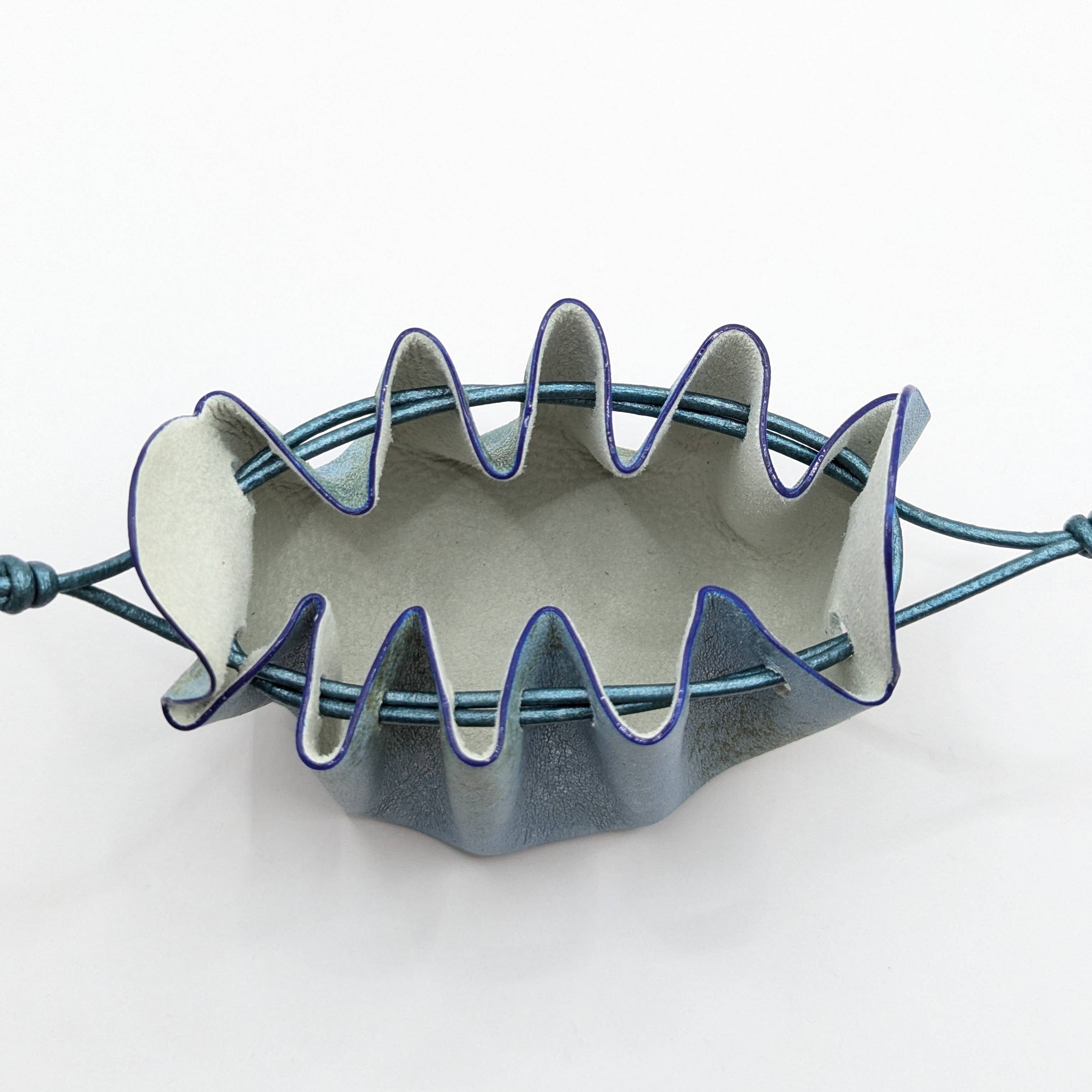 Cette bourse est entièrement réalisée à la main et fabriquée à partir de chutes de cuir d'agneau et le cordon est en cuir de vachette. Elle mesure 6 cm de diamètre et 6 cm de hauteur. Elle s’ouvre simplement en tirant sur les «oreilles» et se ferme en tirant sur les liens. Vous pouvez aussi fermer la bourse en faisant un nœud avec les liens par dessus les «oreilles» pour plus de sécurité. *La couleur réelle peut légèrement varier selon la luminosité et le contraste de votre écran