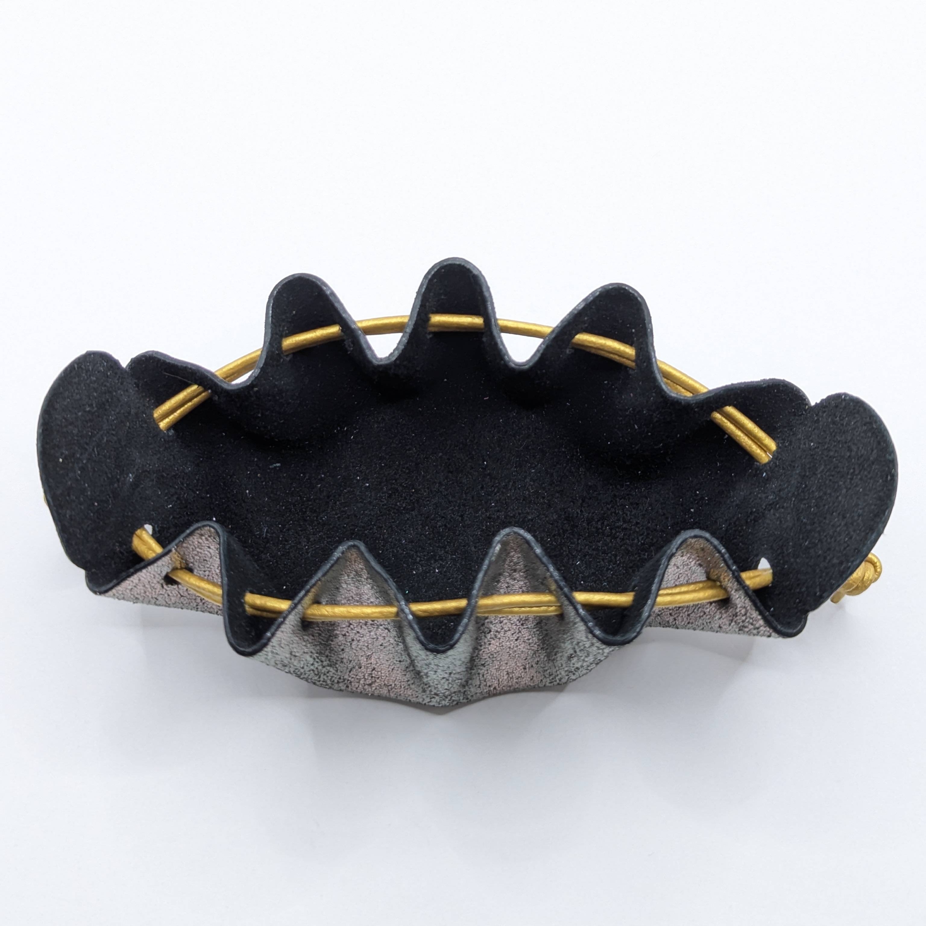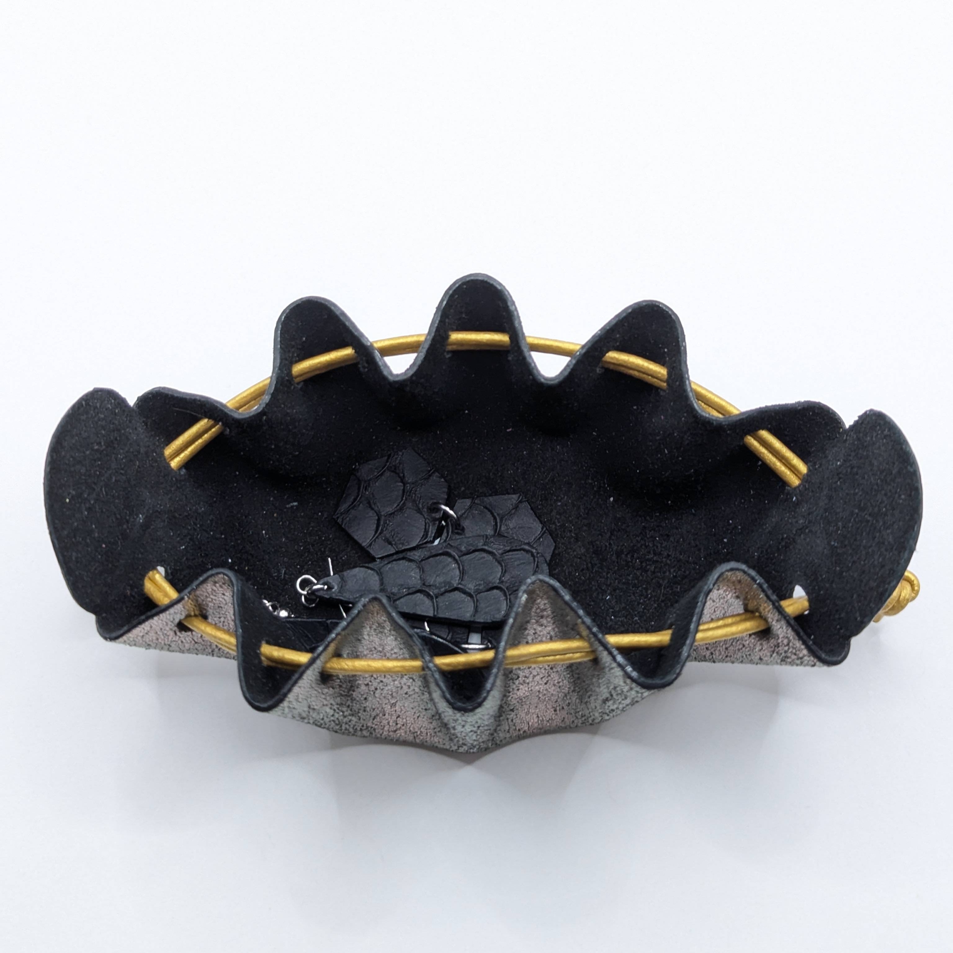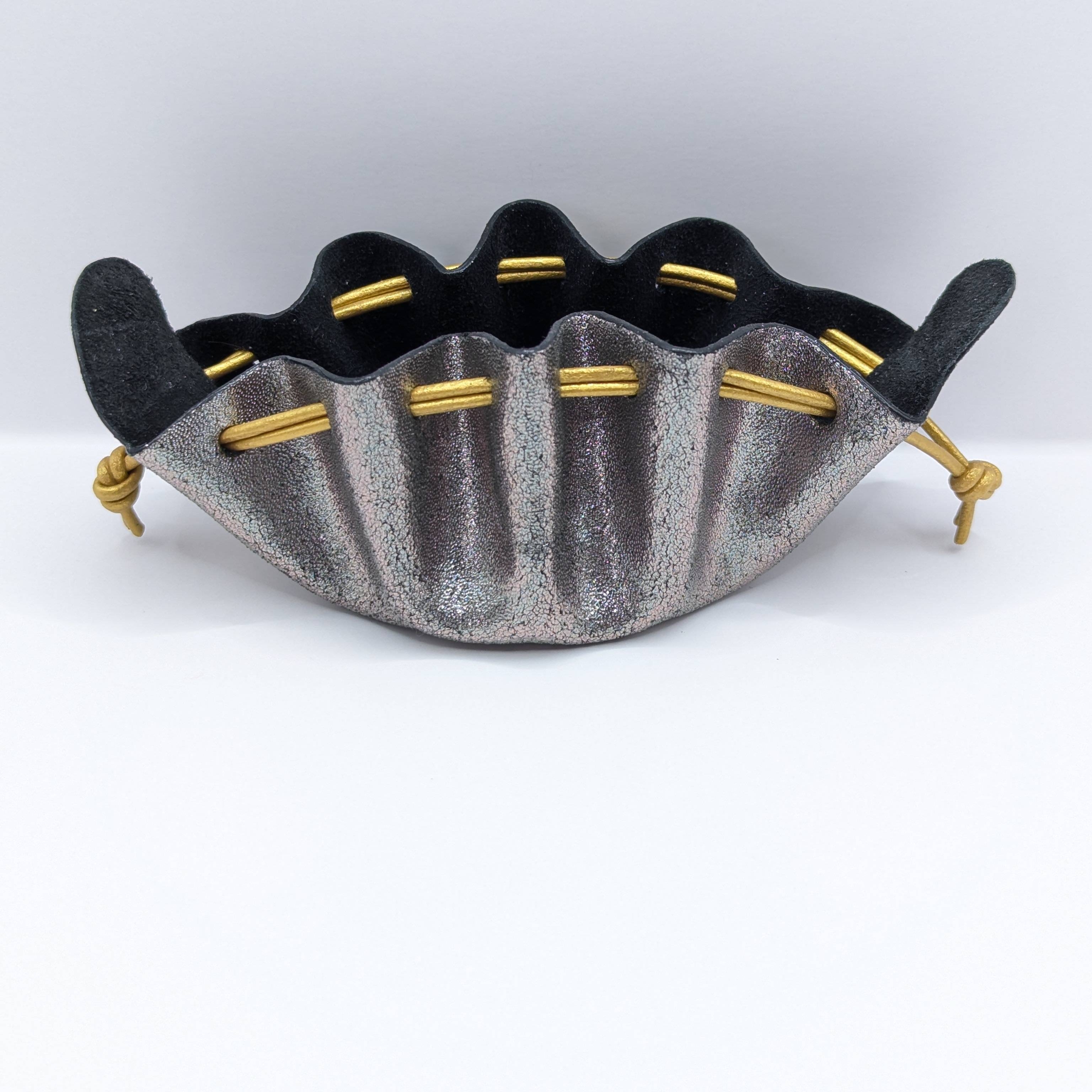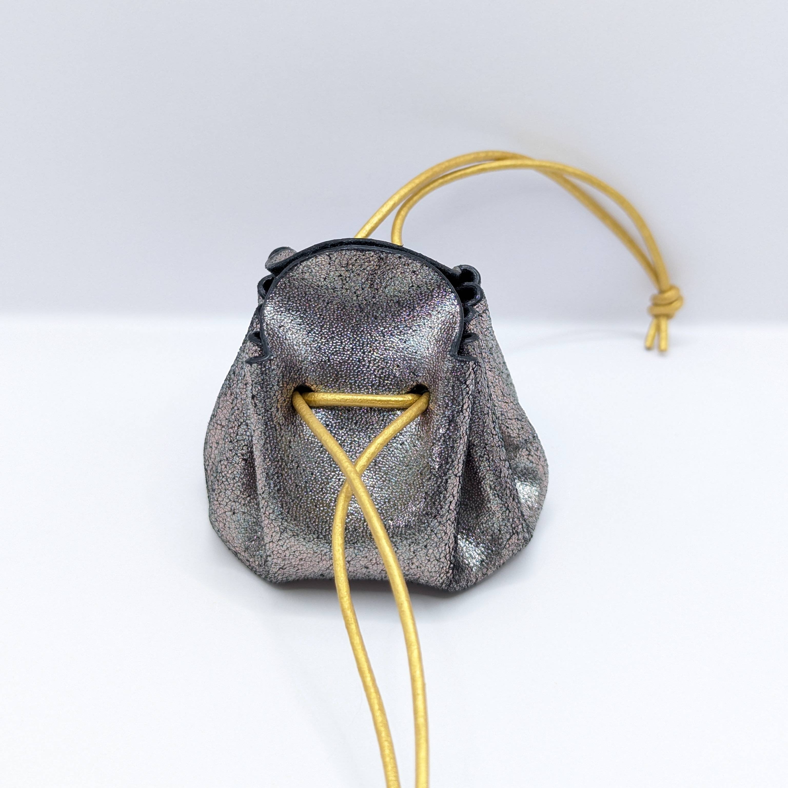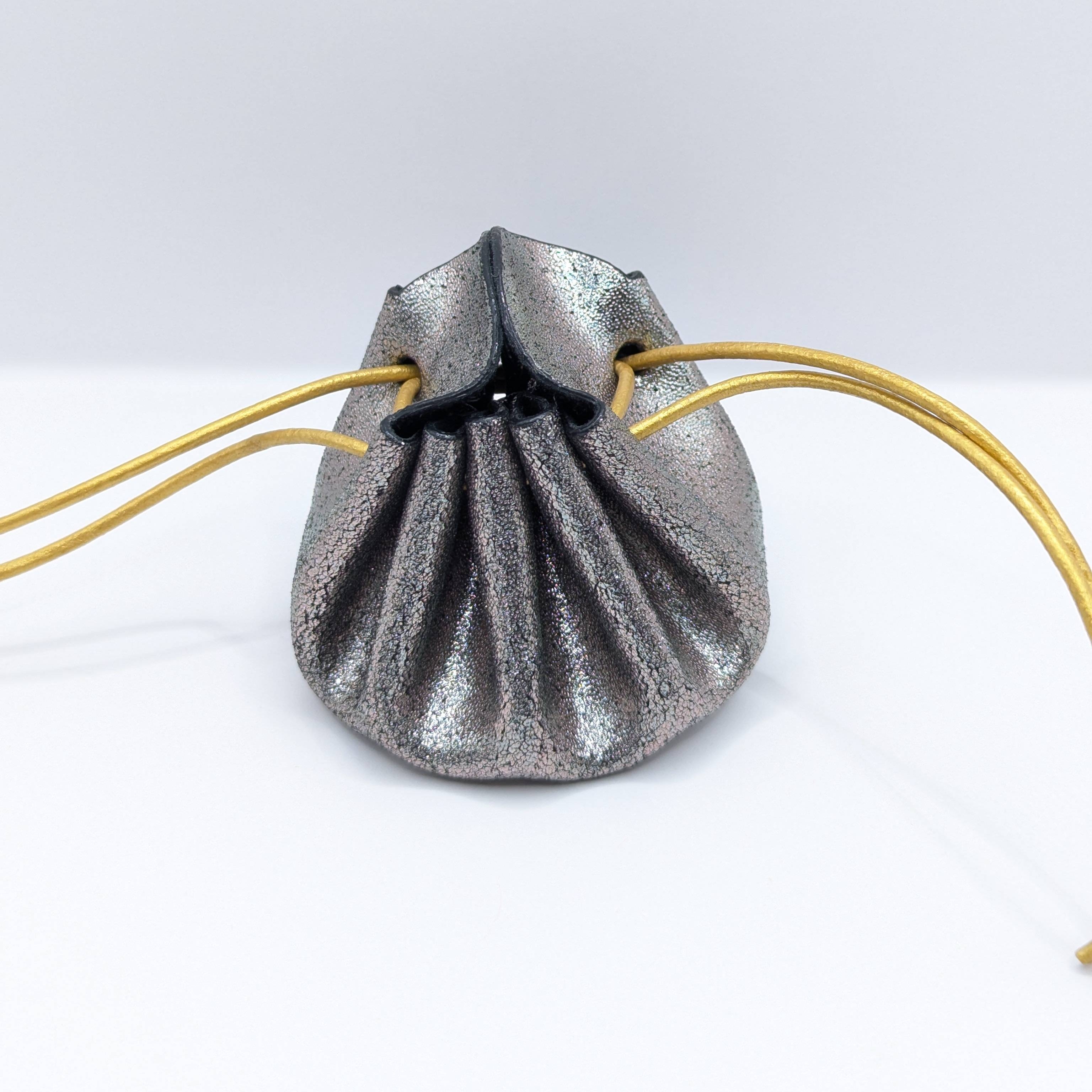 Cette bourse est entièrement réalisée à la main et fabriquée à partir de chutes de cuir d'agneau et le cordon est en cuir de vachette. Elle mesure 6 cm de diamètre et 6 cm de hauteur. Elle s’ouvre simplement en tirant sur les «oreilles» et se ferme en tirant sur les liens. Vous pouvez aussi fermer la bourse en faisant un nœud avec les liens par dessus les «oreilles» pour plus de sécurité. *La couleur réelle peut légèrement varier selon la luminosité et le contraste de votre écran