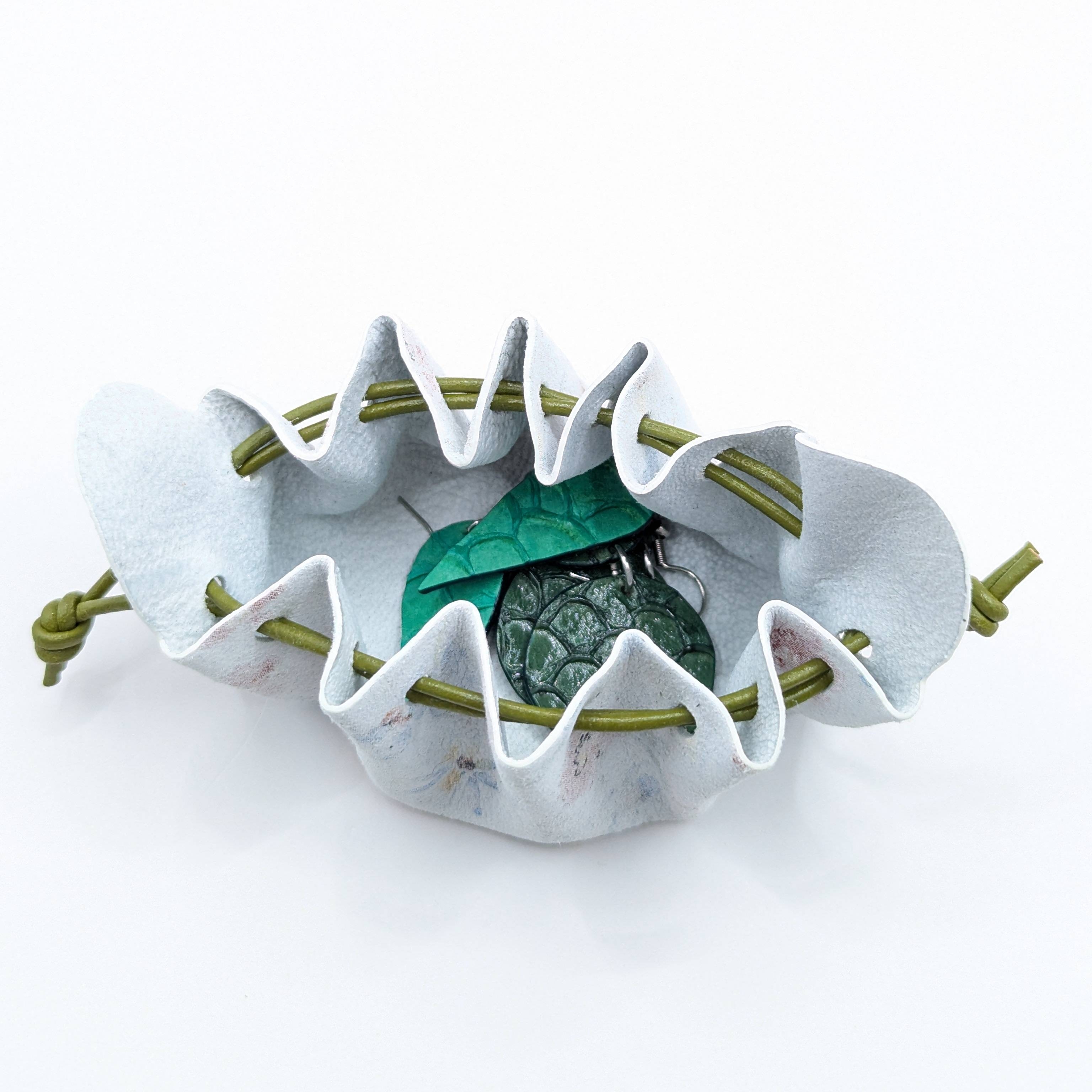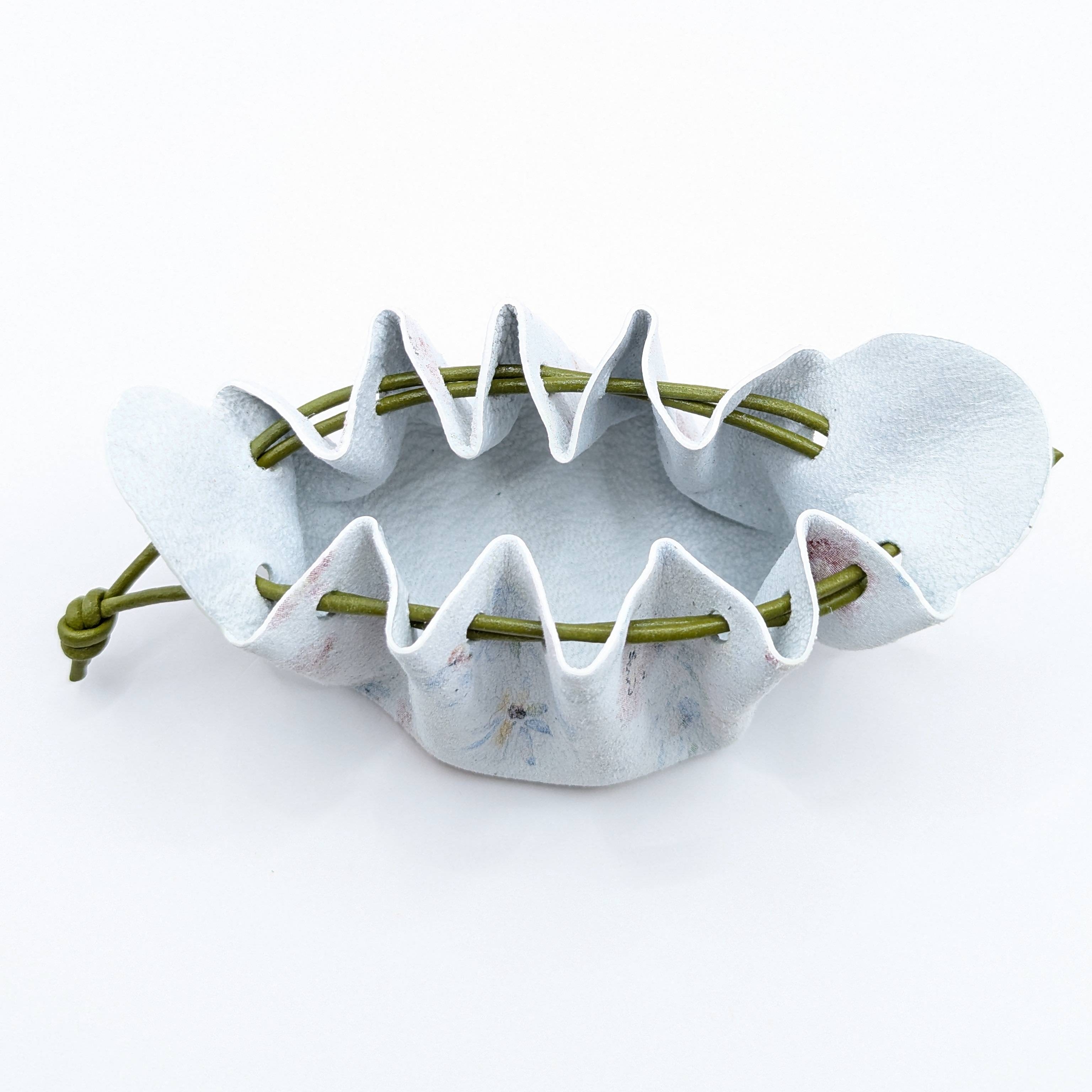 Cette bourse est entièrement réalisée à la main et fabriquée à partir de chutes de cuir d'agneau et le cordon est en cuir de vachette. Elle mesure 6 cm de diamètre et 6 cm de hauteur. Elle s’ouvre simplement en tirant sur les «oreilles» et se ferme en tirant sur les liens. Vous pouvez aussi fermer la bourse en faisant un nœud avec les liens par dessus les «oreilles» pour plus de sécurité. *La couleur réelle peut légèrement varier selon la luminosité et le contraste de votre écran