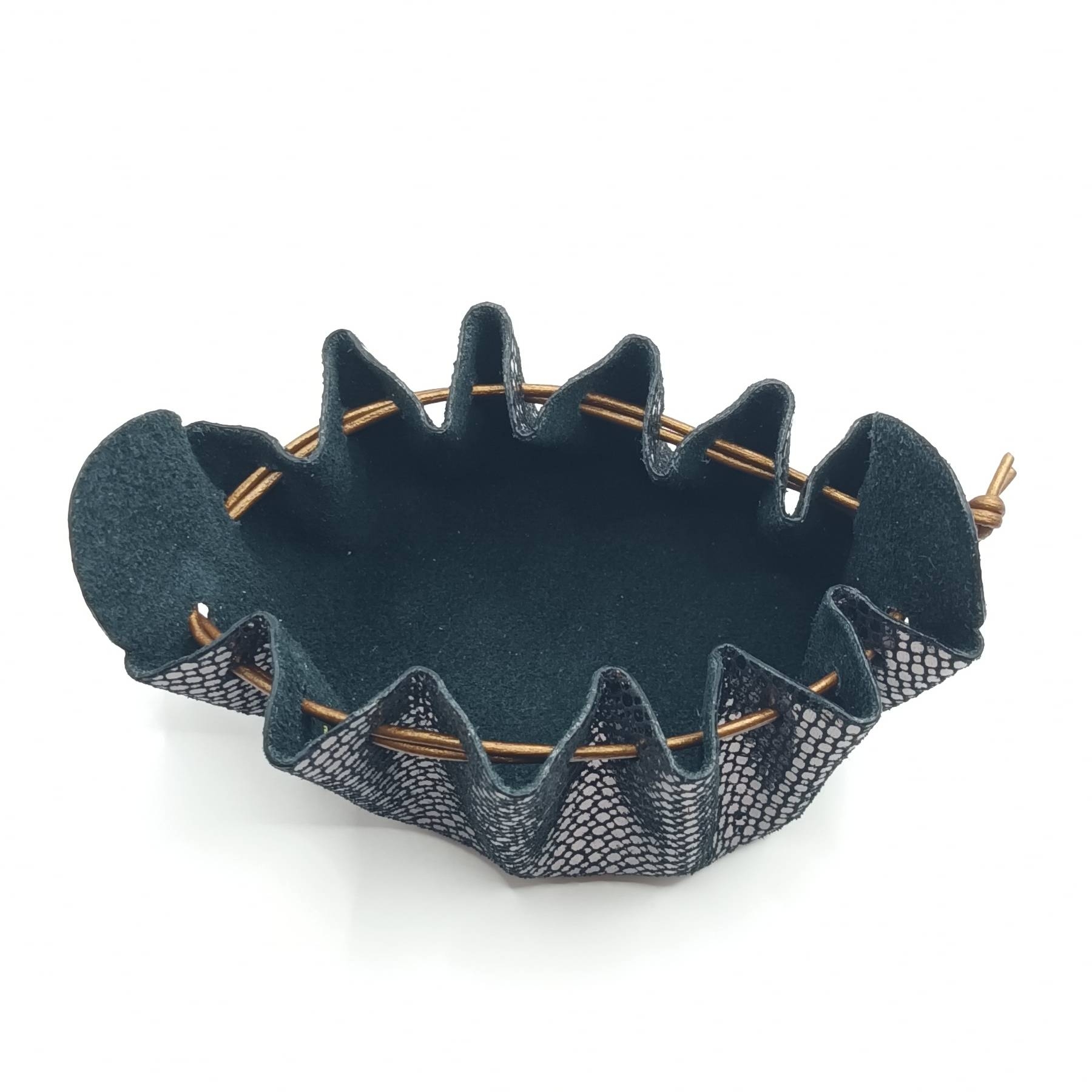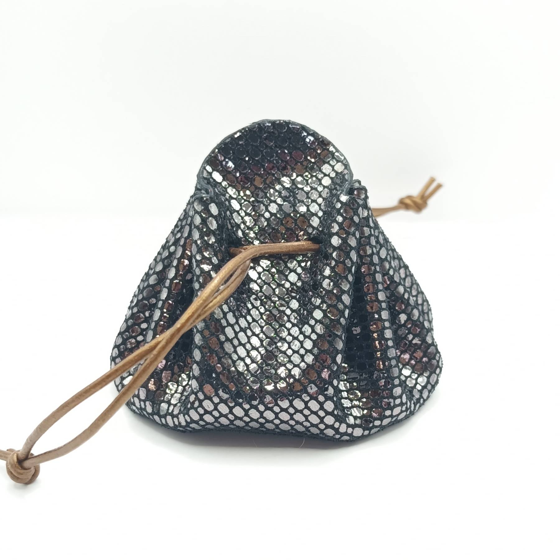 Cette bourse est entièrement réalisée à la main et fabriquée à partir de chutes de cuir d'agneau et le cordon est en cuir de vachette. Elle mesure 8 cm de diamètre et 8 cm de hauteur. Elle s’ouvre simplement en tirant sur les «oreilles» et se ferme en tirant sur les liens. Vous pouvez aussi fermer la bourse en faisant un nœud avec les liens par dessus les «oreilles» pour plus de sécurité. *La couleur réelle peut légèrement varier selon la luminosité et le contraste de votre écran