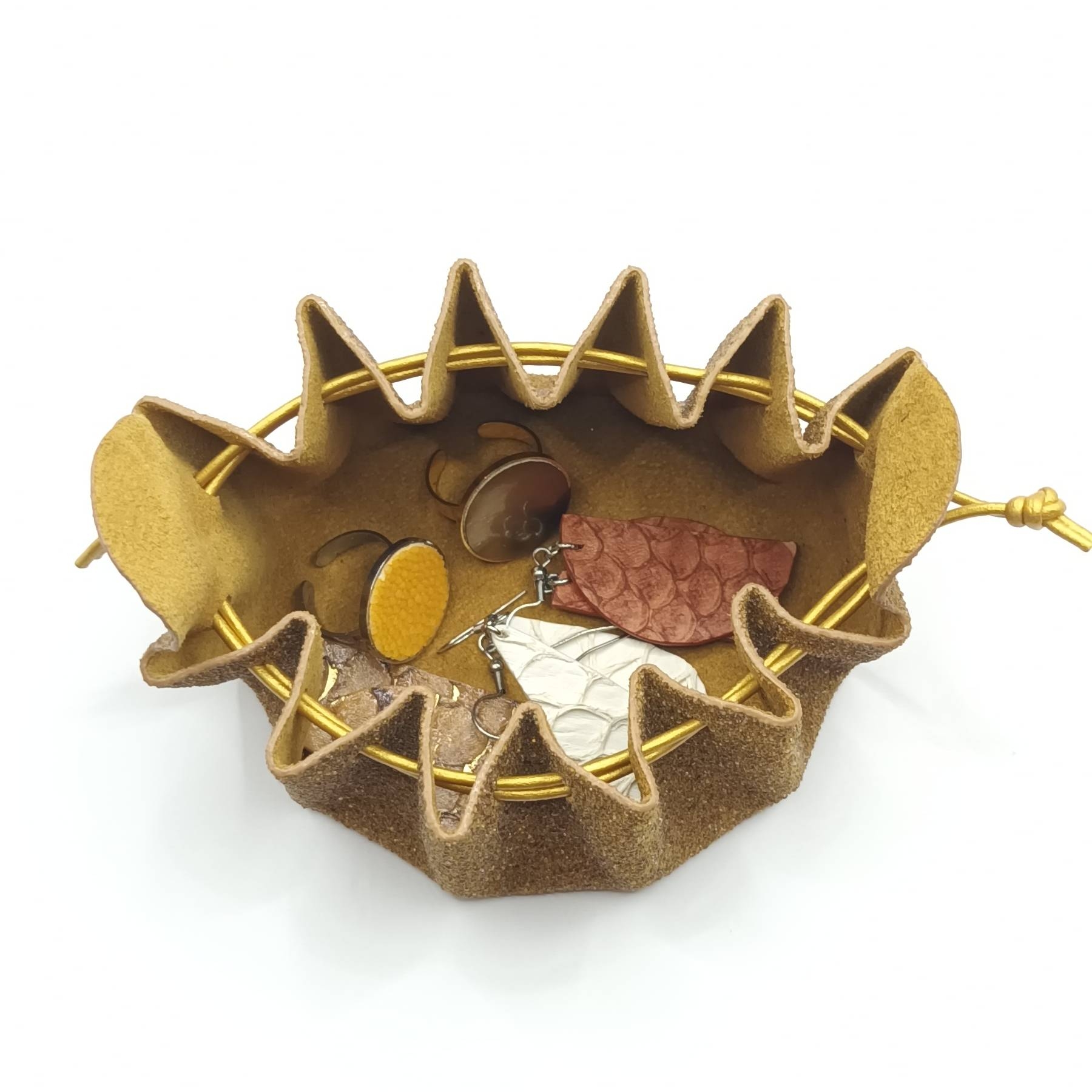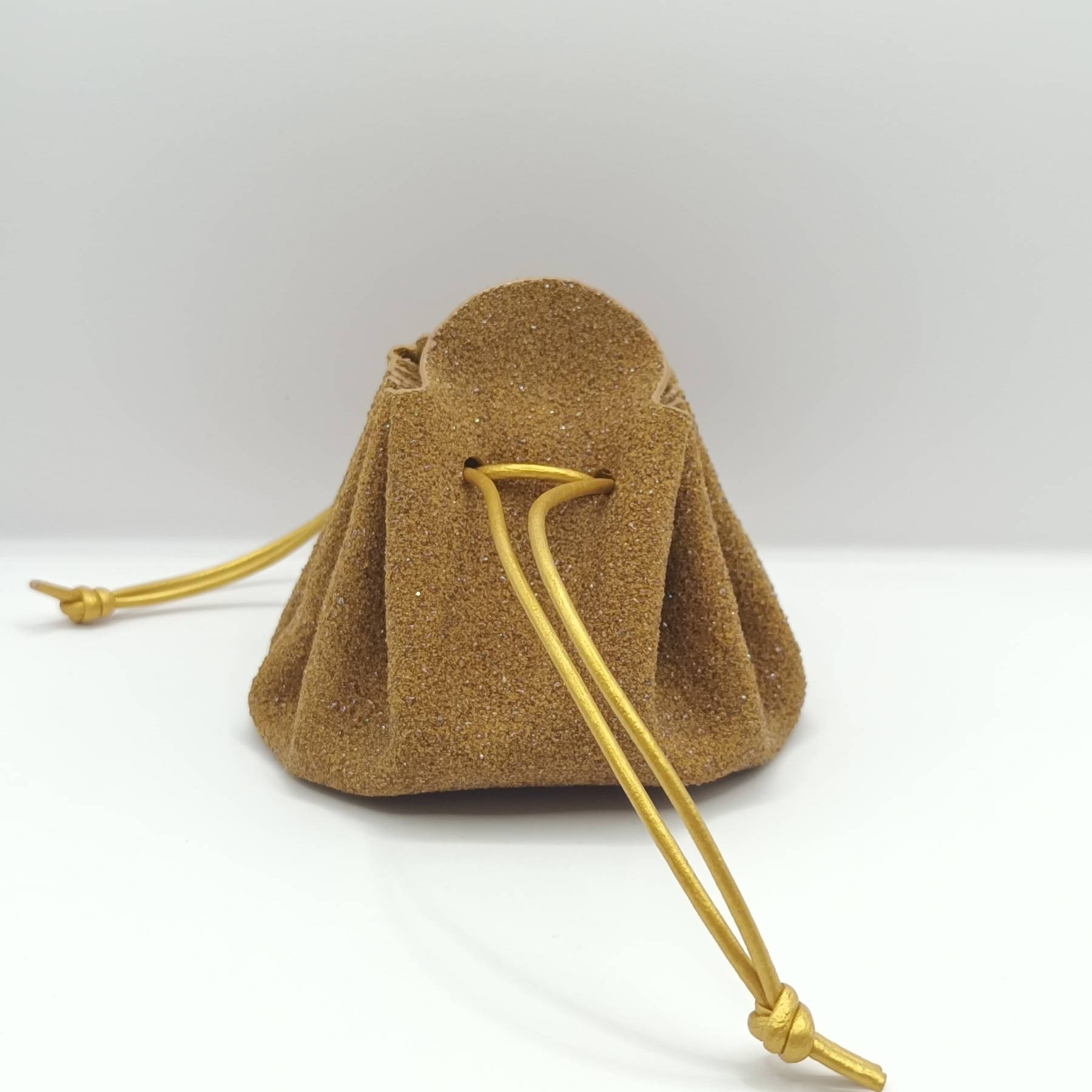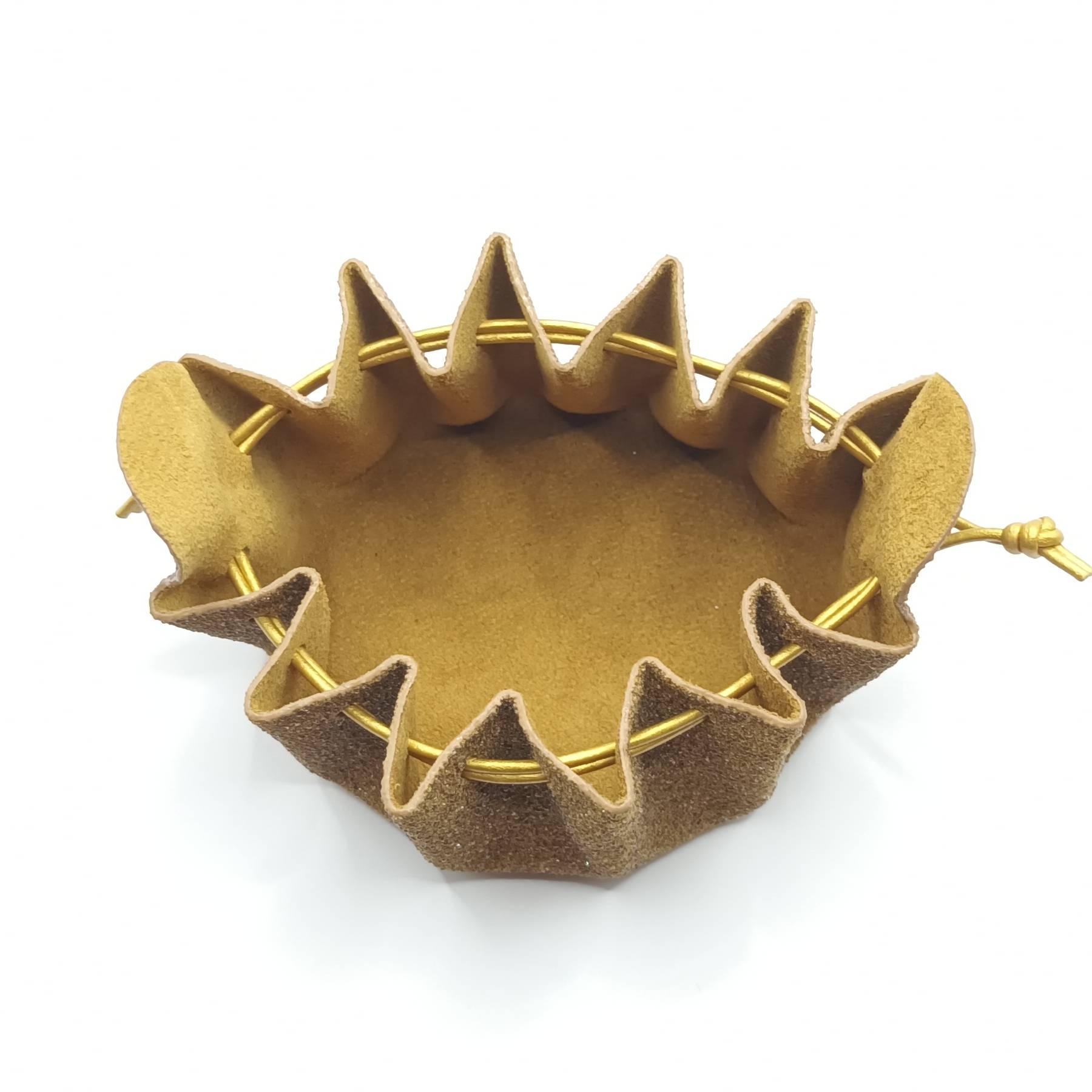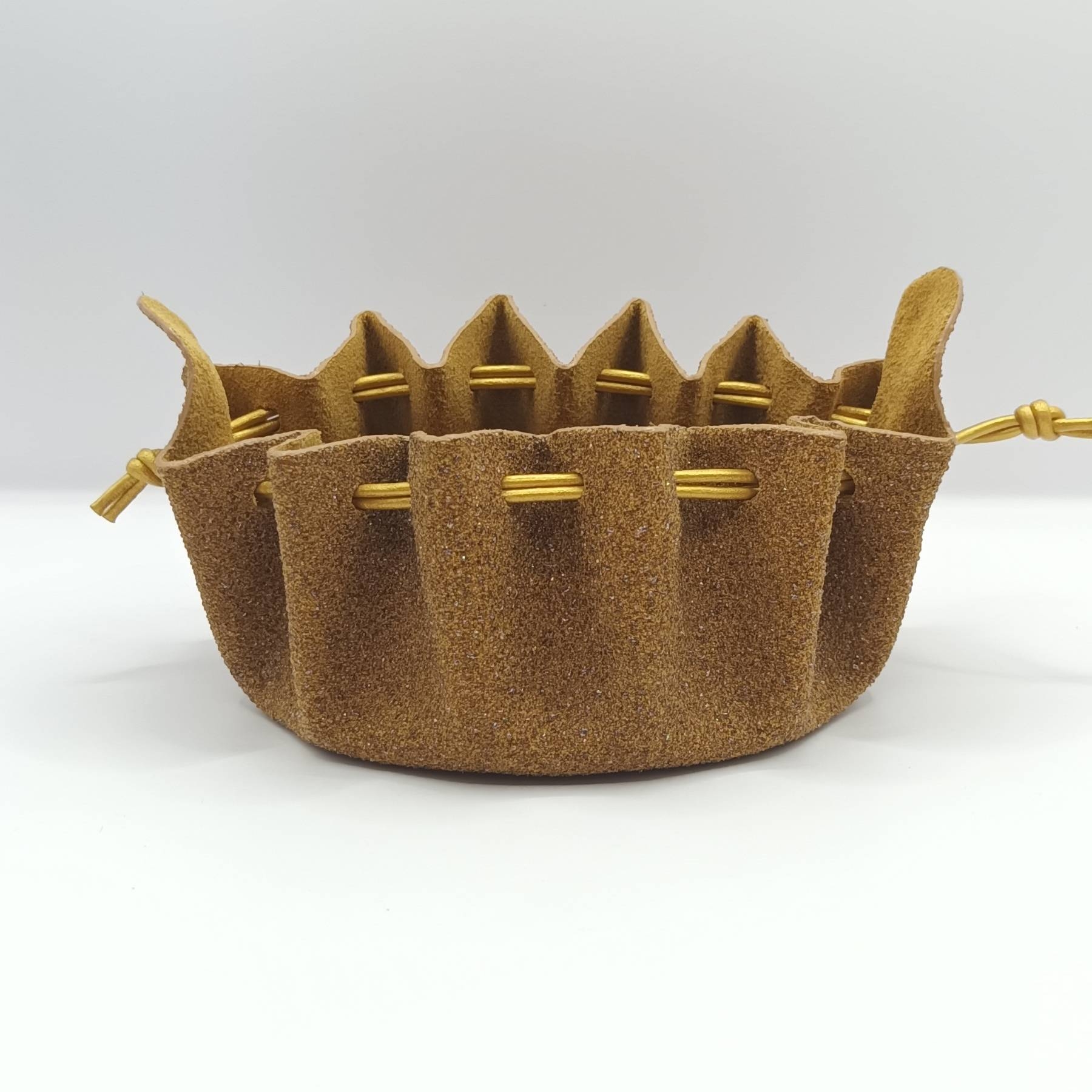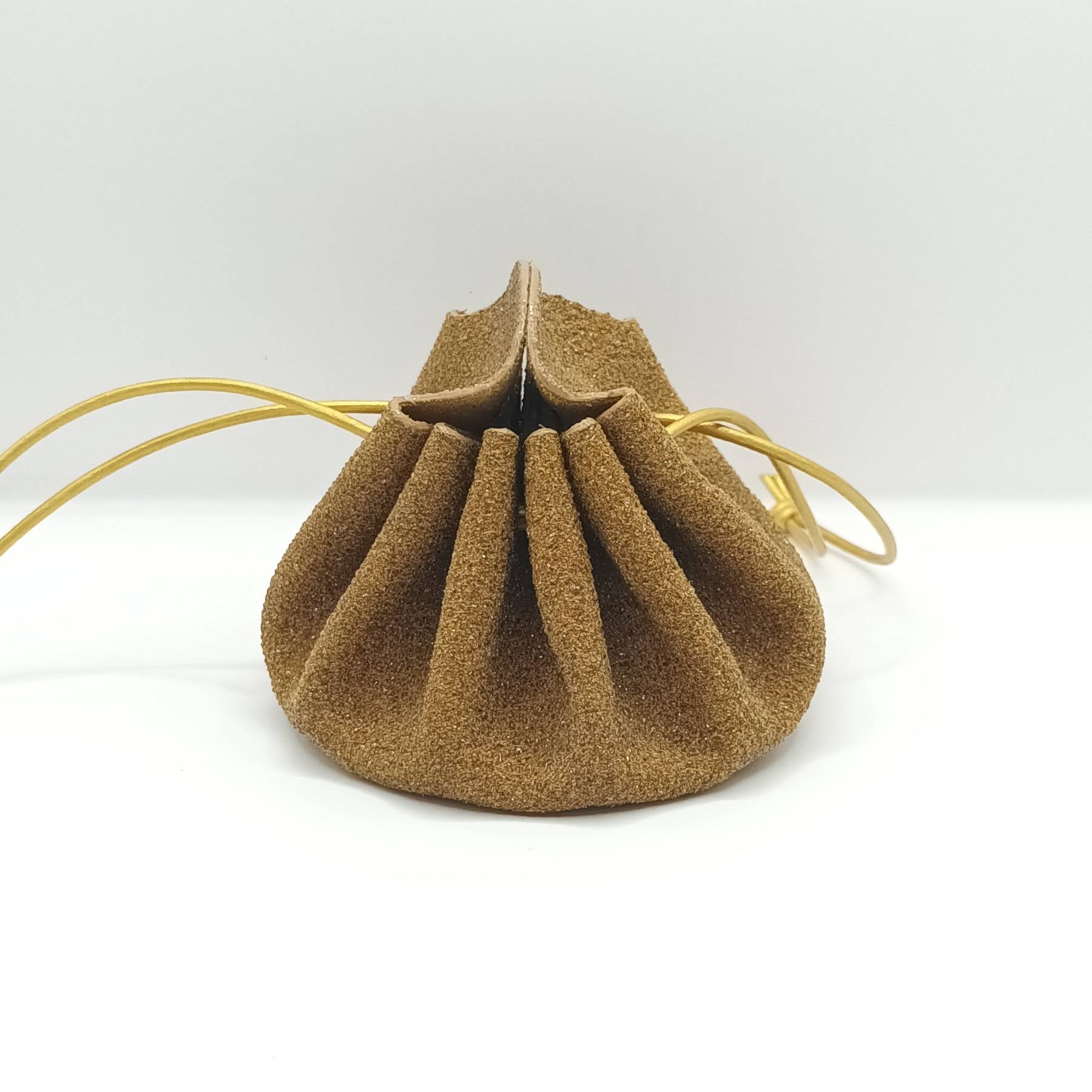 Cette bourse est entièrement réalisée à la main et fabriquée à partir de chutes de cuir d'agneau et le cordon est en cuir de vachette. Elle mesure 8 cm de diamètre et 8 cm de hauteur. Elle s’ouvre simplement en tirant sur les «oreilles» et se ferme en tirant sur les liens. Vous pouvez aussi fermer la bourse en faisant un nœud avec les liens par dessus les «oreilles» pour plus de sécurité. *La couleur réelle peut légèrement varier selon la luminosité et le contraste de votre écran