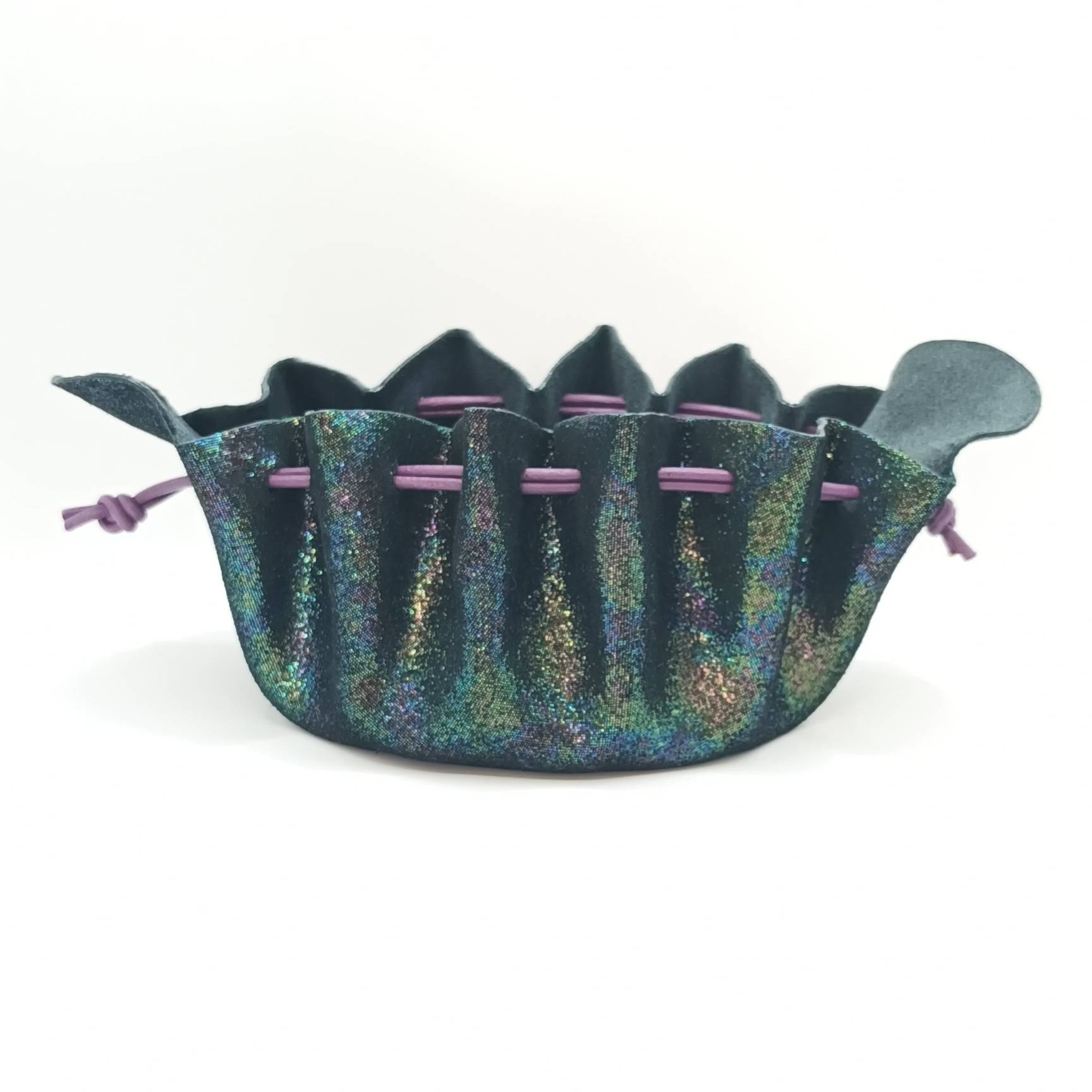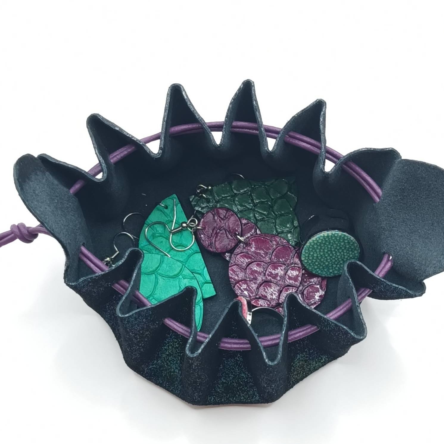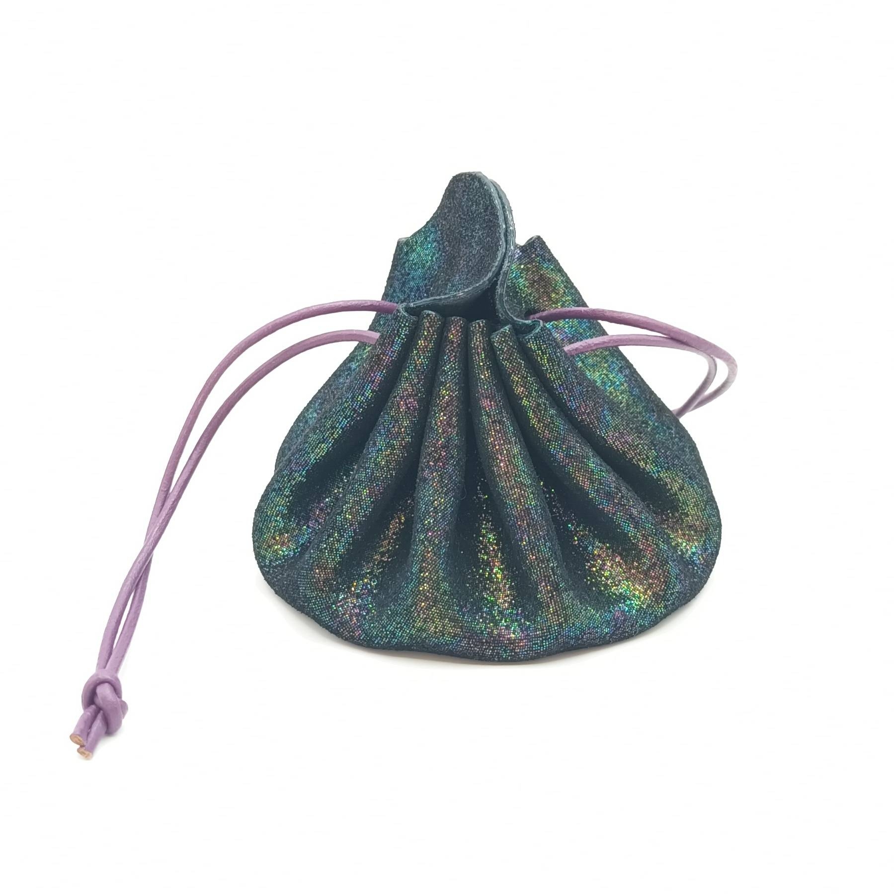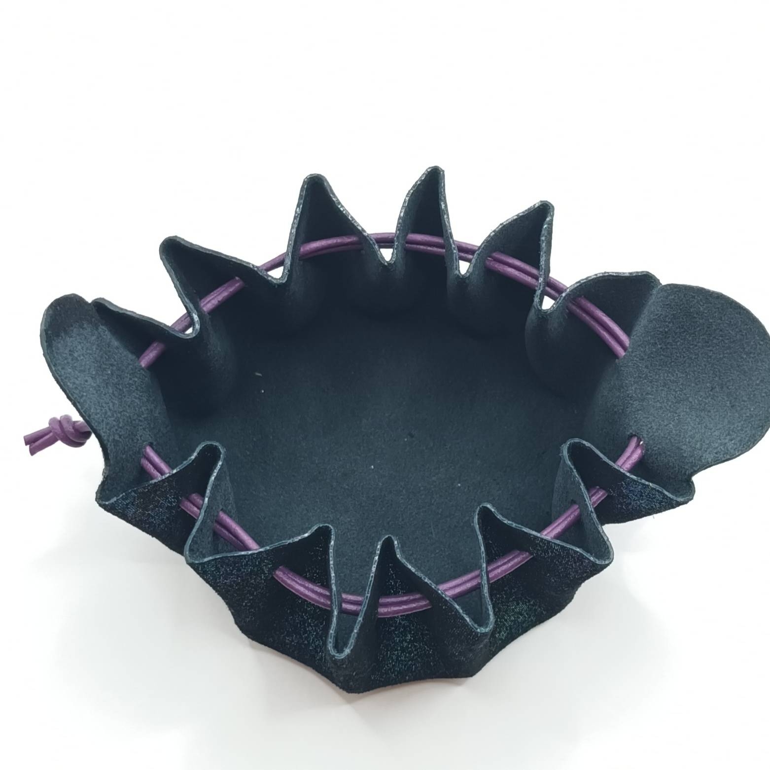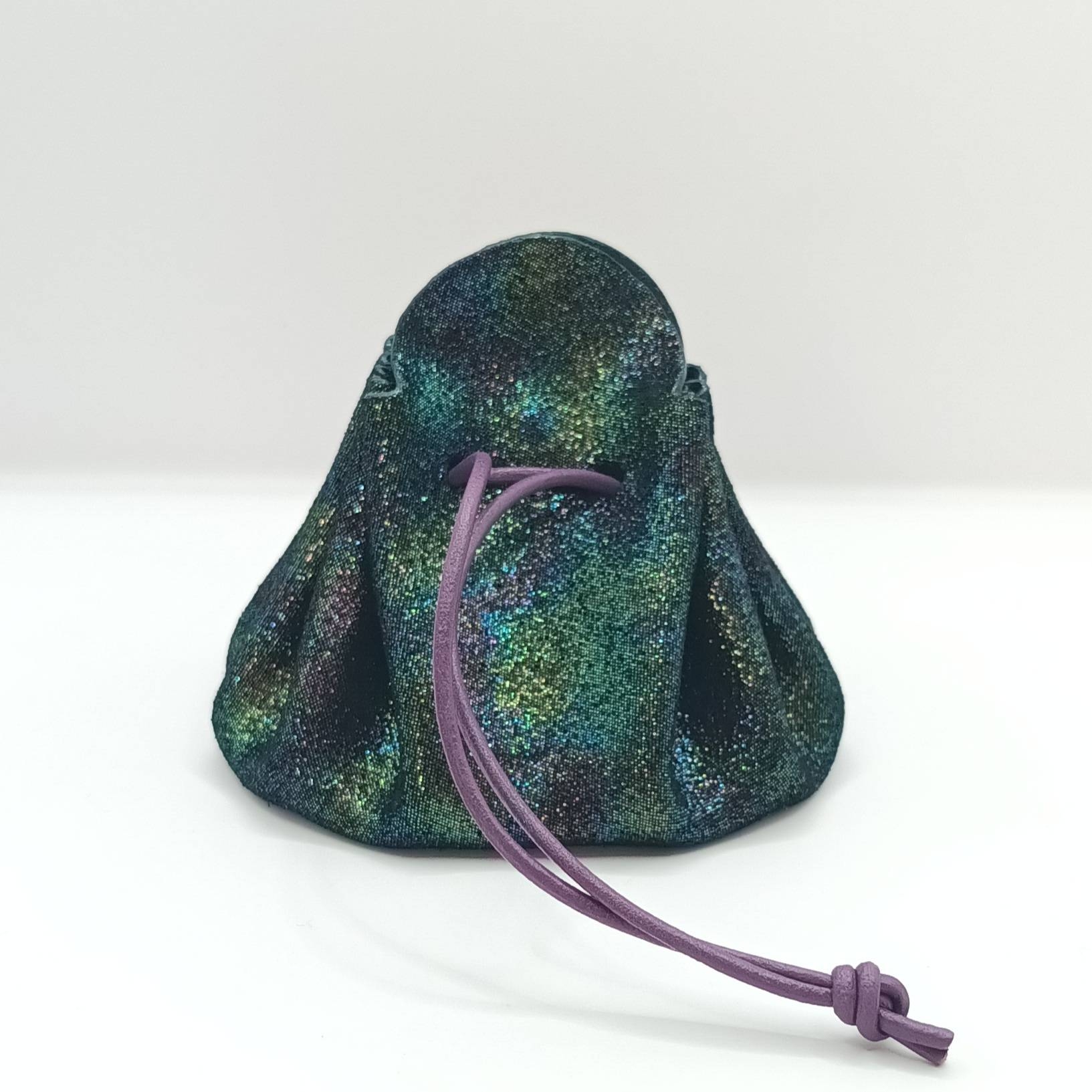 Cette bourse est entièrement réalisée à la main et fabriquée à partir de chutes de cuir d'agneau et le cordon est en cuir de vachette. Elle mesure 8 cm de diamètre et 8 cm de hauteur. Elle s’ouvre simplement en tirant sur les «oreilles» et se ferme en tirant sur les liens. Vous pouvez aussi fermer la bourse en faisant un nœud avec les liens par dessus les «oreilles» pour plus de sécurité. *La couleur réelle peut légèrement varier selon la luminosité et le contraste de votre écran
