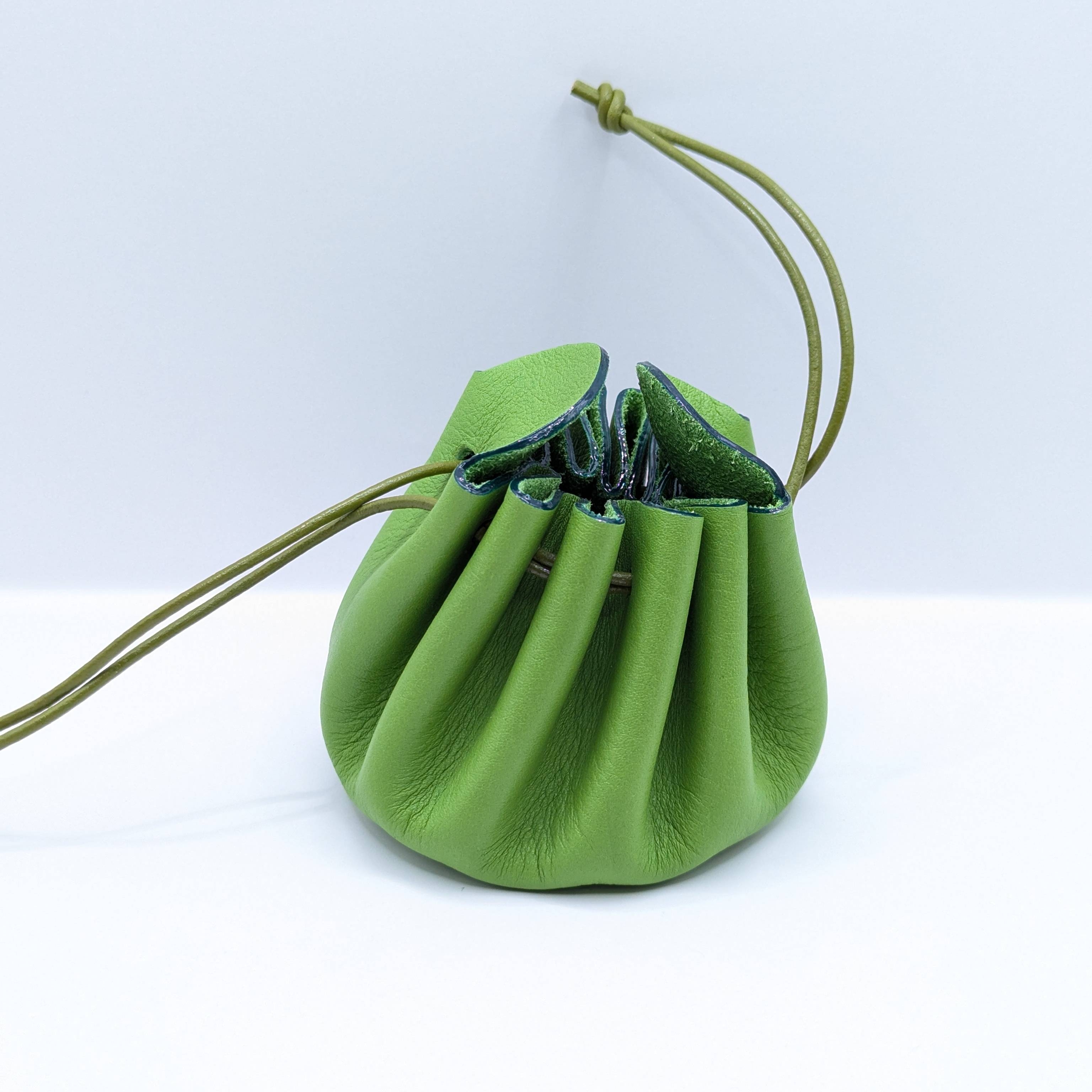 Cette bourse est entièrement réalisée à la main et fabriquée à partir de chutes de cuir d'agneau et le cordon est en cuir de vachette. Elle mesure 8 cm de diamètre et 8 cm de hauteur. Elle s’ouvre simplement en tirant sur les «oreilles» et se ferme en tirant sur les liens. Vous pouvez aussi fermer la bourse en faisant un nœud avec les liens par dessus les «oreilles» pour plus de sécurité. *La couleur réelle peut légèrement varier selon la luminosité et le contraste de votre écran