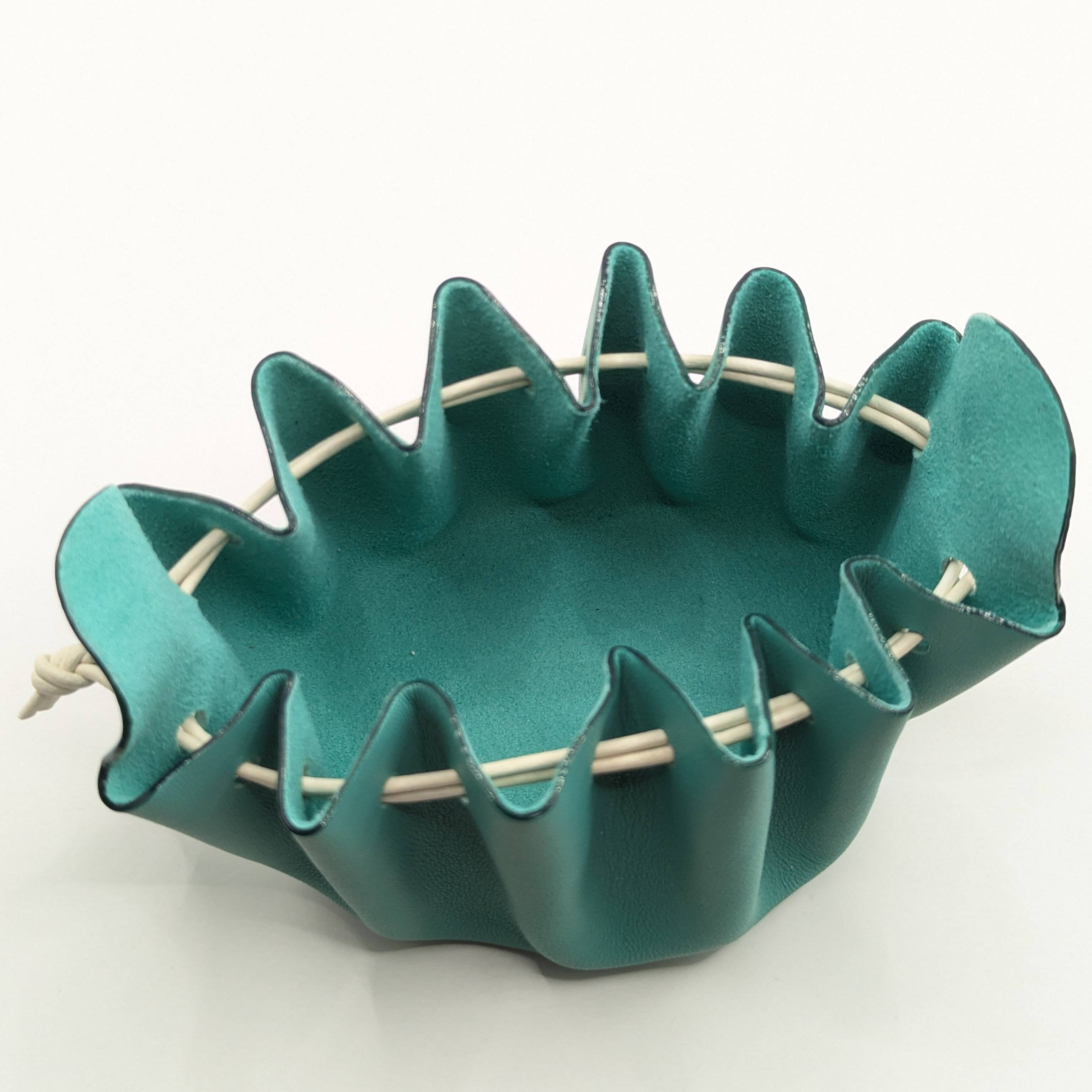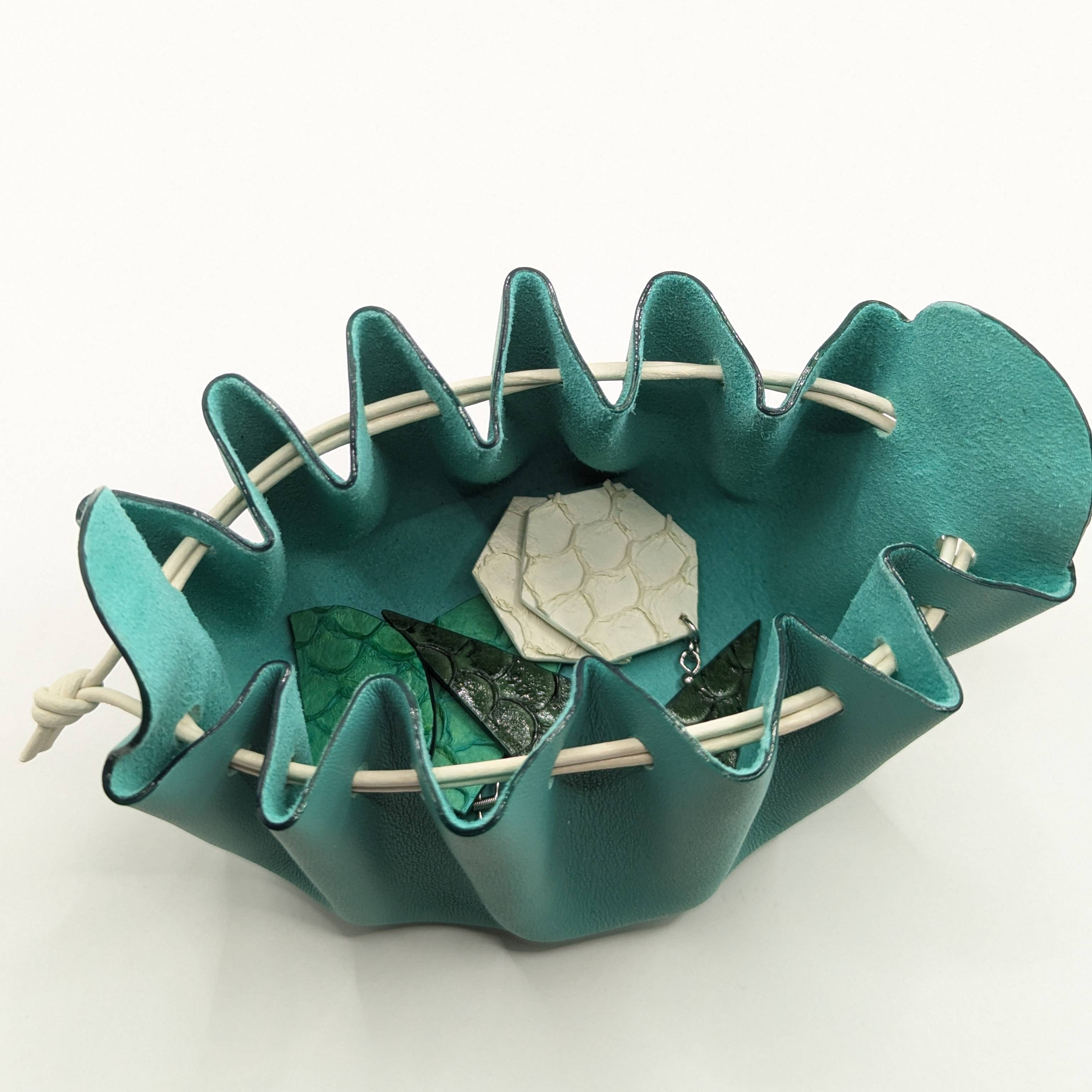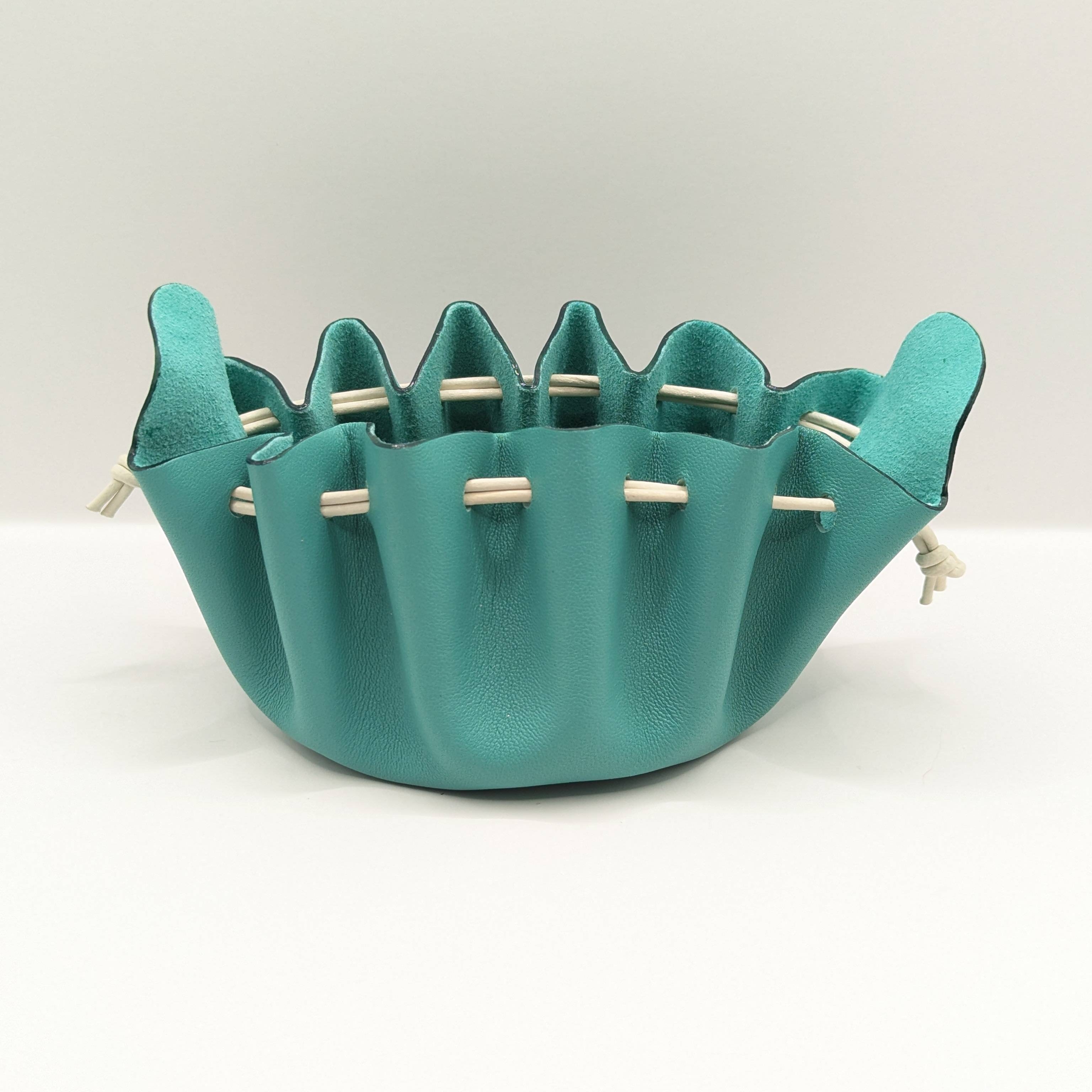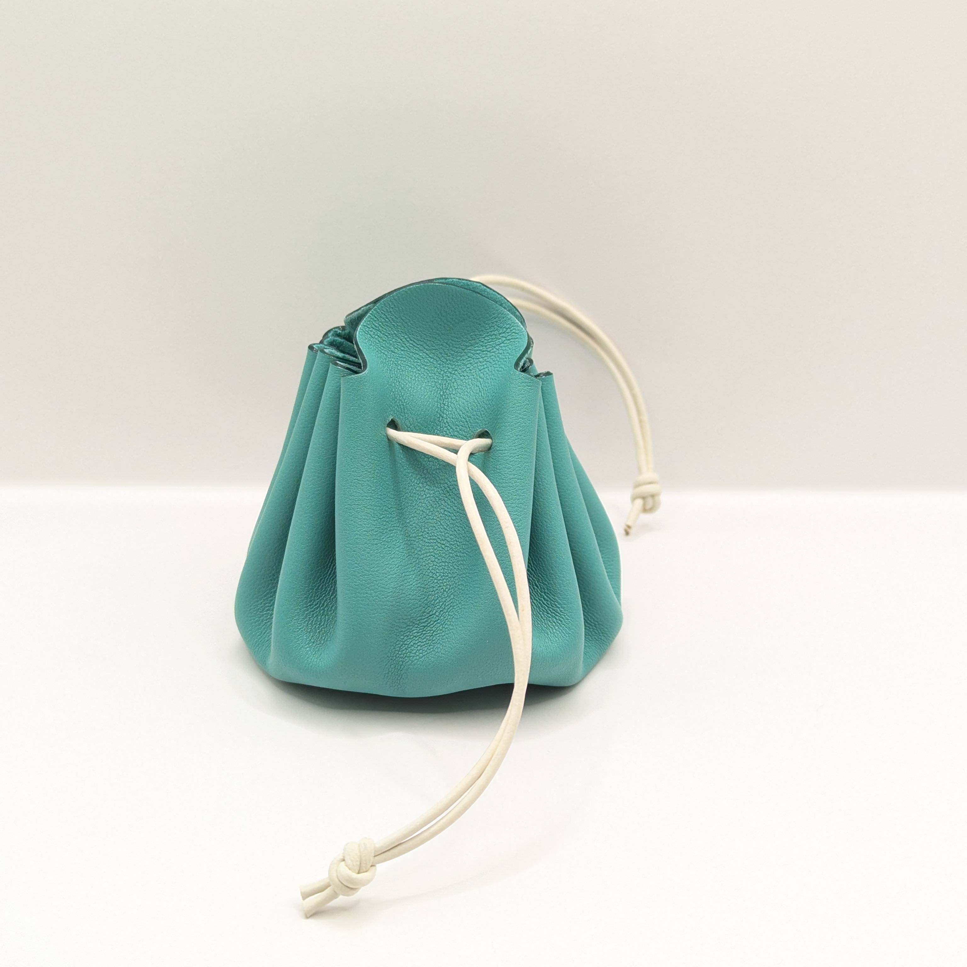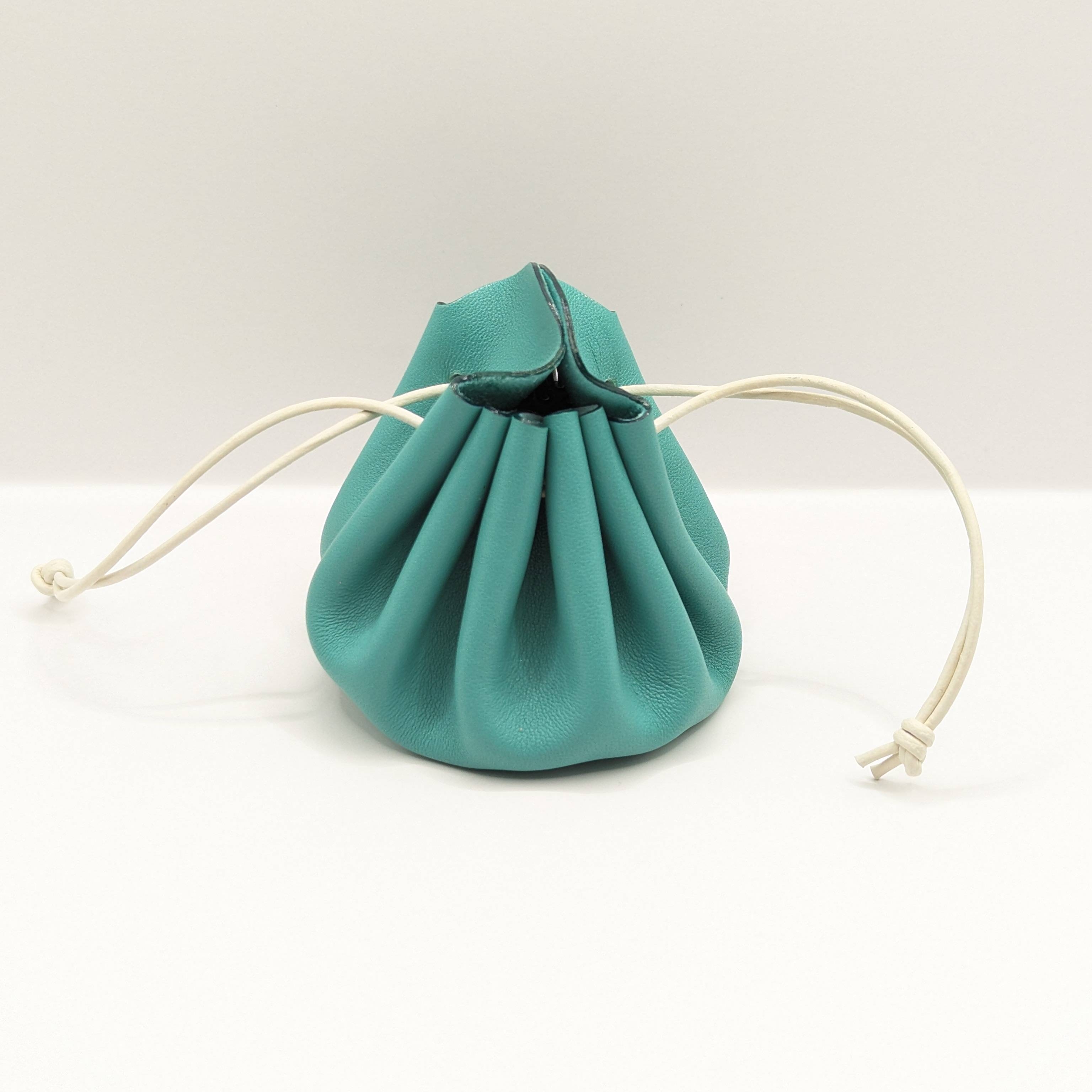 Cette bourse est entièrement réalisée à la main et fabriquée à partir de chutes de cuir d'agneau et le cordon est en cuir de vachette. Elle mesure 8 cm de diamètre et 8 cm de hauteur. Elle s’ouvre simplement en tirant sur les «oreilles» et se ferme en tirant sur les liens. Vous pouvez aussi fermer la bourse en faisant un nœud avec les liens par dessus les «oreilles» pour plus de sécurité. *La couleur réelle peut légèrement varier selon la luminosité et le contraste de votre écran