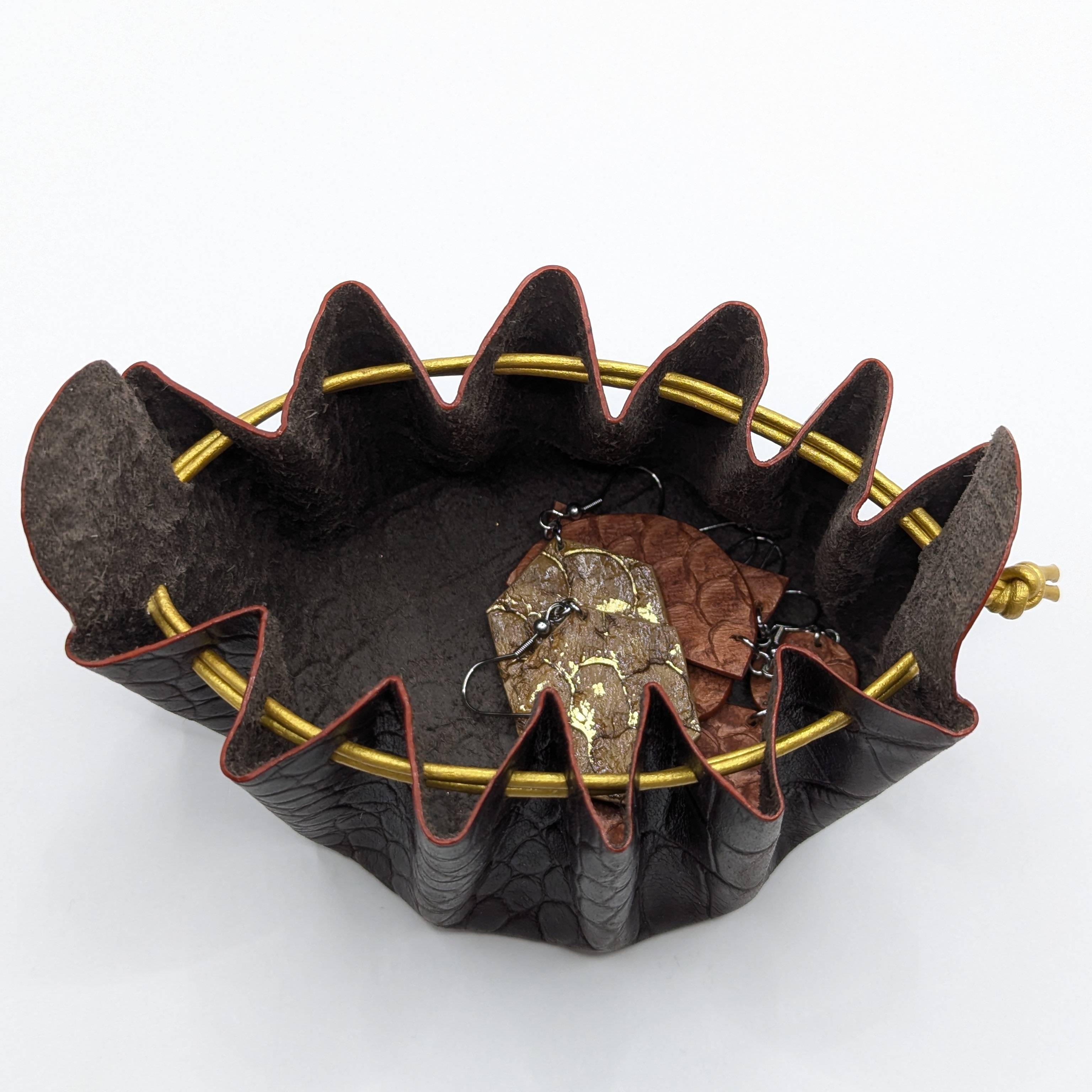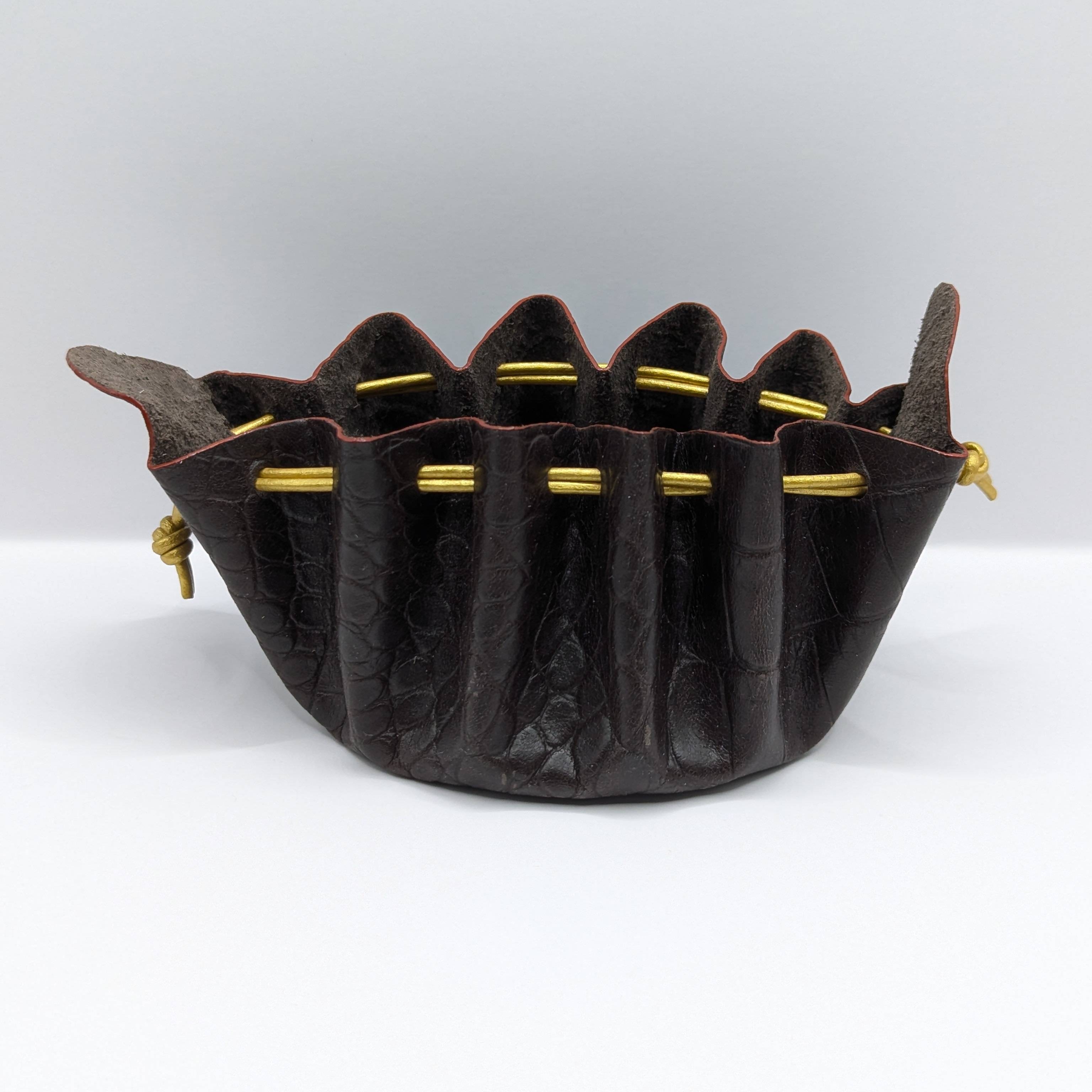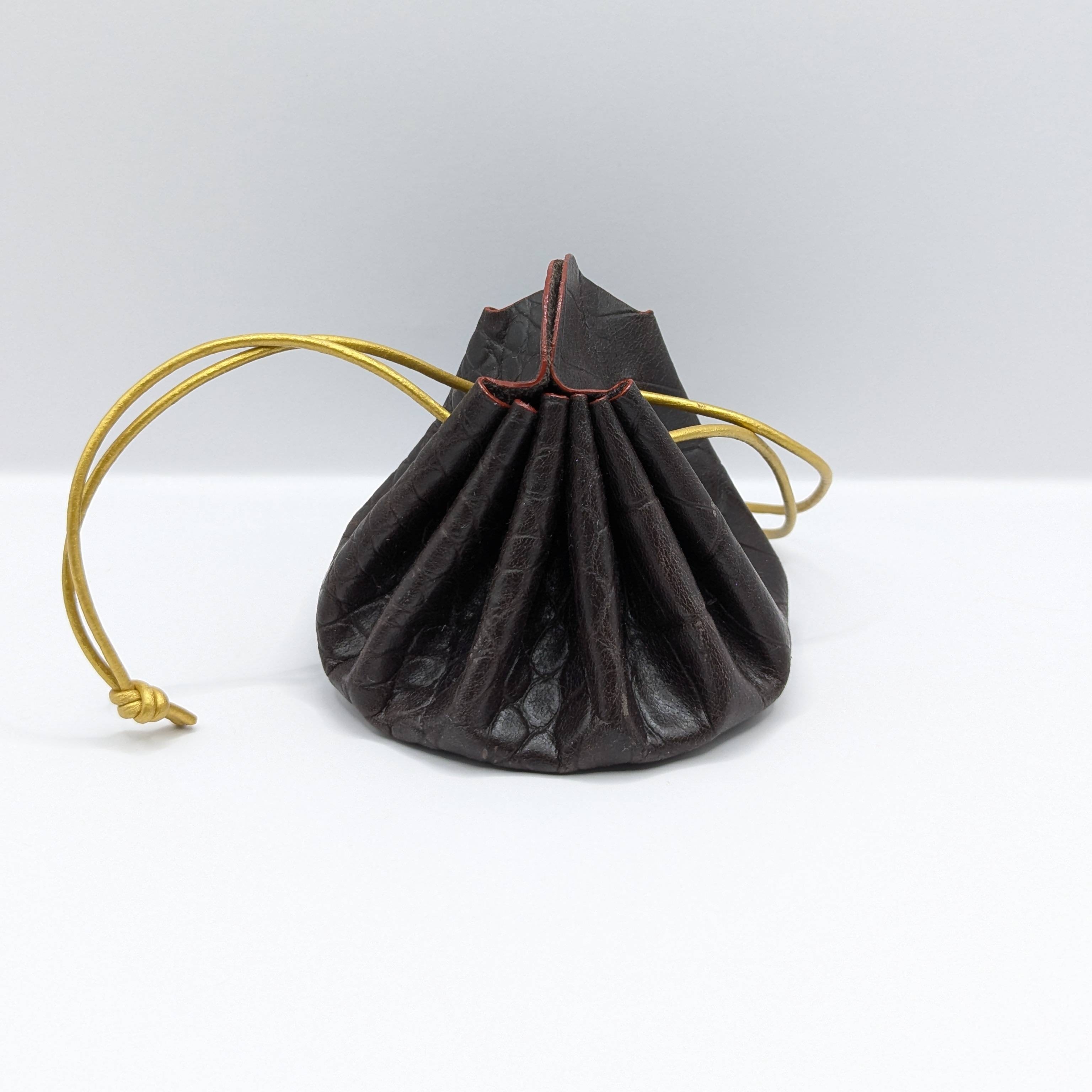 Cette bourse est entièrement réalisée à la main et fabriquée à partir de chutes de cuir d'agneau et le cordon est en cuir de vachette. Elle mesure 8 cm de diamètre et 8 cm de hauteur. Elle s’ouvre simplement en tirant sur les «oreilles» et se ferme en tirant sur les liens. Vous pouvez aussi fermer la bourse en faisant un nœud avec les liens par dessus les «oreilles» pour plus de sécurité. *La couleur réelle peut légèrement varier selon la luminosité et le contraste de votre écran