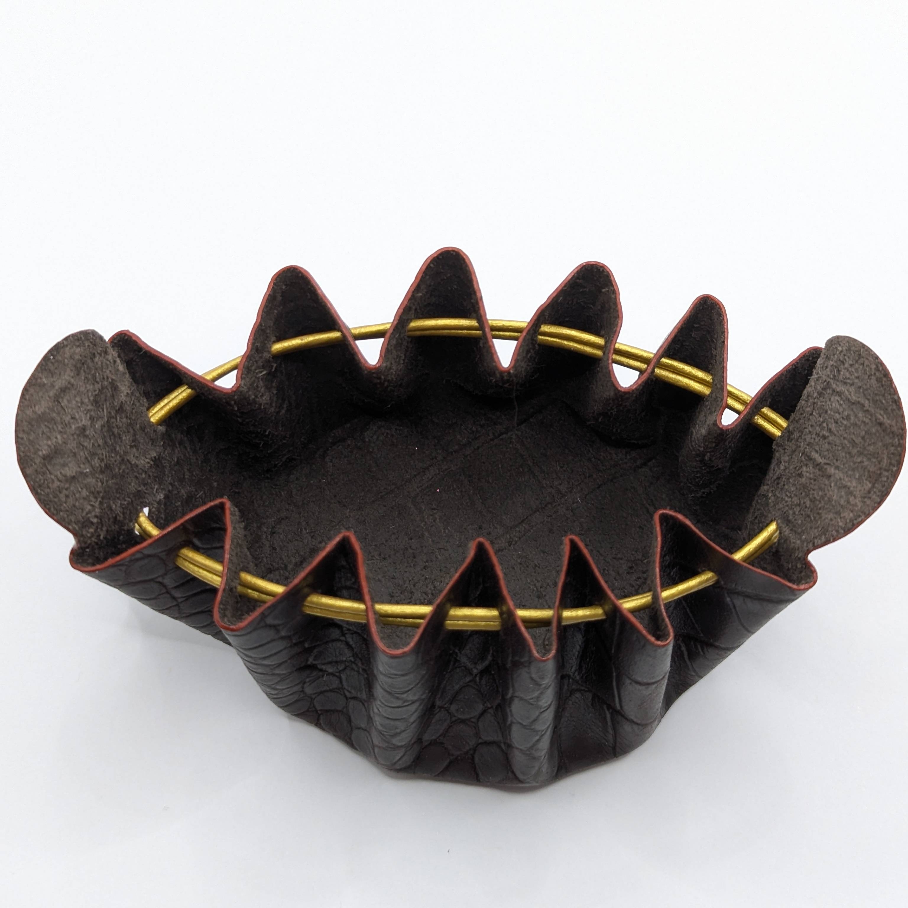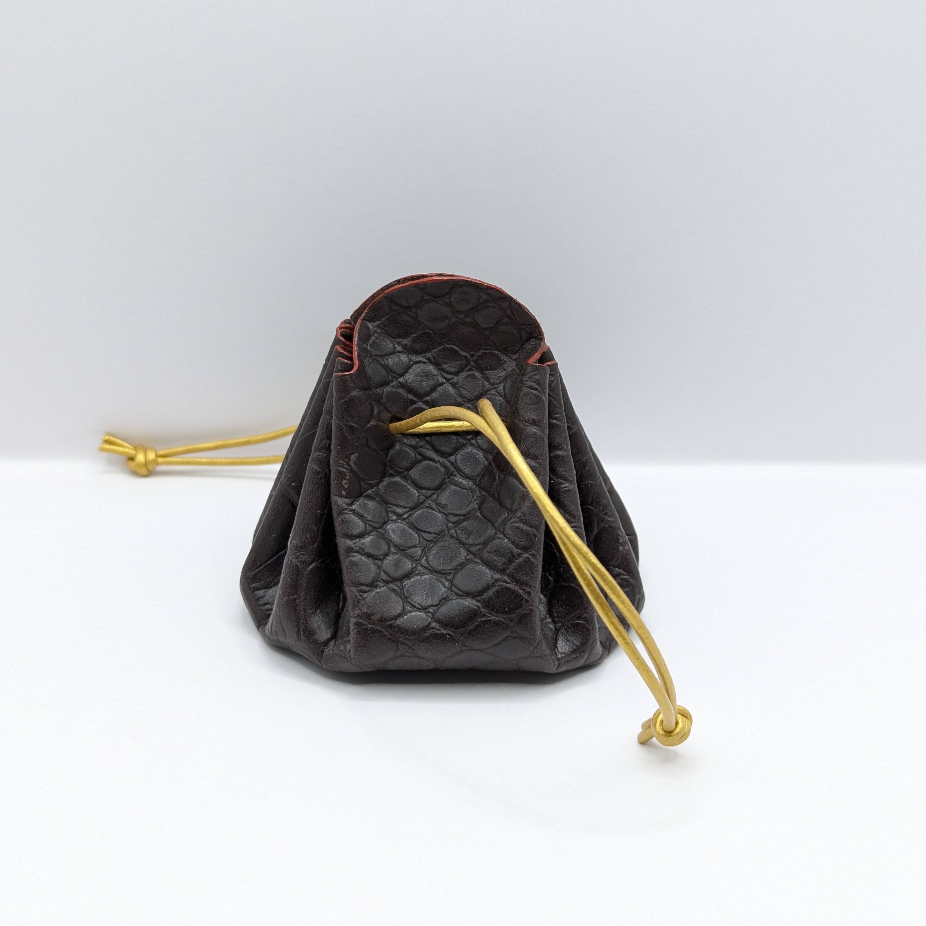 Cette bourse est entièrement réalisée à la main et fabriquée à partir de chutes de cuir de veau et le cordon est en cuir de vachette. Elle mesure 8 cm de diamètre et 8 cm de hauteur. Elle s’ouvre simplement en tirant sur les «oreilles» et se ferme en tirant sur les liens. Vous pouvez aussi fermer la bourse en faisant un nœud avec les liens par dessus les «oreilles» pour plus de sécurité. *La couleur réelle peut légèrement varier selon la luminosité et le contraste de votre écran