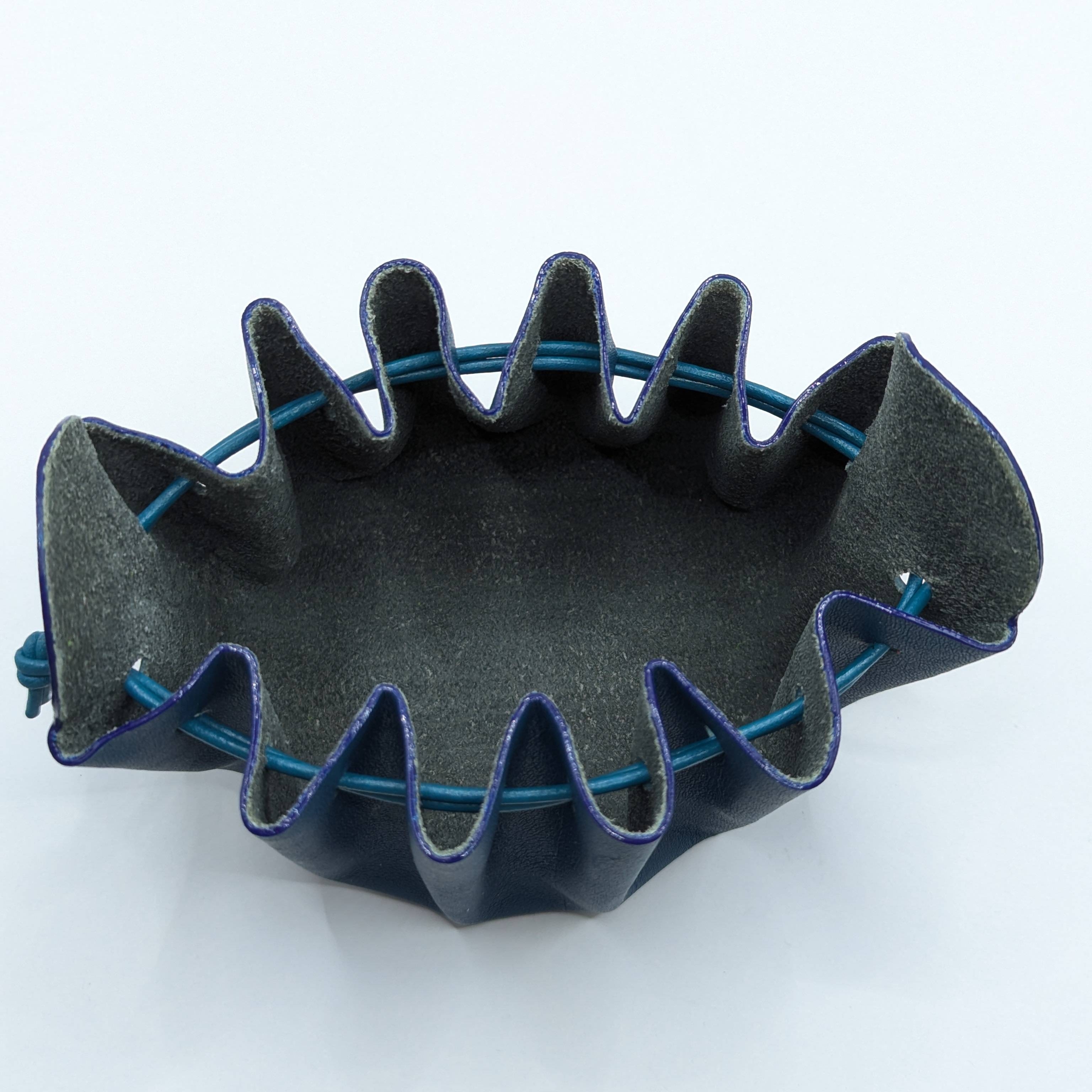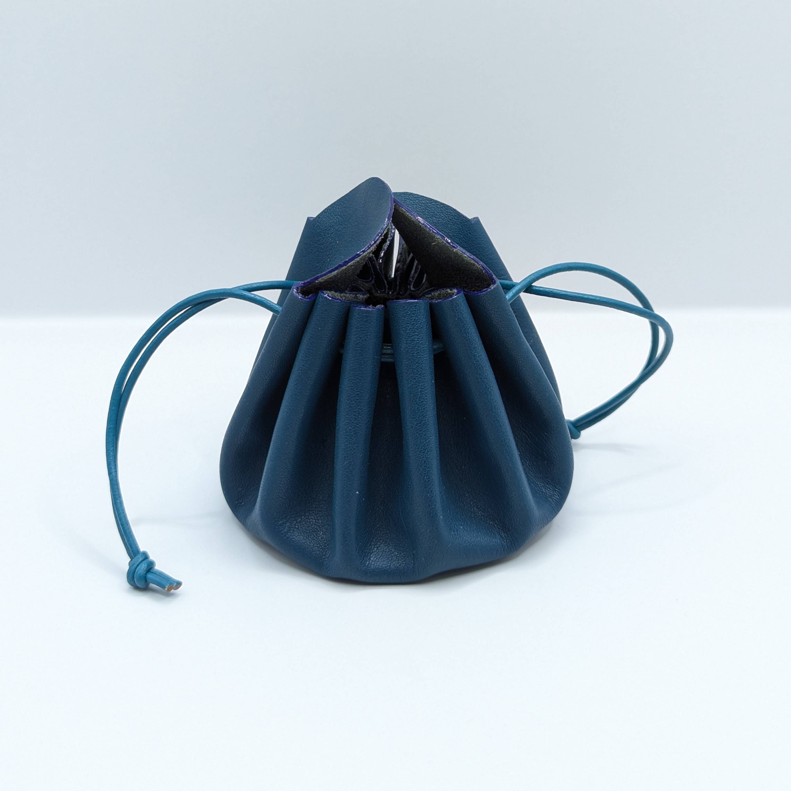 Cette bourse est entièrement réalisée à la main et fabriquée à partir de chutes de cuir d'agneau et le cordon est en cuir de vachette. Elle mesure 8 cm de diamètre et 8 cm de hauteur. Elle s’ouvre simplement en tirant sur les «oreilles» et se ferme en tirant sur les liens. Vous pouvez aussi fermer la bourse en faisant un nœud avec les liens par dessus les «oreilles» pour plus de sécurité. *La couleur réelle peut légèrement varier selon la luminosité et le contraste de votre écran