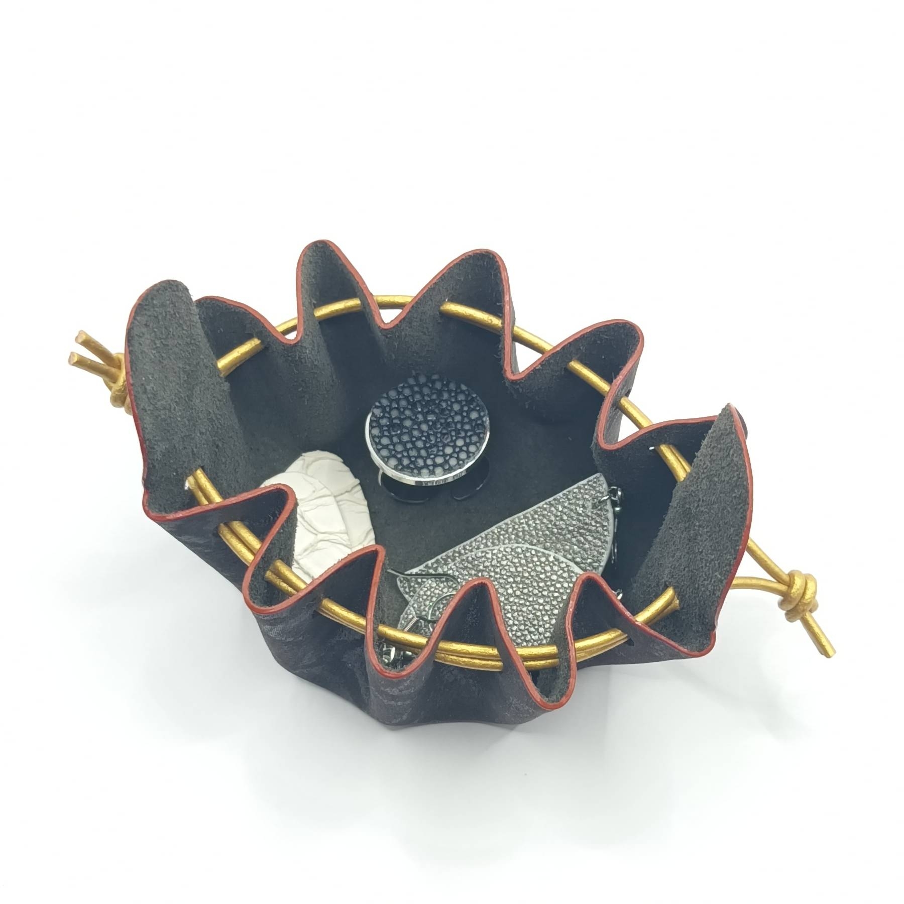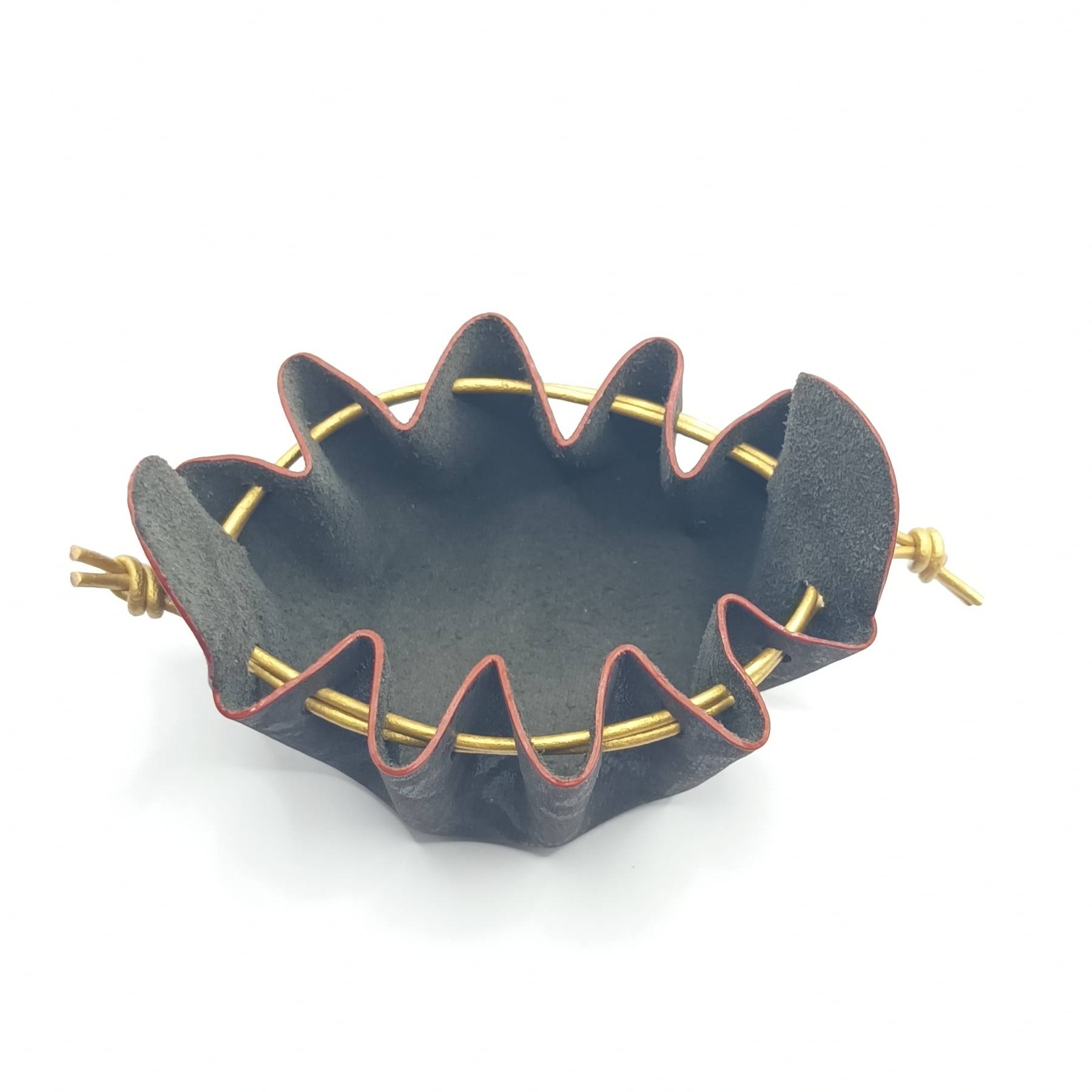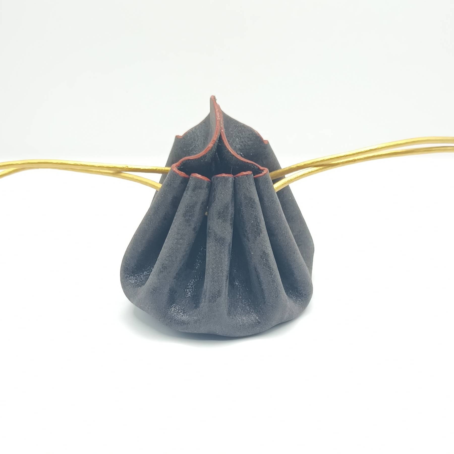 Cette bourse est entièrement réalisée à la main et fabriquée à partir de chutes de cuir d'agneau et le cordon est en cuir de vachette. Elle mesure 6 cm de diamètre et 6 cm de hauteur. Elle s’ouvre simplement en tirant sur les «oreilles» et se ferme en tirant sur les liens. Vous pouvez aussi fermer la bourse en faisant un nœud avec les liens par dessus les «oreilles» pour plus de sécurité. *La couleur réelle peut légèrement varier selon la luminosité et le contraste de votre écran