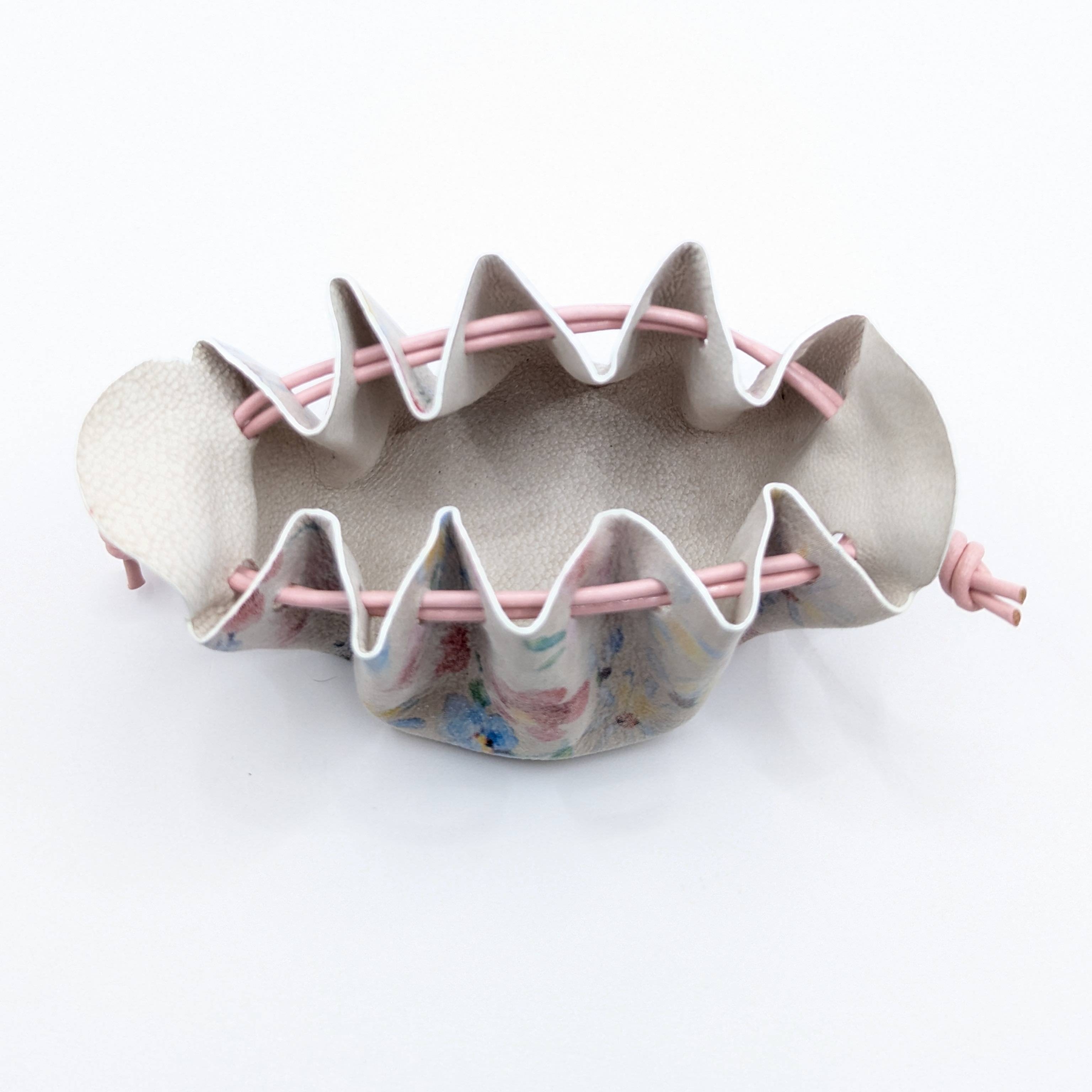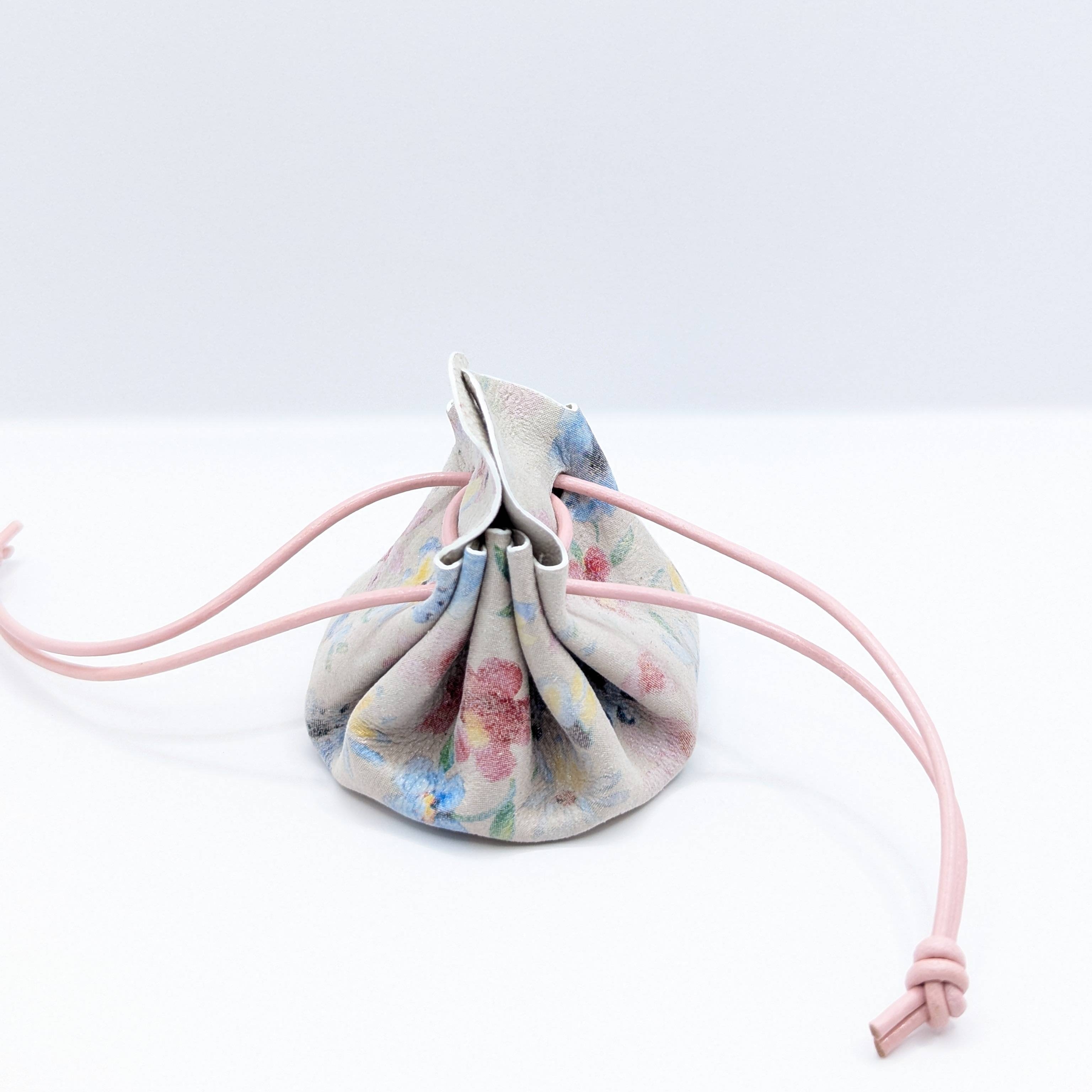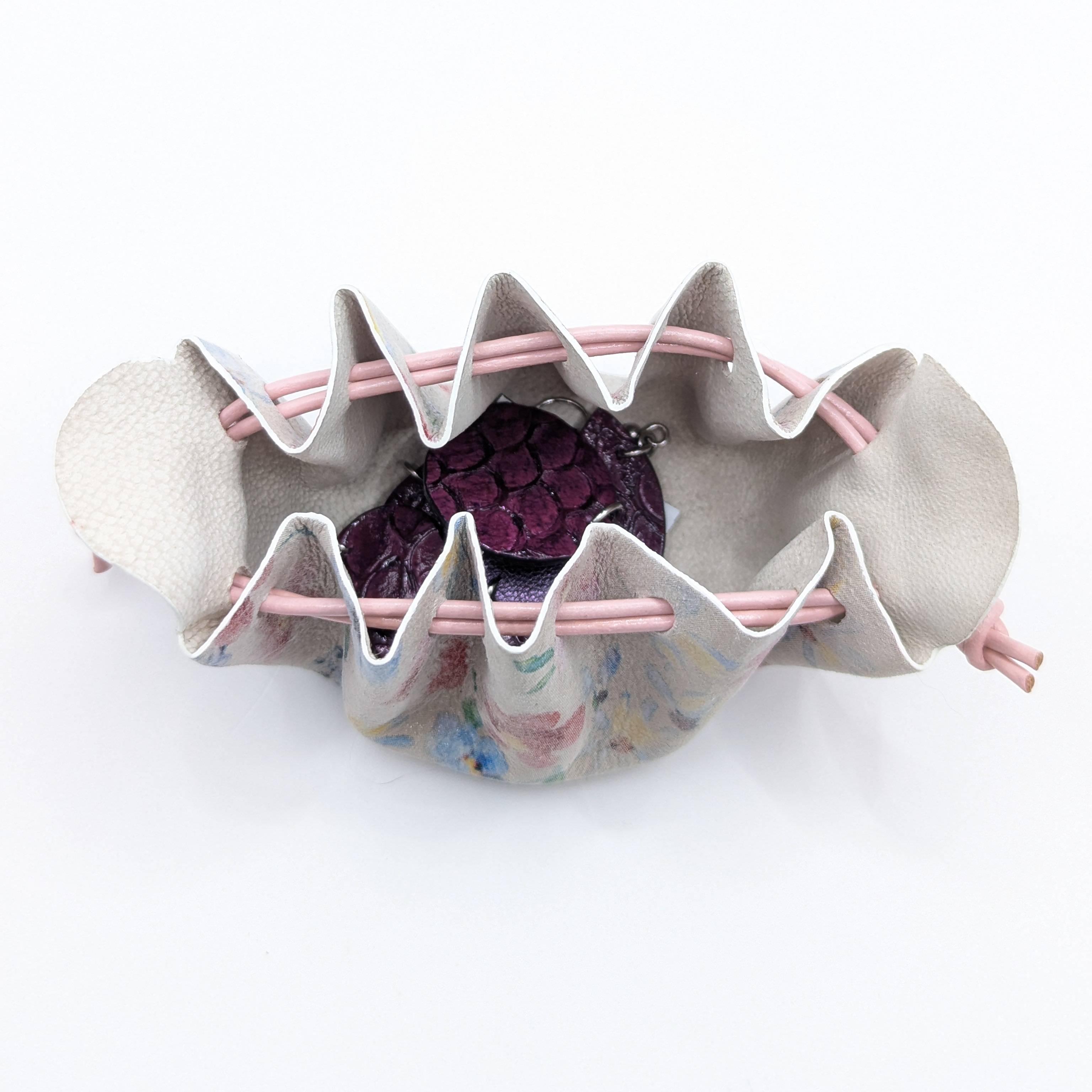 Cette bourse est entièrement réalisée à la main et fabriquée à partir de chutes de cuir d'agneau et le cordon est en cuir de vachette. Elle mesure 6 cm de diamètre et 6 cm de hauteur. Elle s’ouvre simplement en tirant sur les «oreilles» et se ferme en tirant sur les liens. Vous pouvez aussi fermer la bourse en faisant un nœud avec les liens par dessus les «oreilles» pour plus de sécurité. *La couleur réelle peut légèrement varier selon la luminosité et le contraste de votre écran