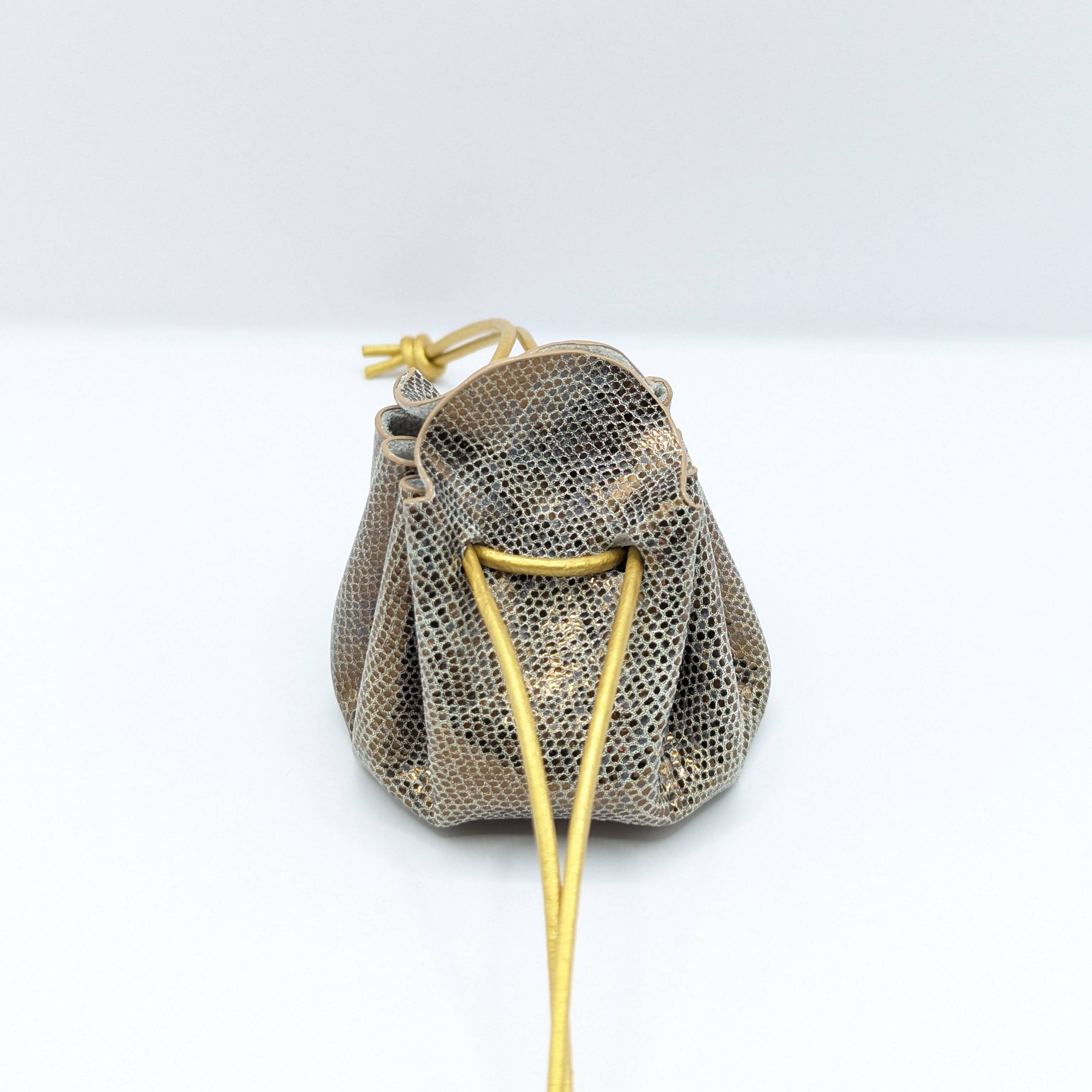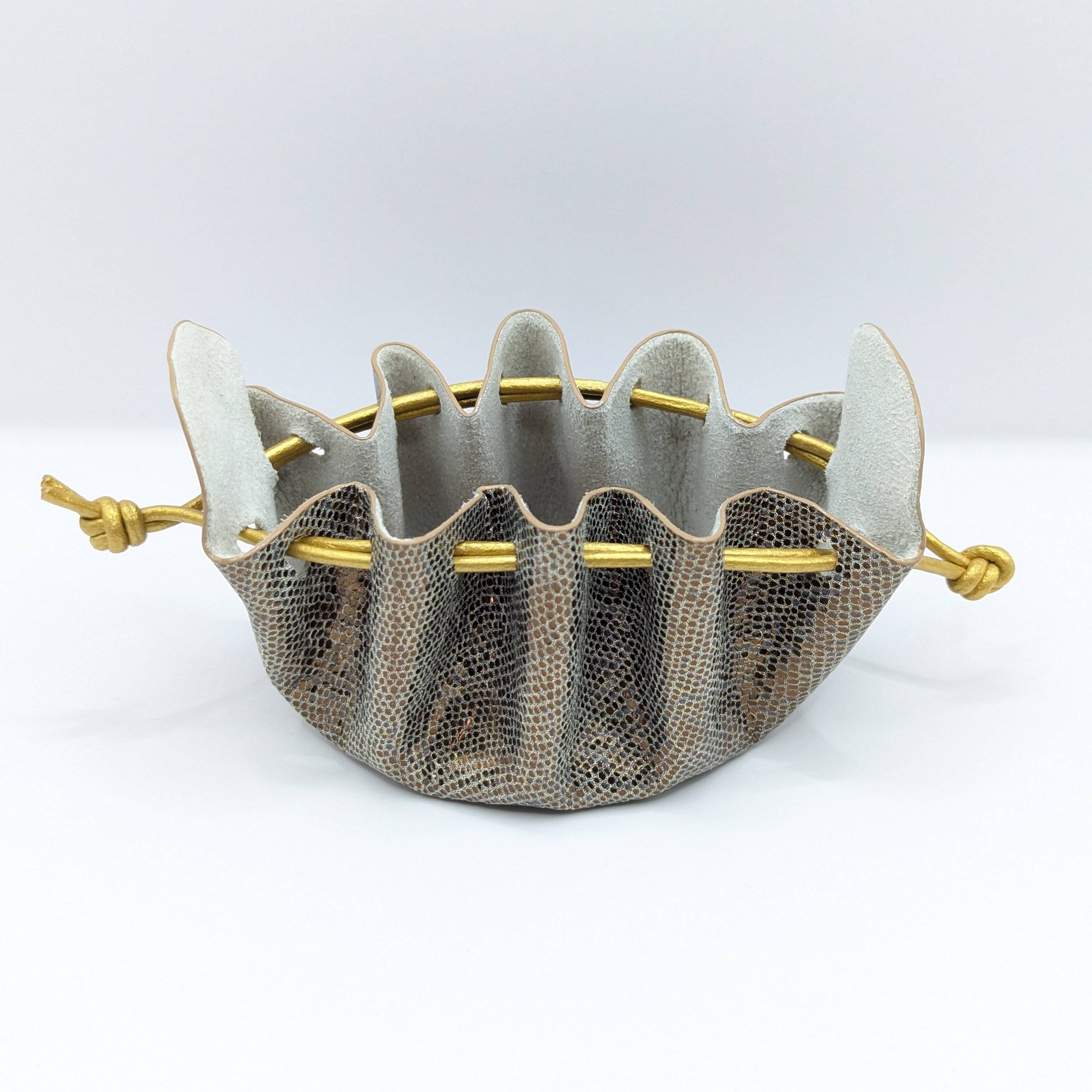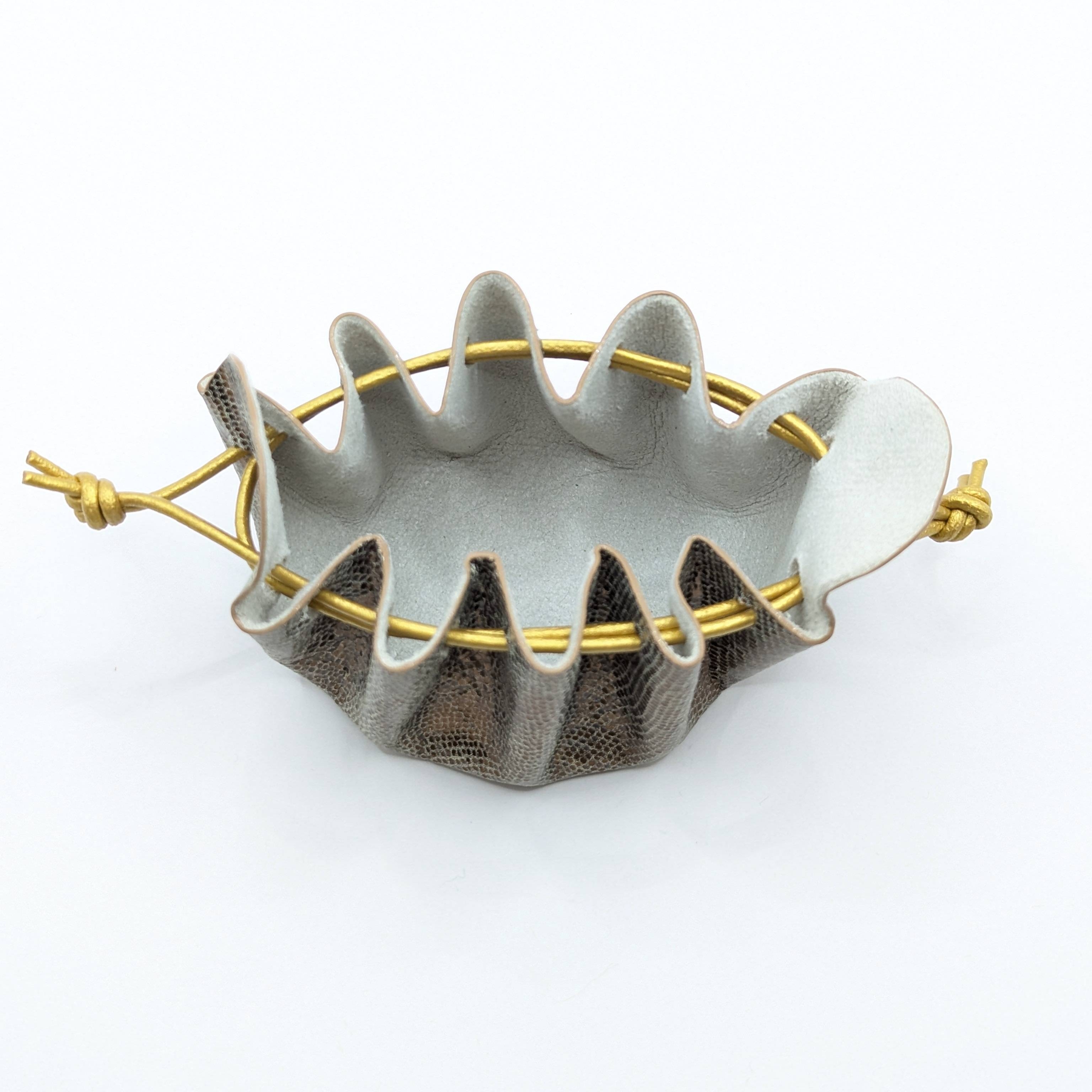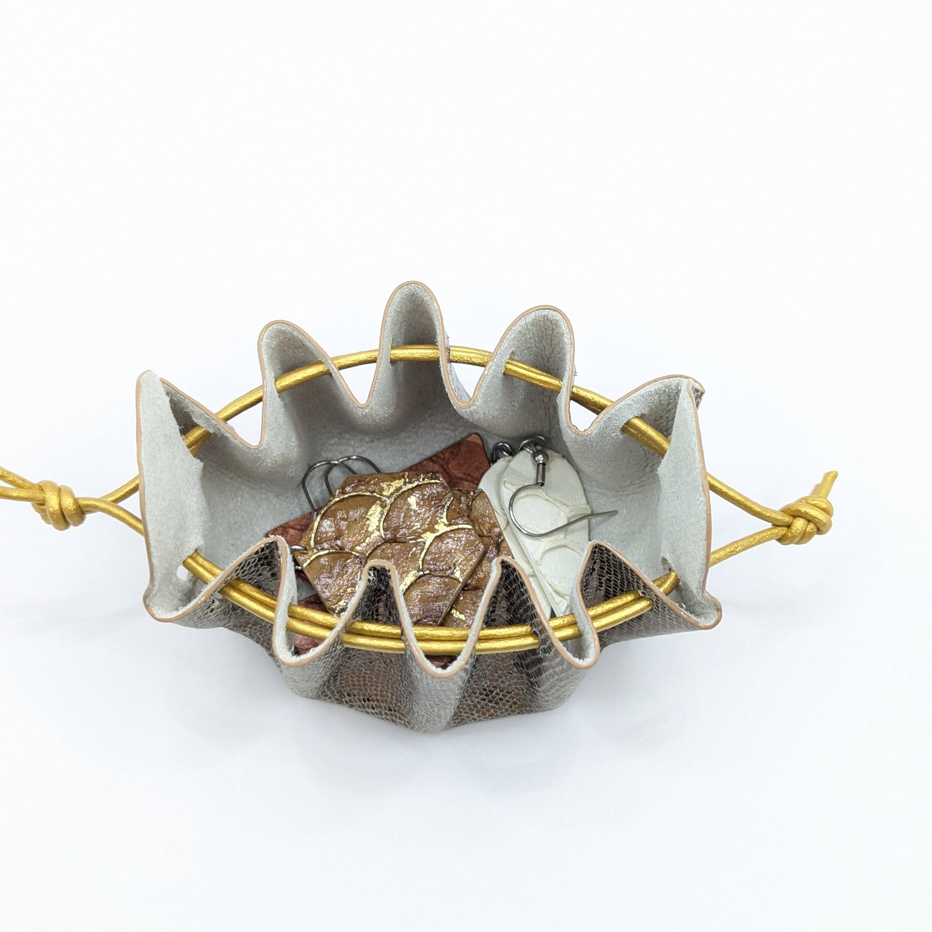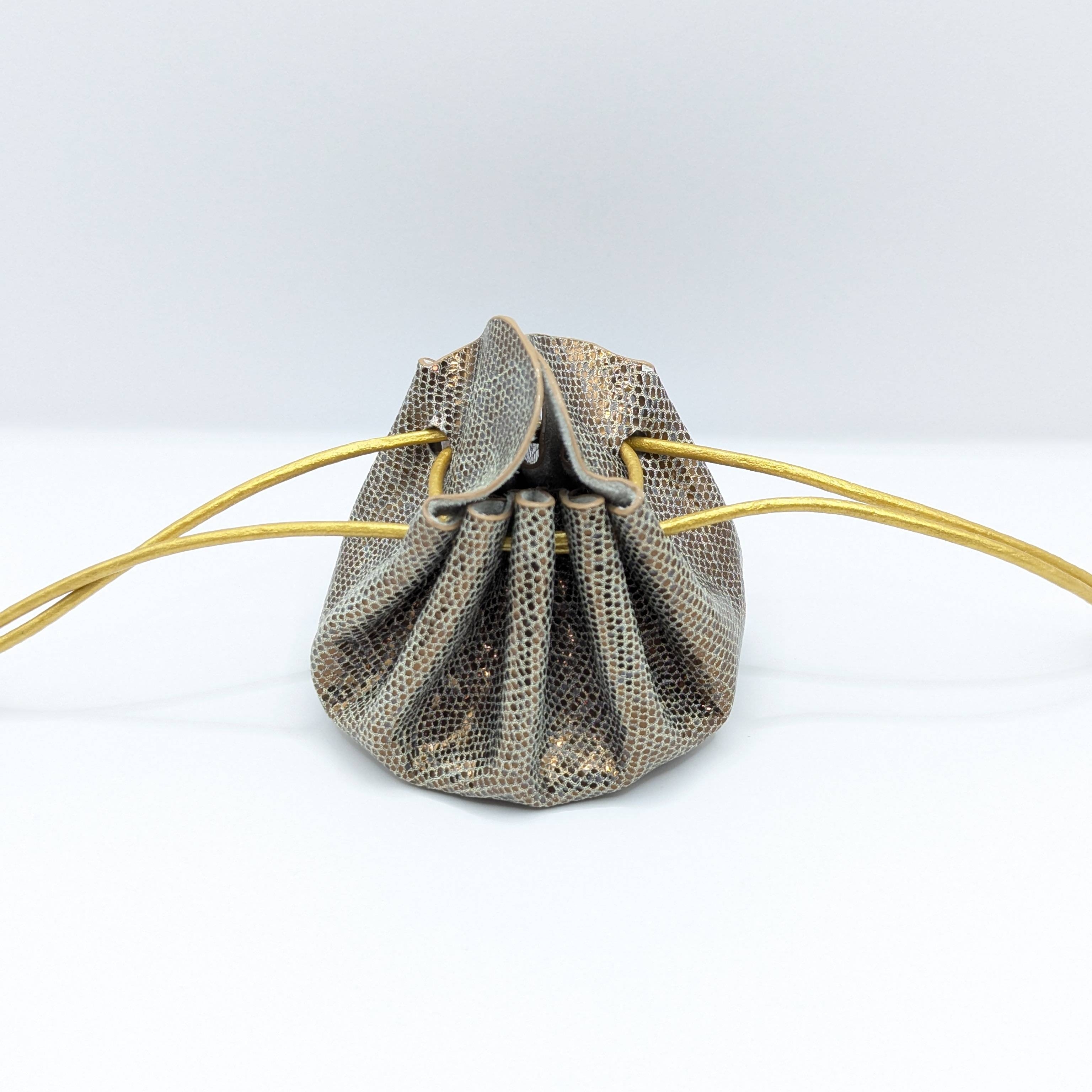 Cette bourse est entièrement réalisée à la main et fabriquée à partir de chutes de cuir d'agneau et le cordon est en cuir de vachette. Elle mesure 6 cm de diamètre et 6 cm de hauteur. Elle s’ouvre simplement en tirant sur les «oreilles» et se ferme en tirant sur les liens. Vous pouvez aussi fermer la bourse en faisant un nœud avec les liens par dessus les «oreilles» pour plus de sécurité. *La couleur réelle peut légèrement varier selon la luminosité et le contraste de votre écran