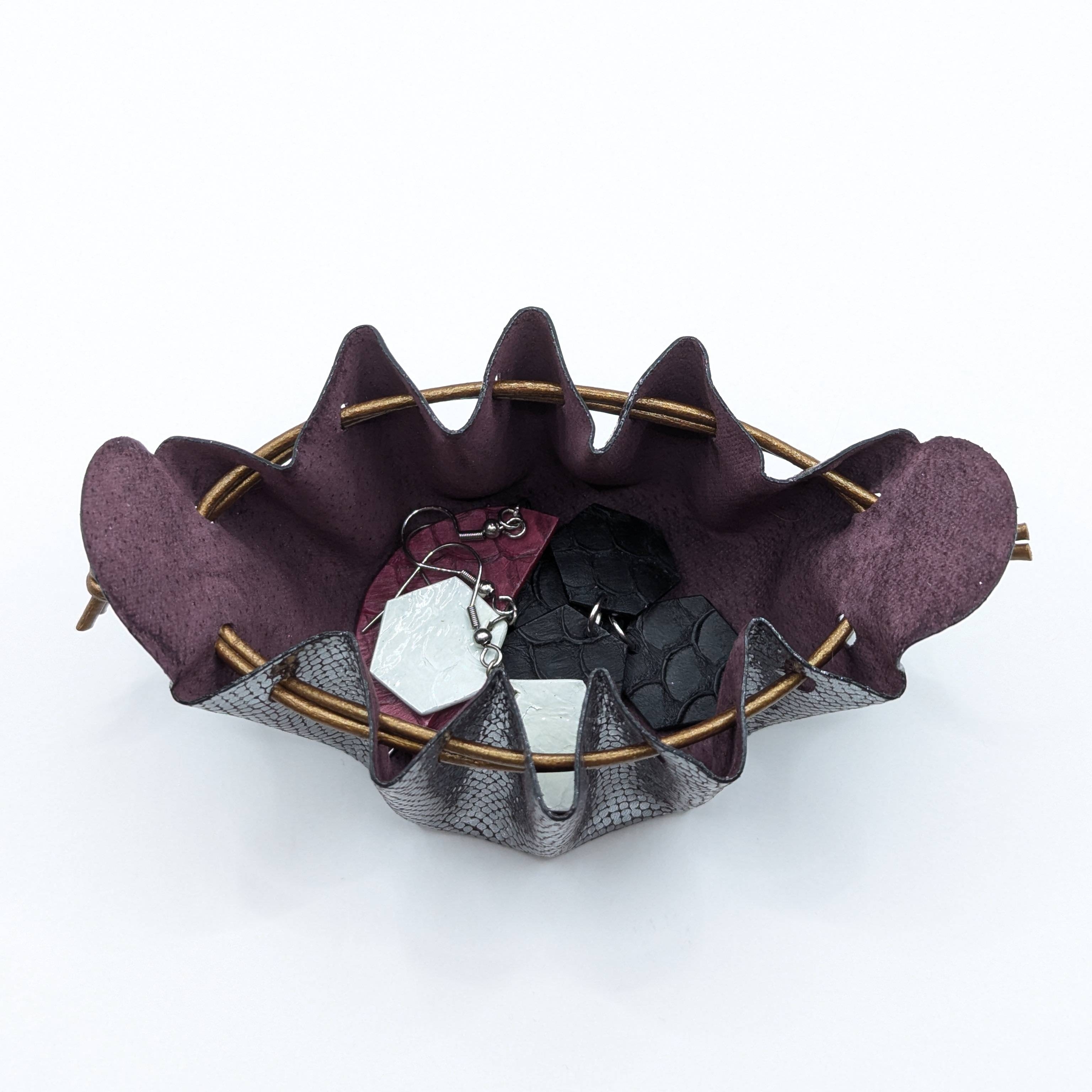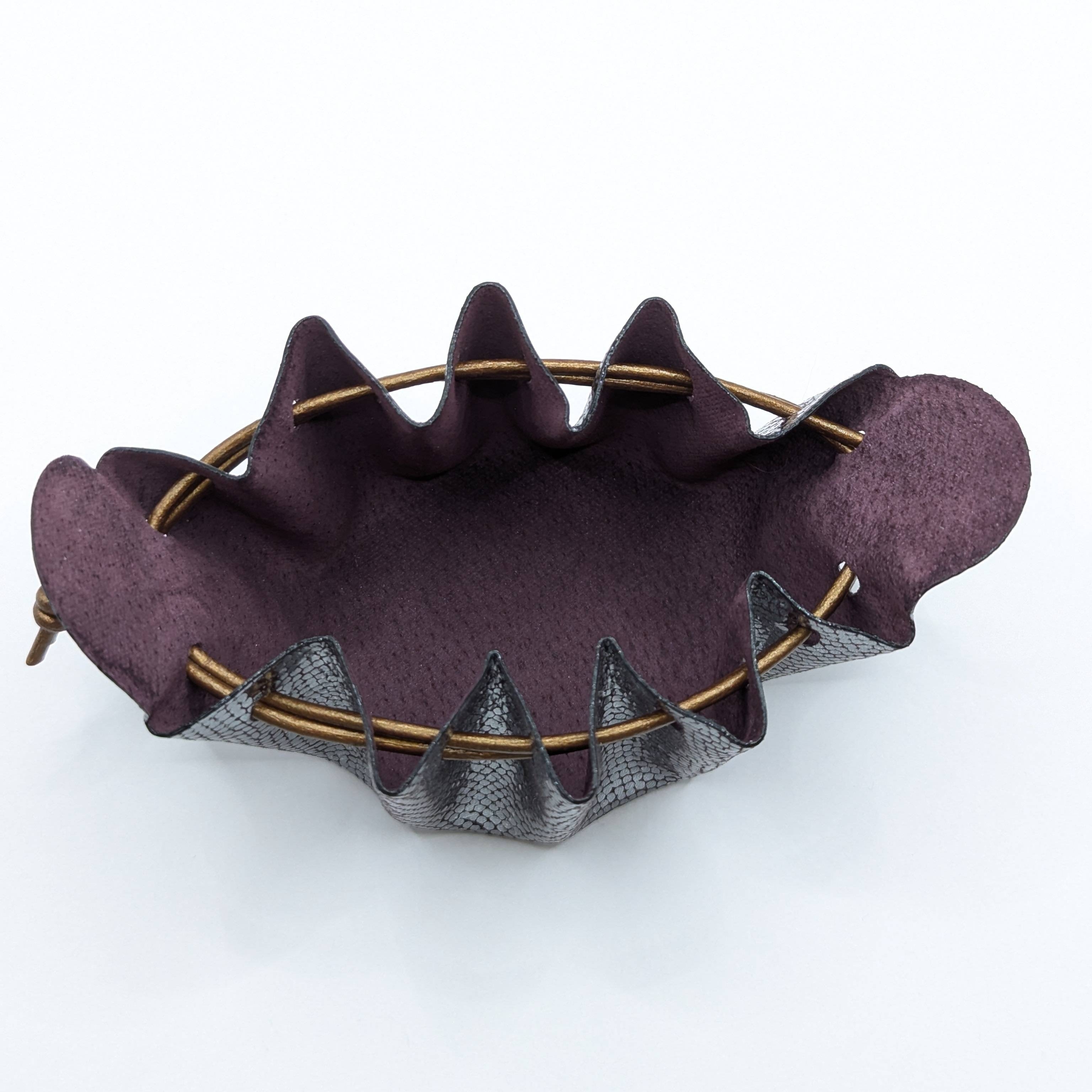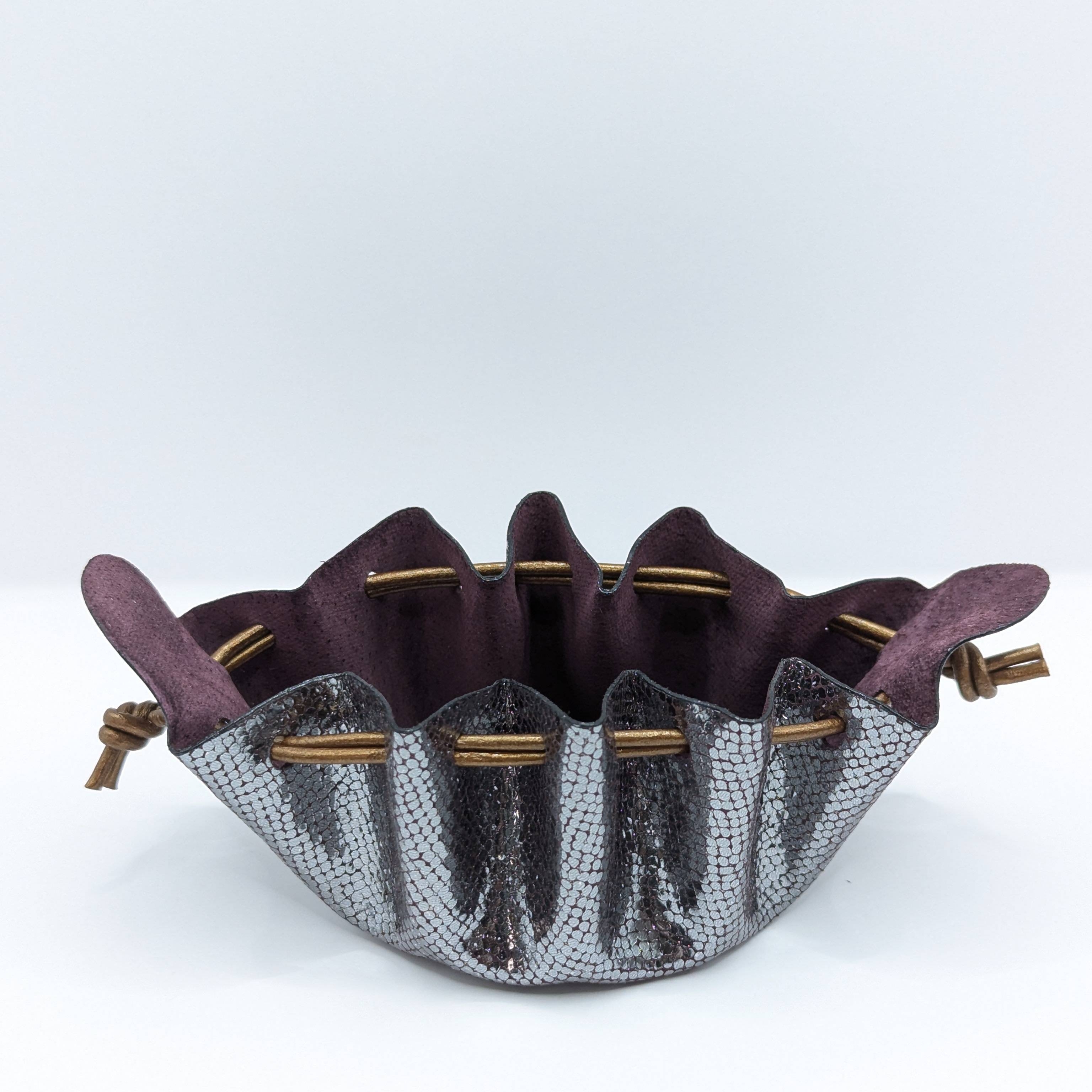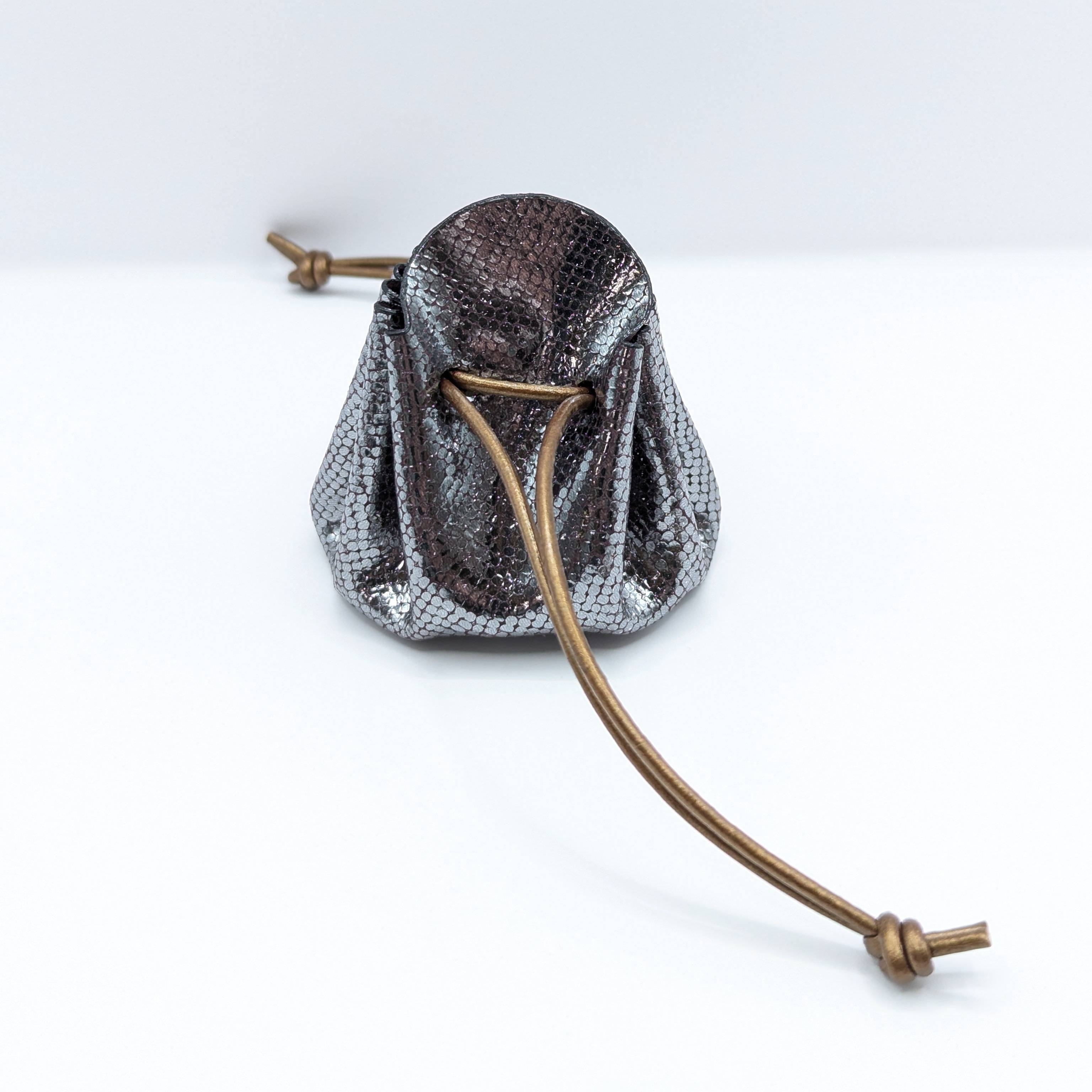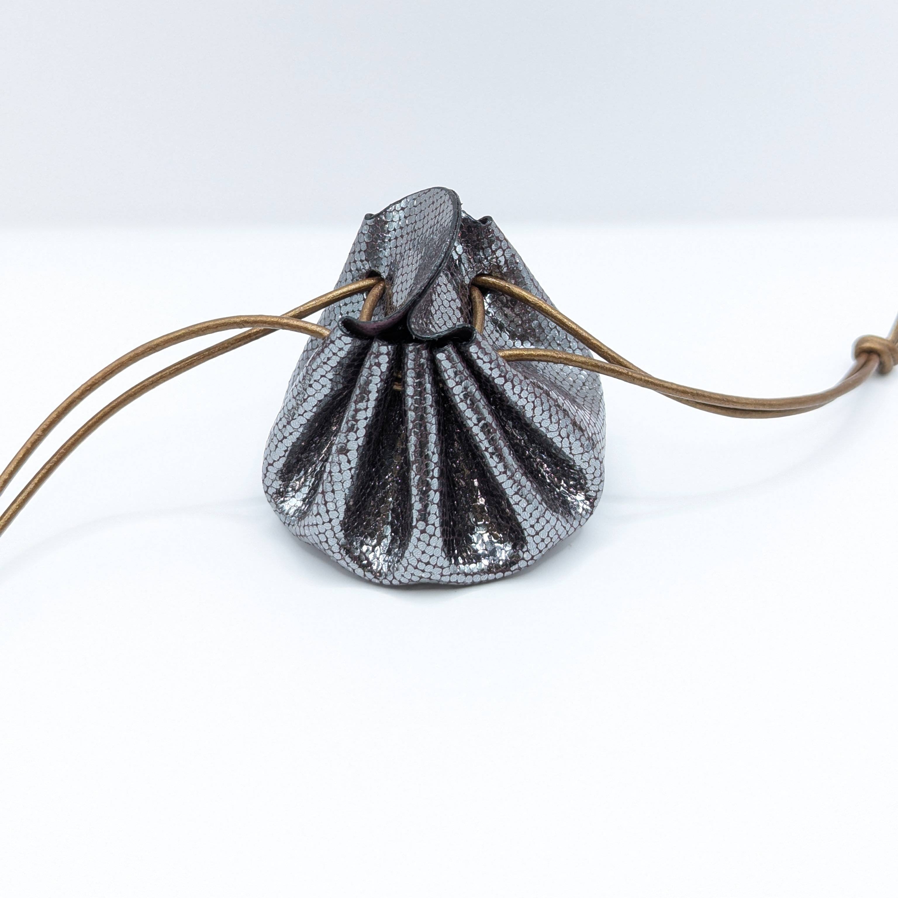 Cette bourse est entièrement réalisée à la main et fabriquée à partir de chutes de cuir d'agneau et le cordon est en cuir de vachette. Elle mesure 6 cm de diamètre et 6 cm de hauteur. Elle s’ouvre simplement en tirant sur les «oreilles» et se ferme en tirant sur les liens. Vous pouvez aussi fermer la bourse en faisant un nœud avec les liens par dessus les «oreilles» pour plus de sécurité. *La couleur réelle peut légèrement varier selon la luminosité et le contraste de votre écran